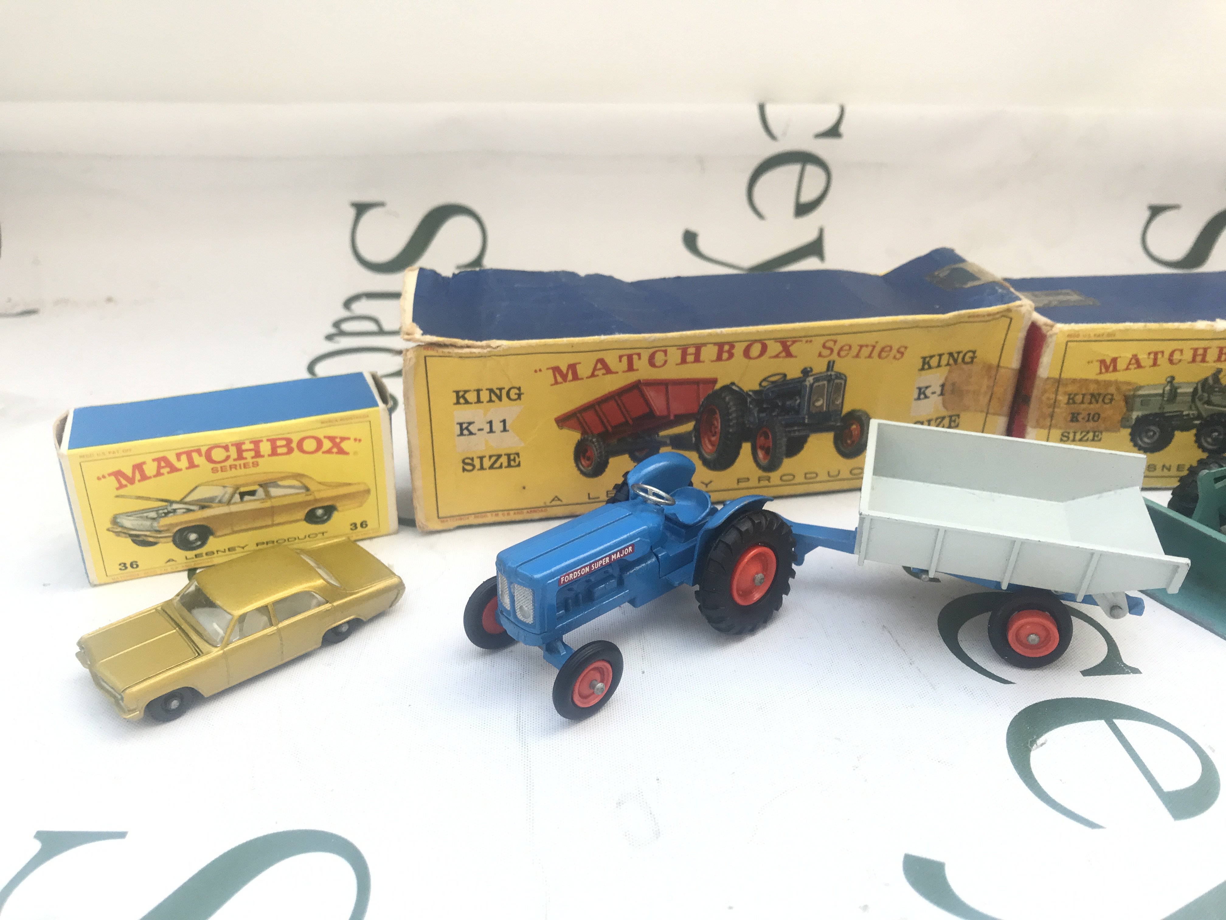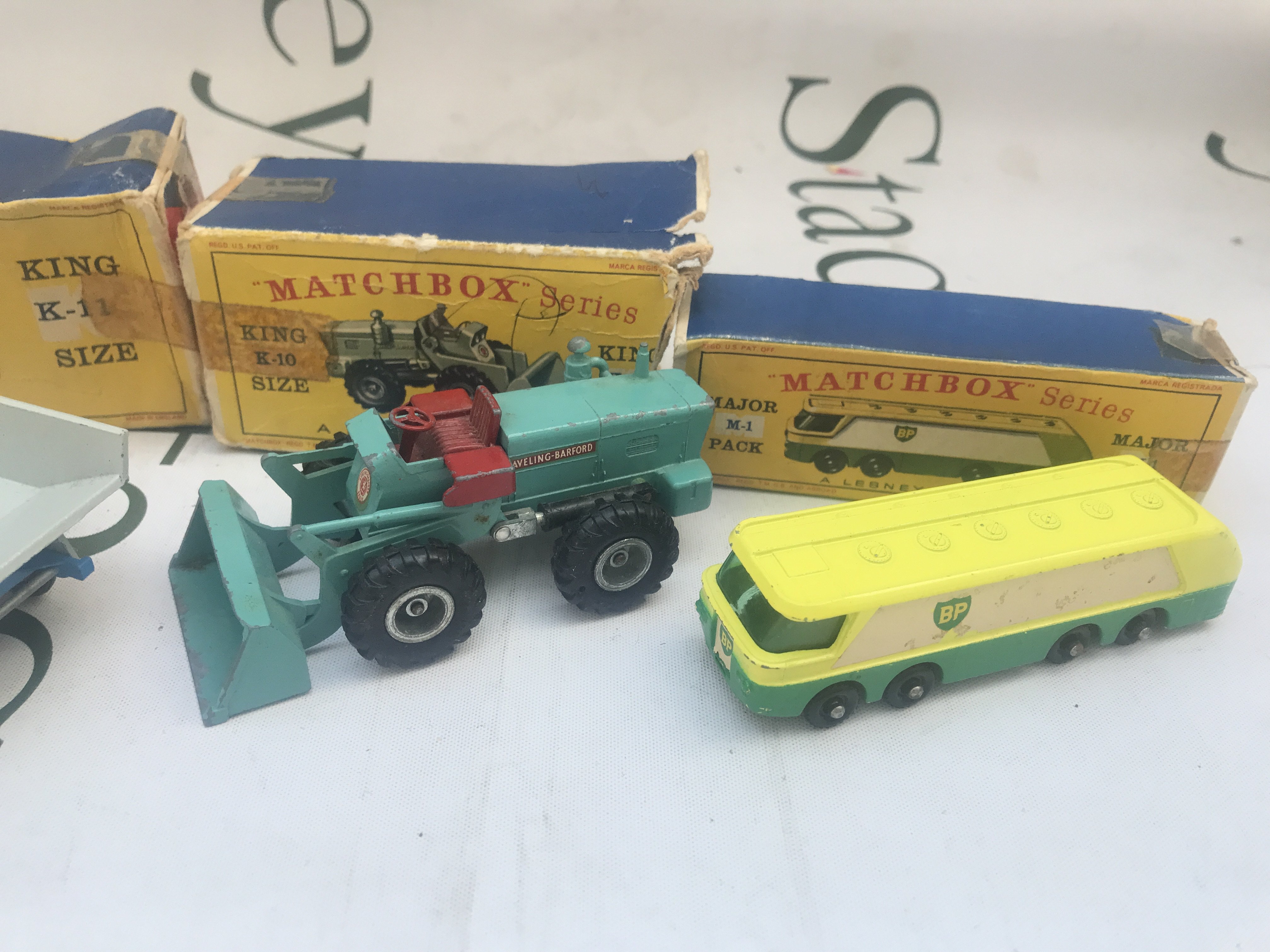 A Collection Of 4 Matchbox Vehicles. A Opel Diplomat #36 A Fordson Tractor and Trailer K-11. A Tractor Shovel #K-10 And A BP Petrol Tanker #M-1. Boxes Are Worn.