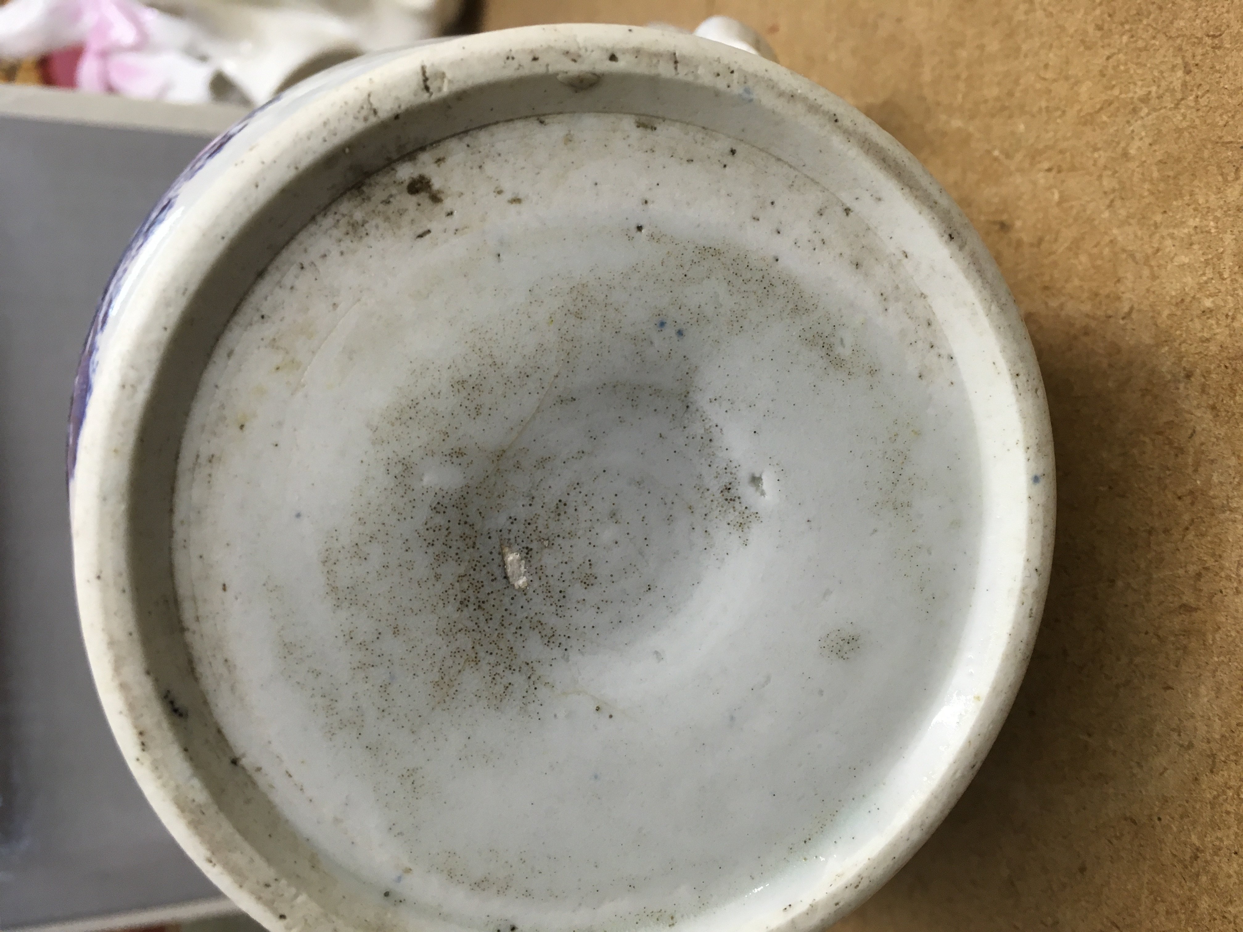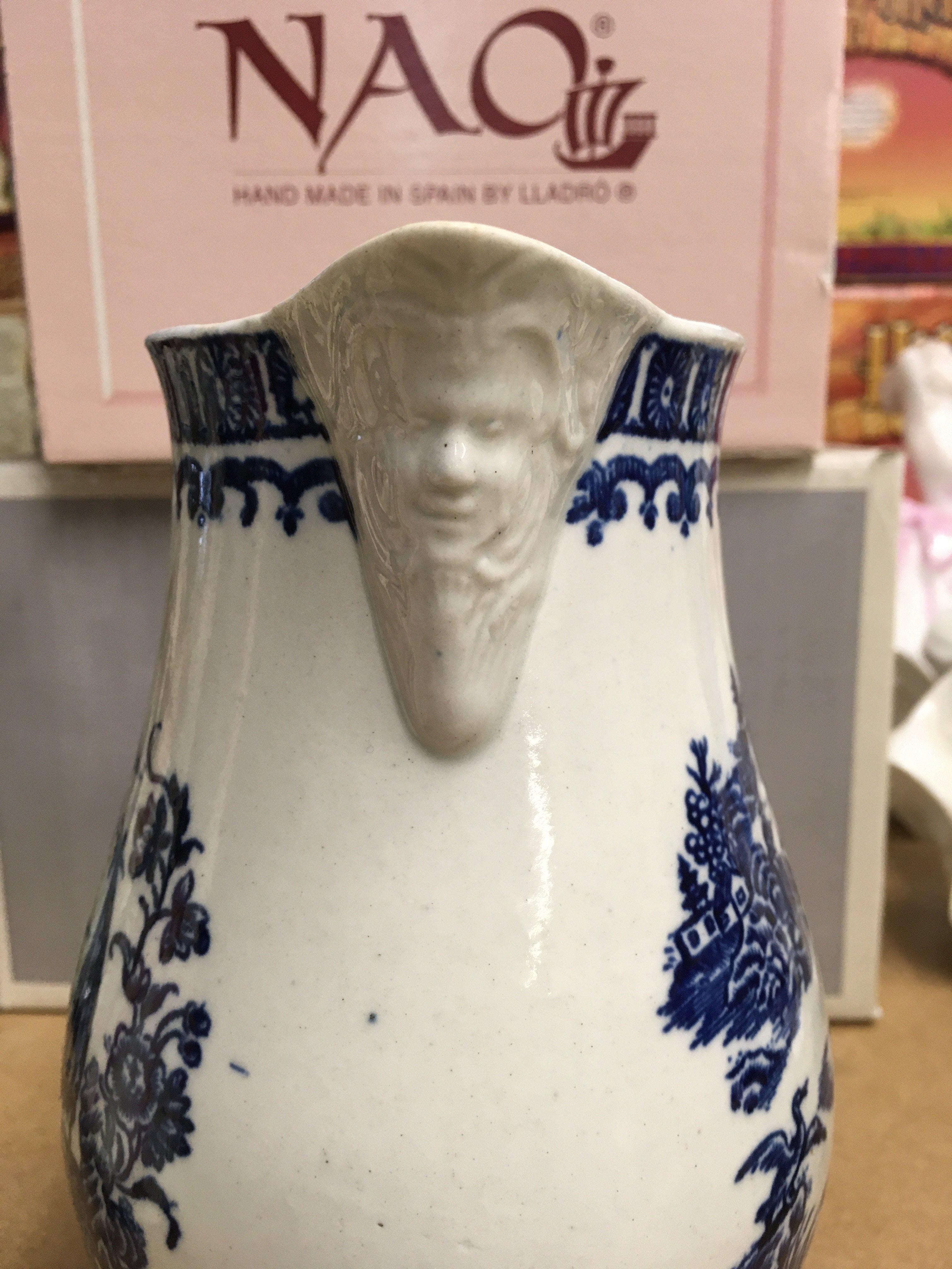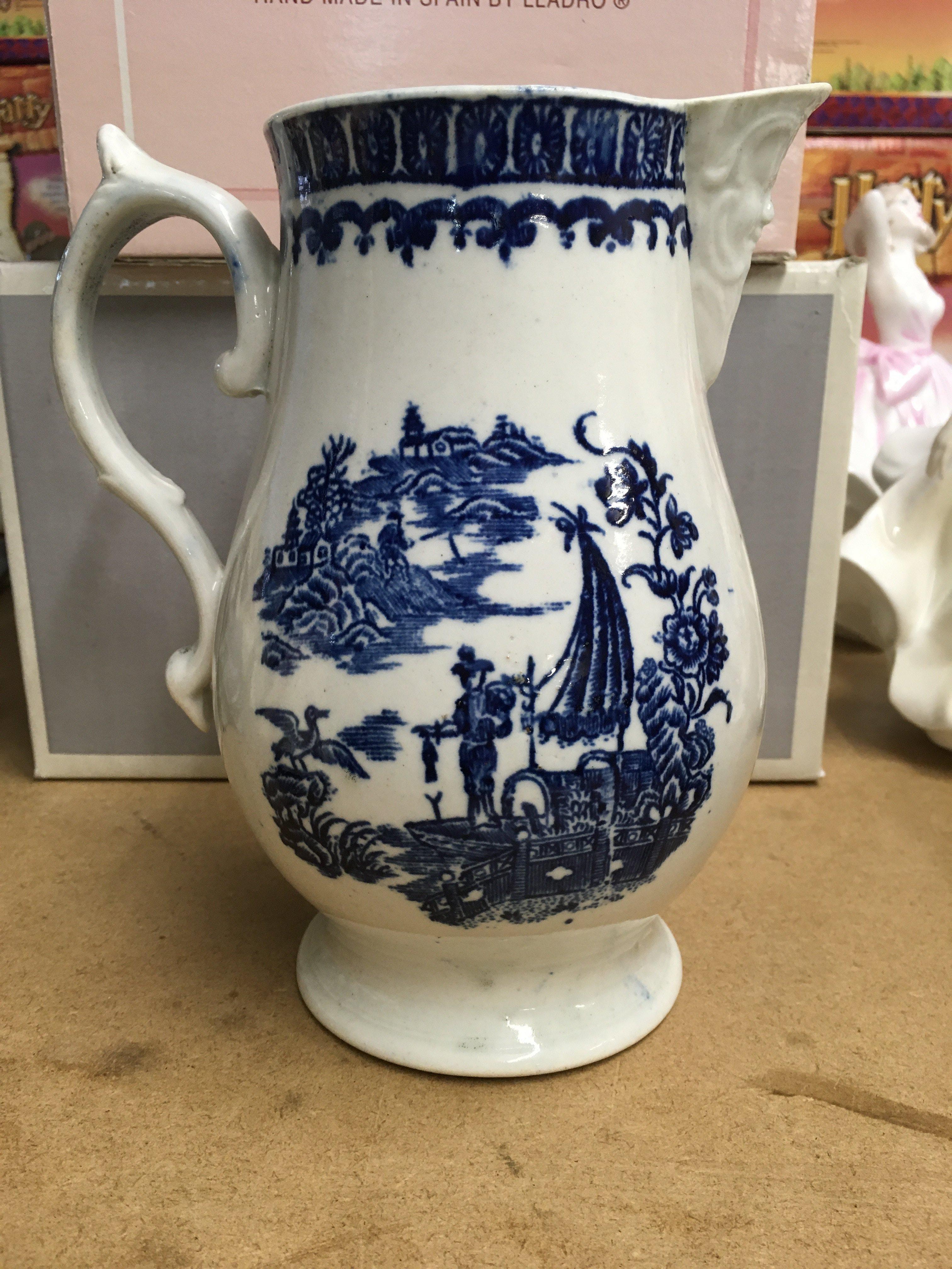 A Liverpool blue and white jug decorated in the fisherman pattern.