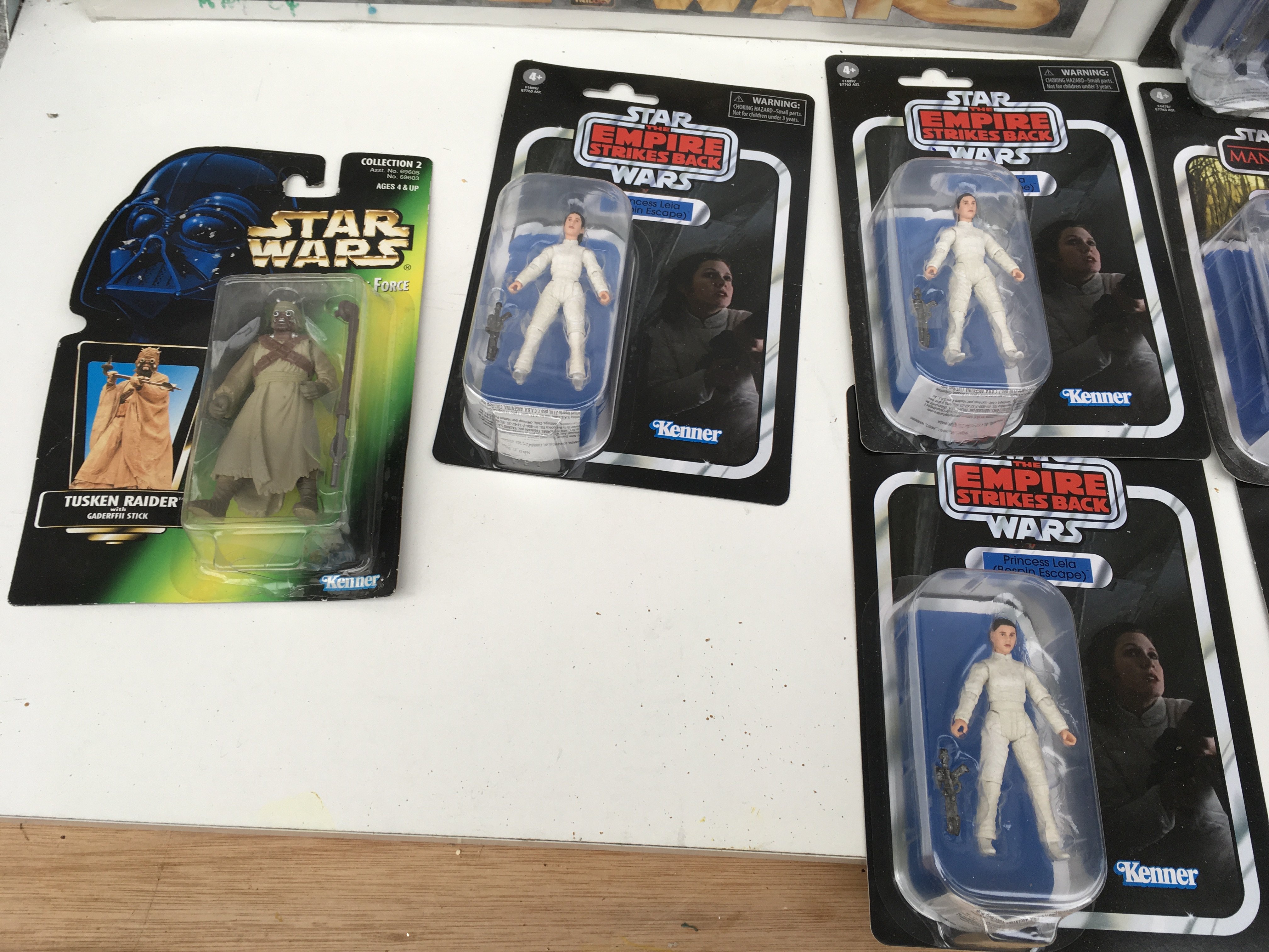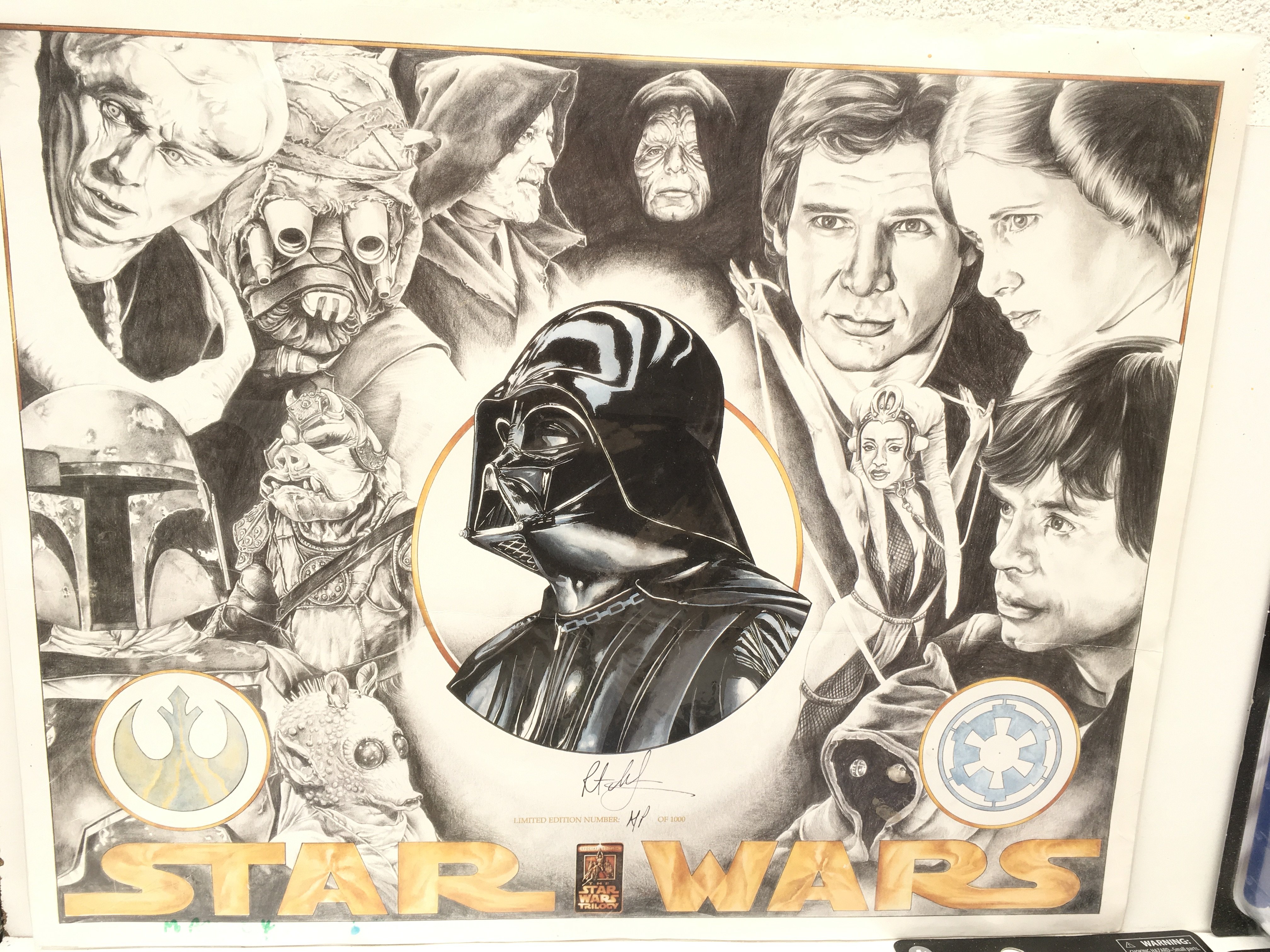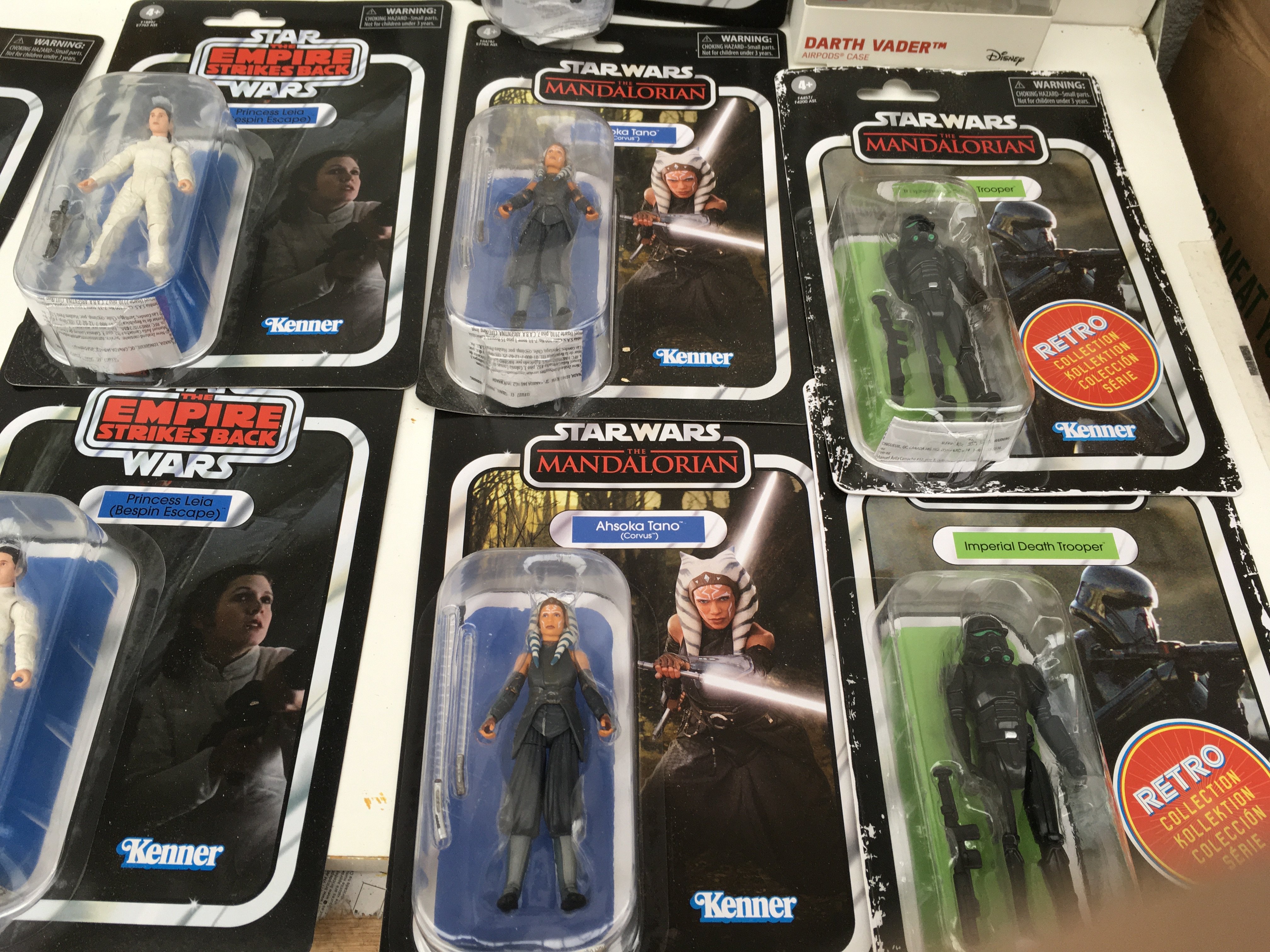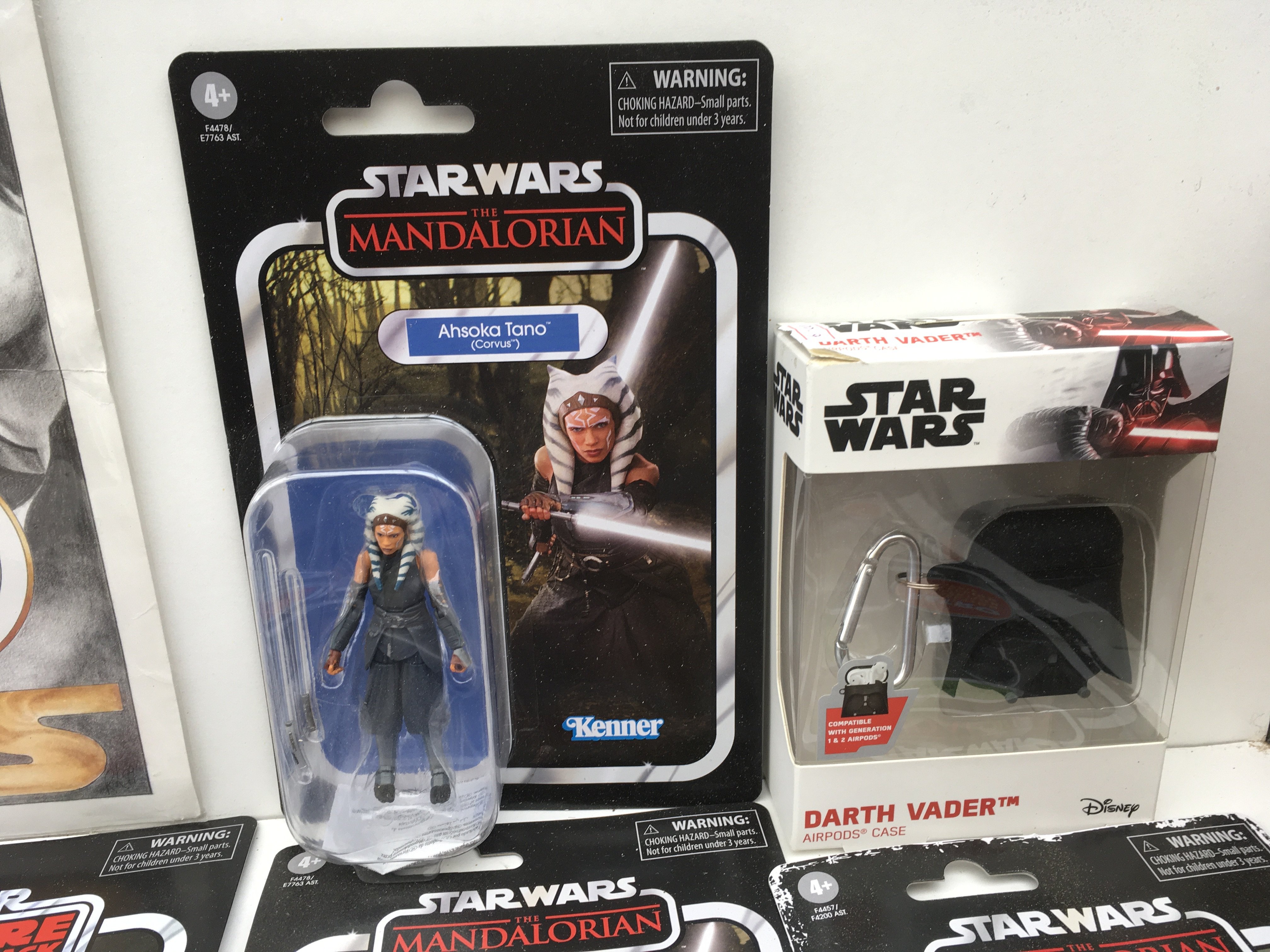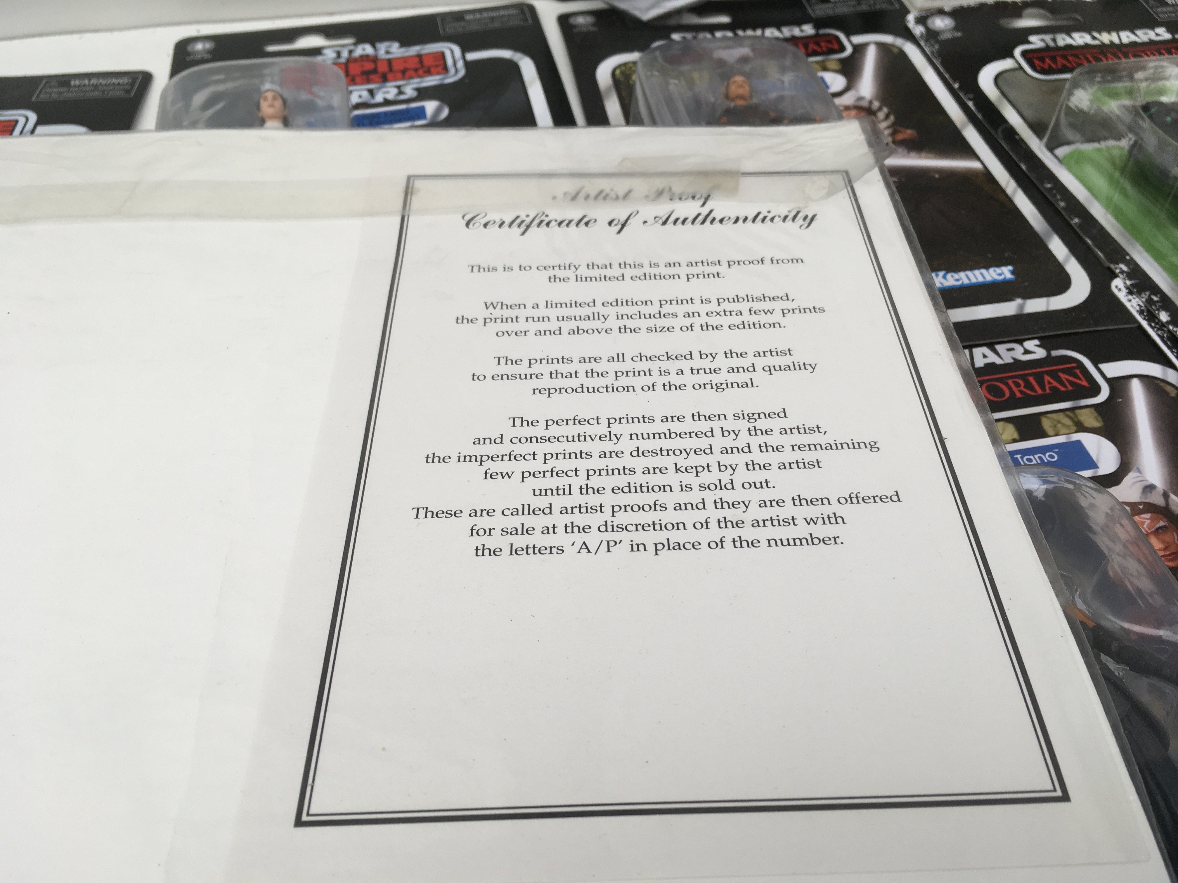 A group of 11 Star Wars pieces featuring a signed Artist Poof print from a limited edition of 1000 with Certificate of Authenticity . 9 x carded figures featuring the Empire Strikes Back..the Mandalorian and the Power of the Force. Also boxed Darth Vader AirPods Case.