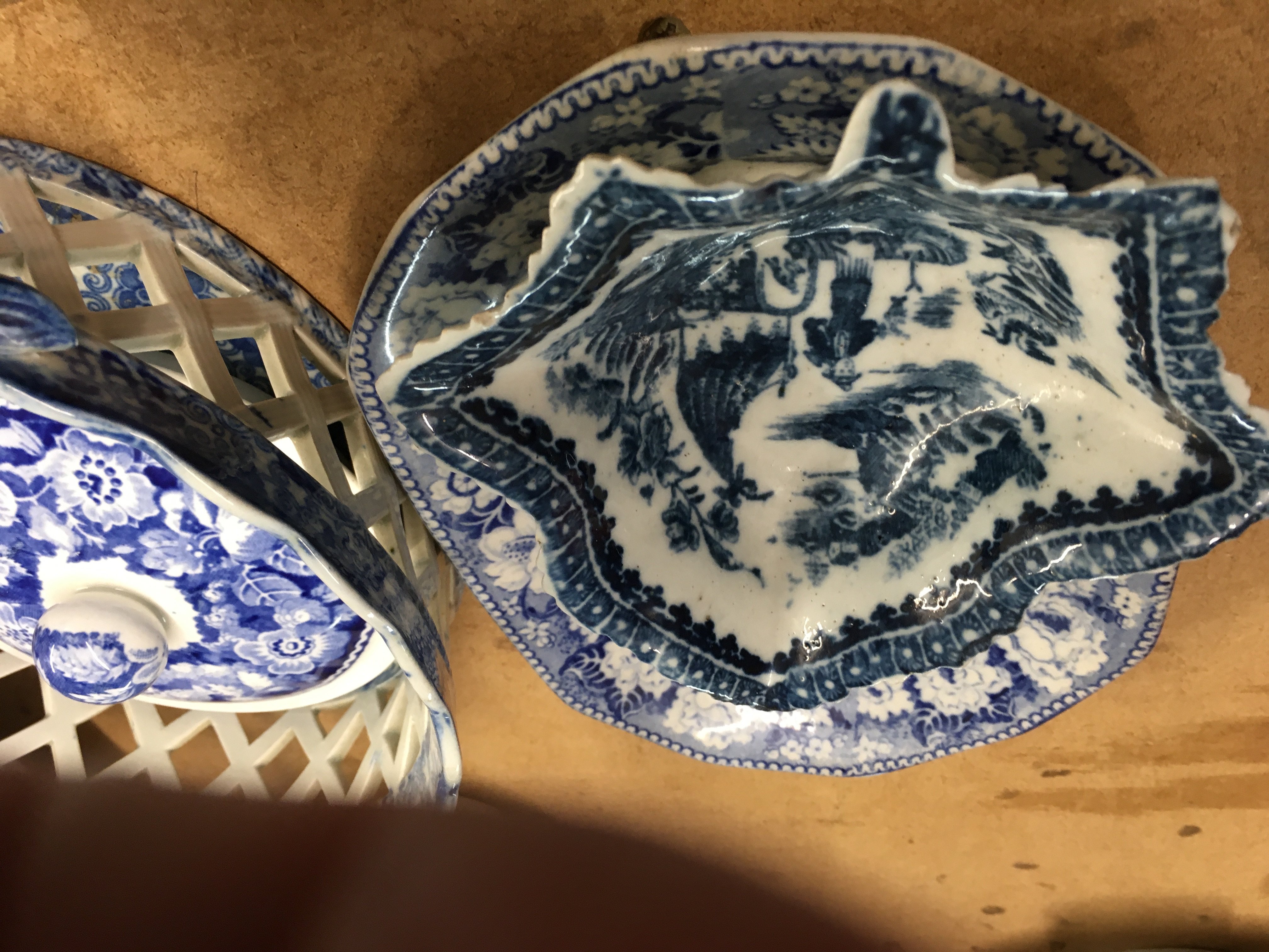 A Collection of 19th Century blue and white transfer ware including jugs dishes plates pickle dish .