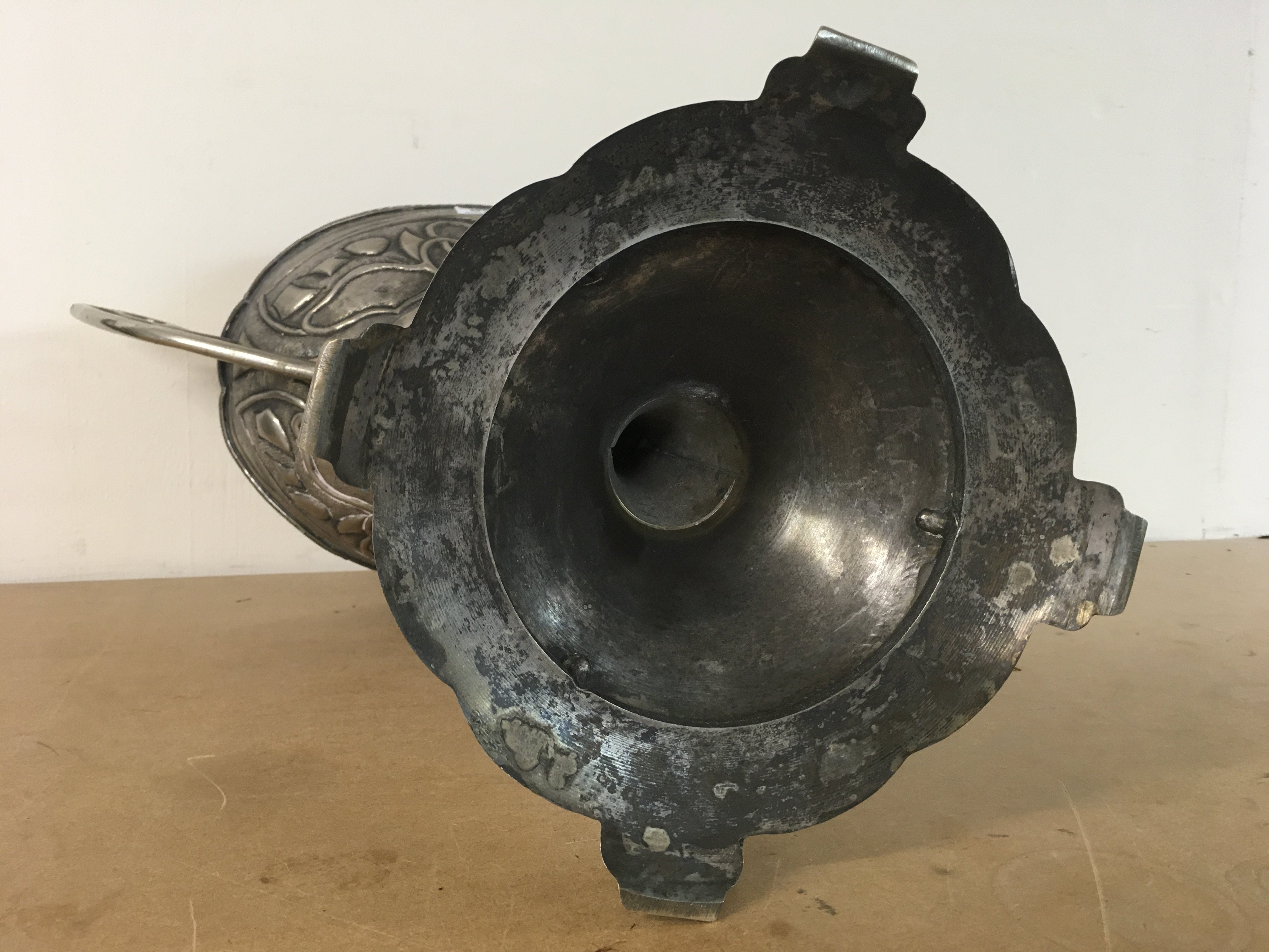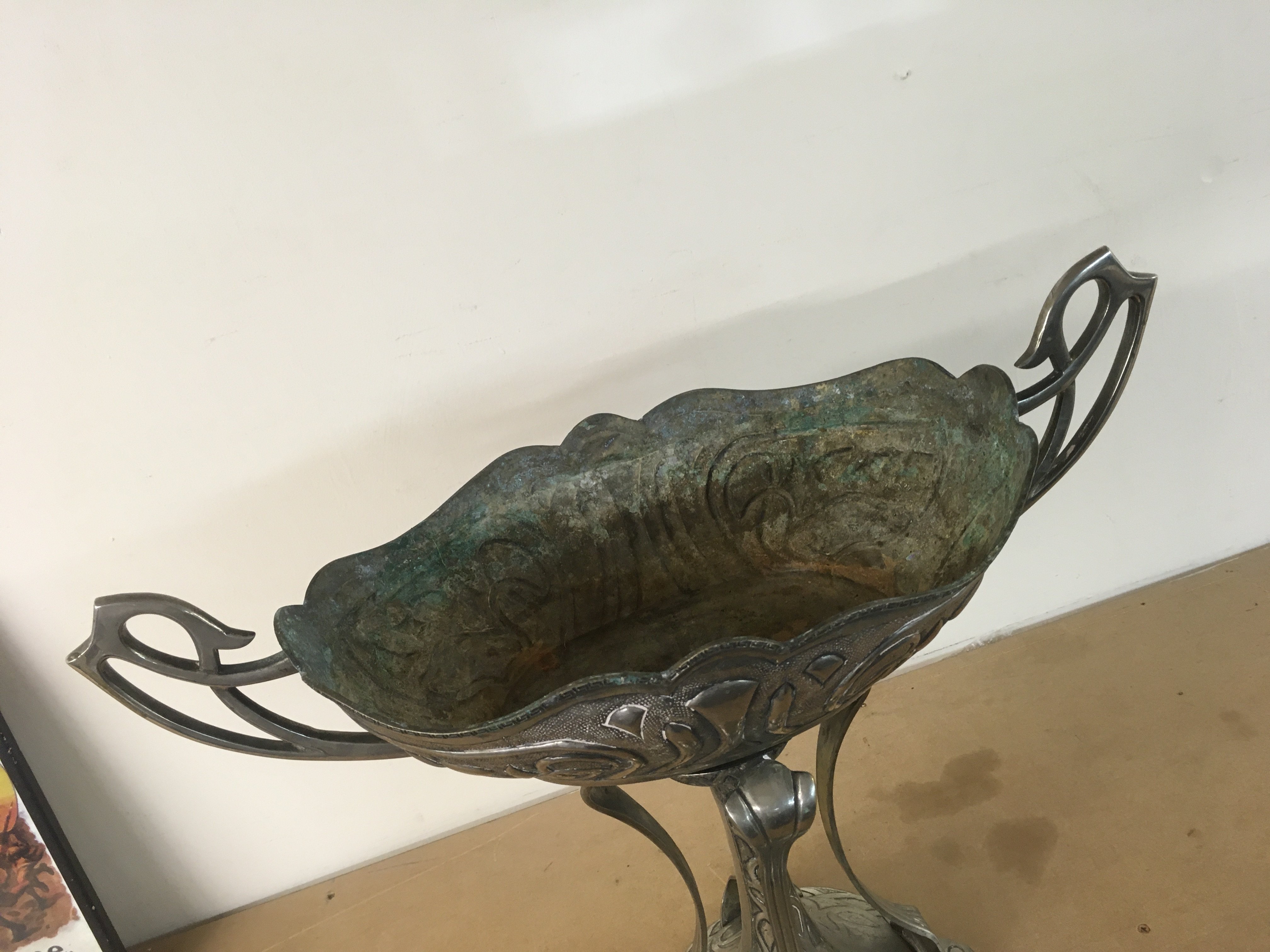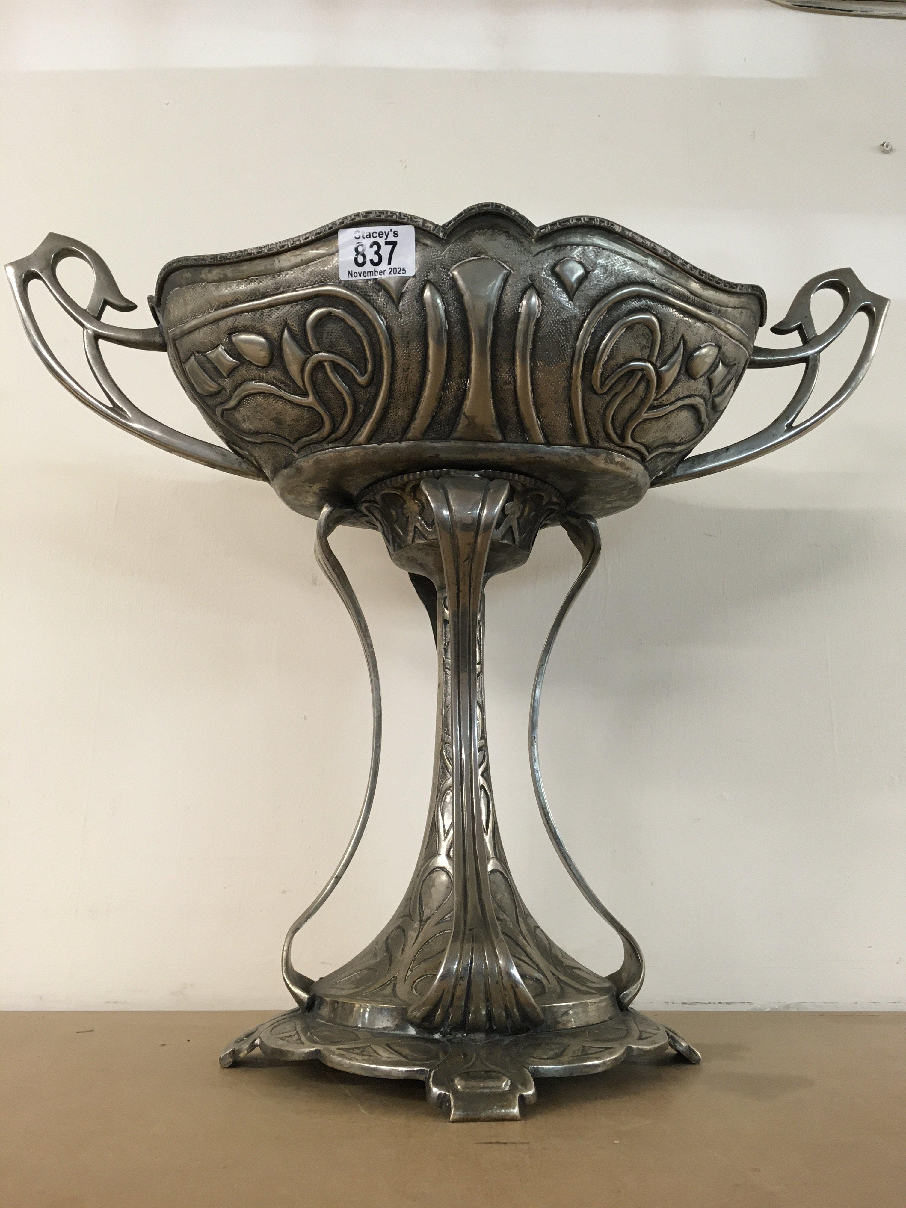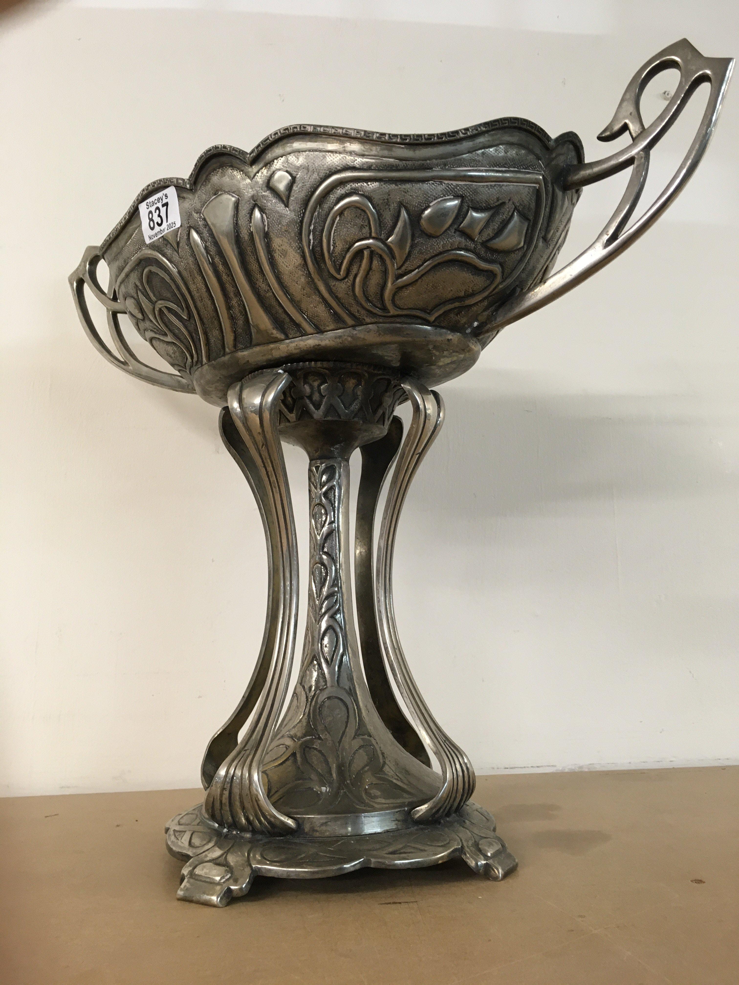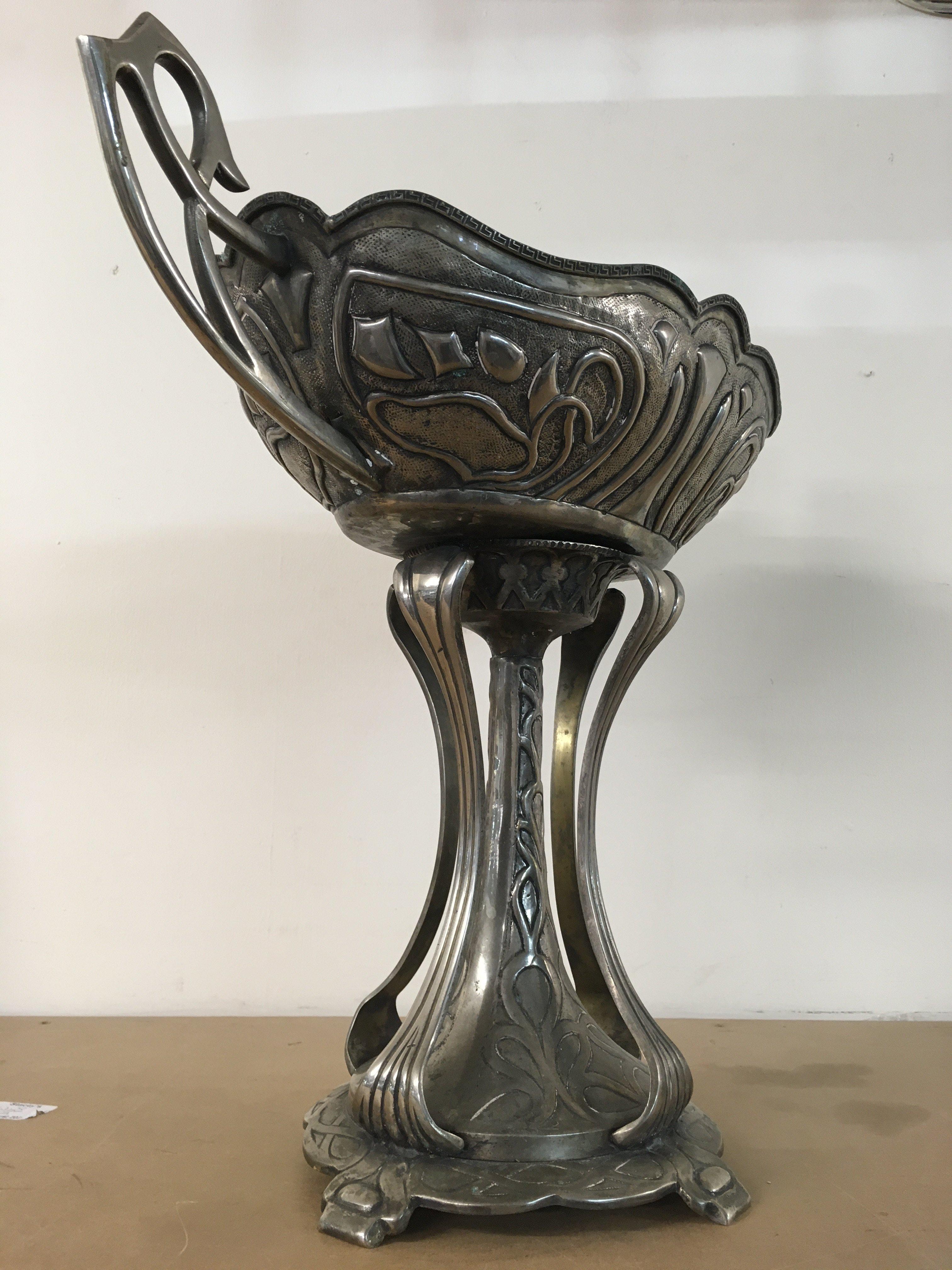 An Art Nouveau style silver plated jardiniere with stylised twin handles and traditional stylised design. 46cm height x 54cm x 25cm