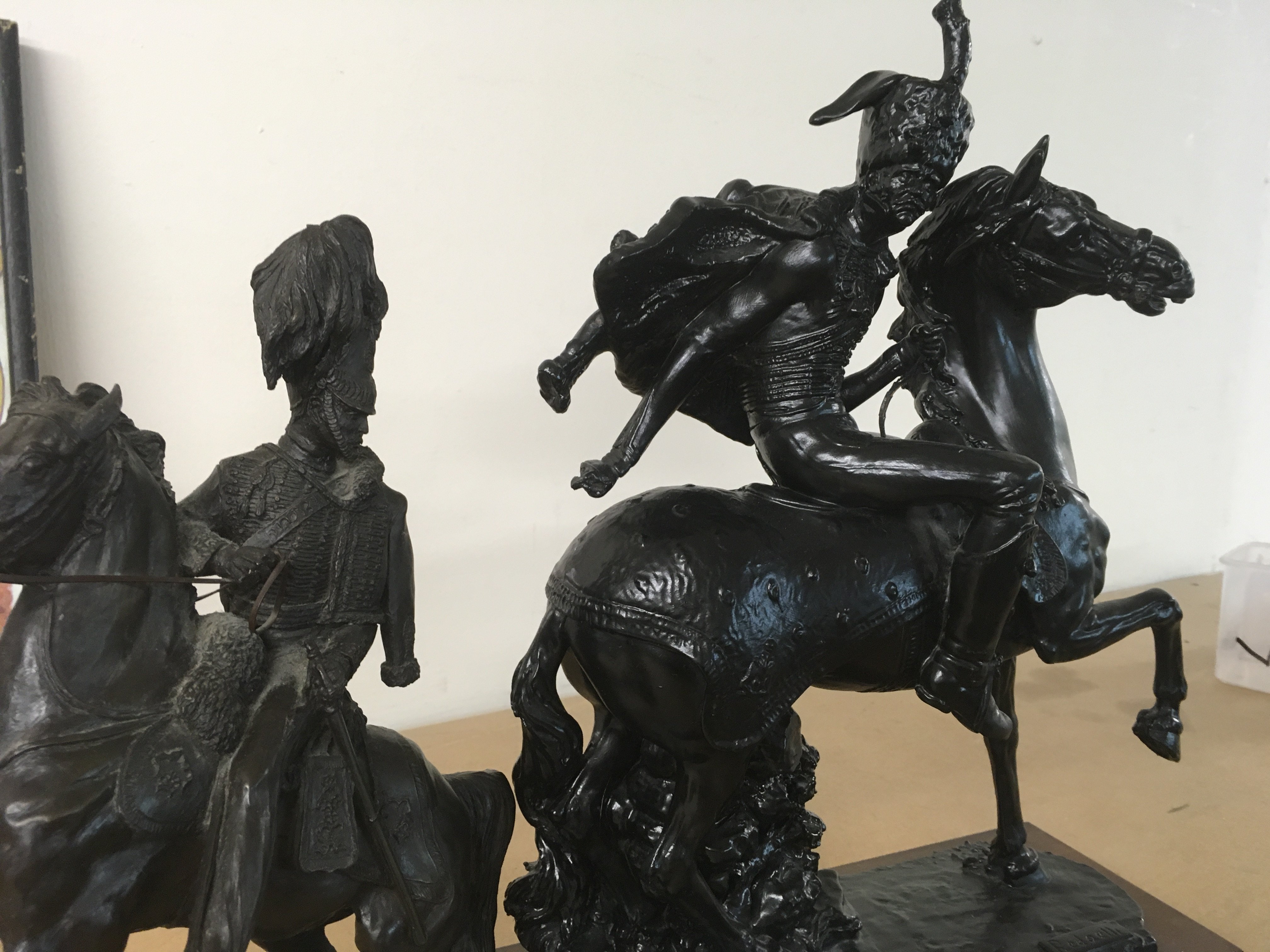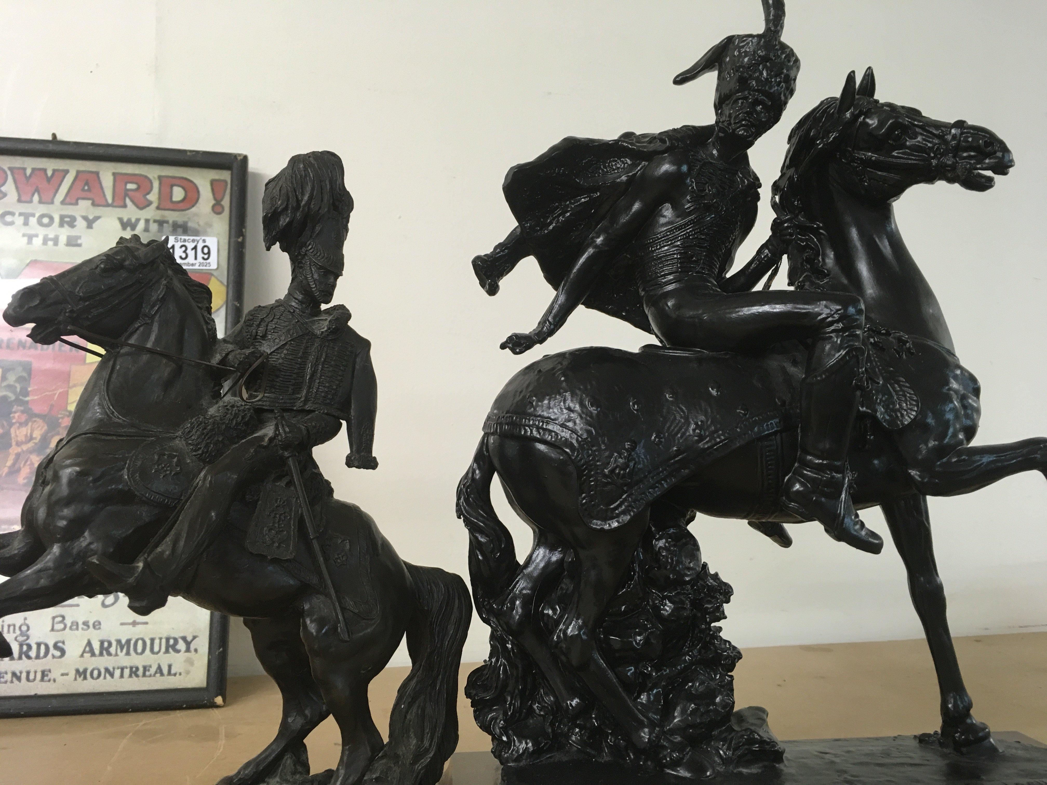 A figure in the form of a Hussar cavalry officer on horseback together with One other figure on horseback on a plinth base .