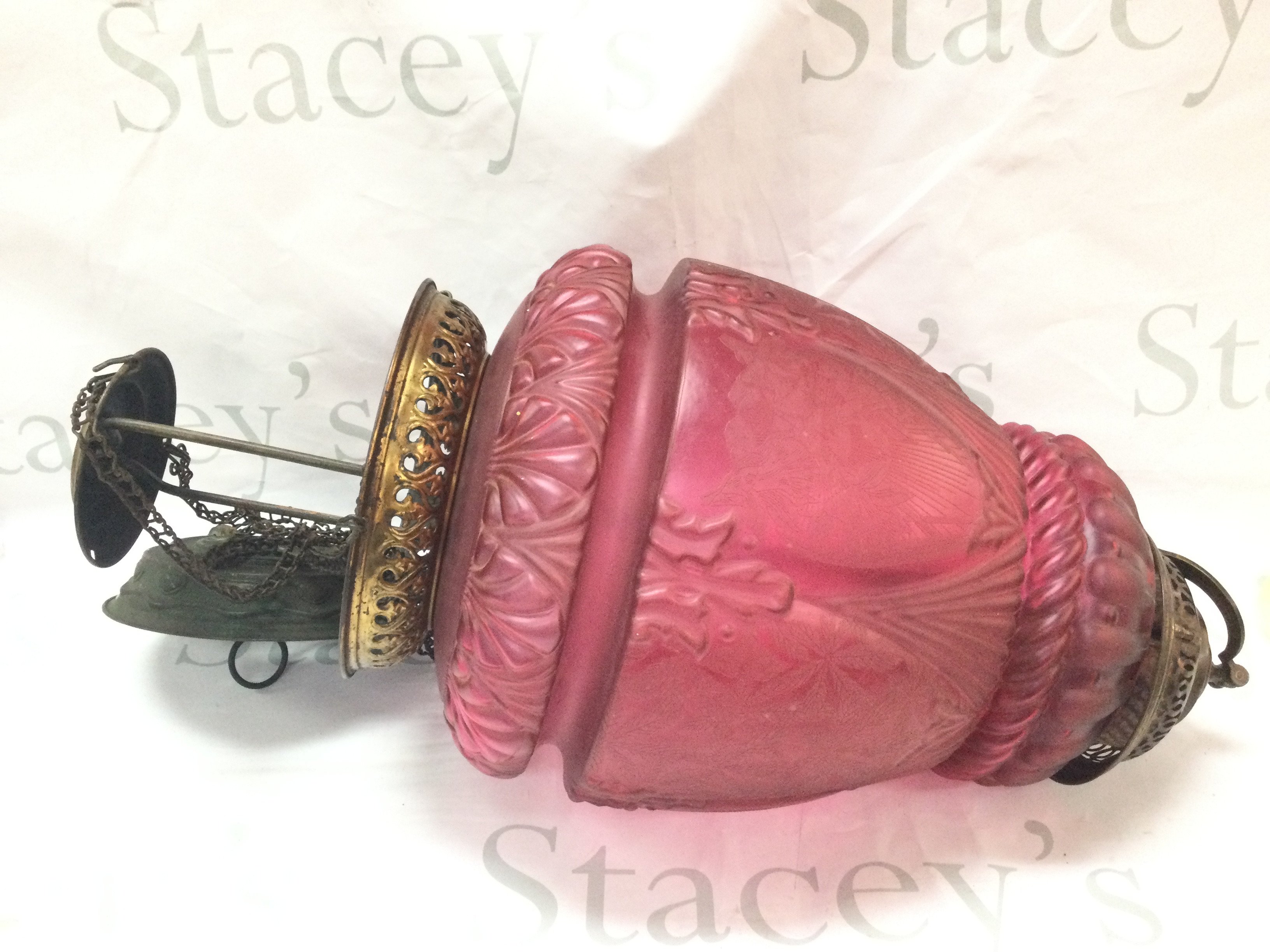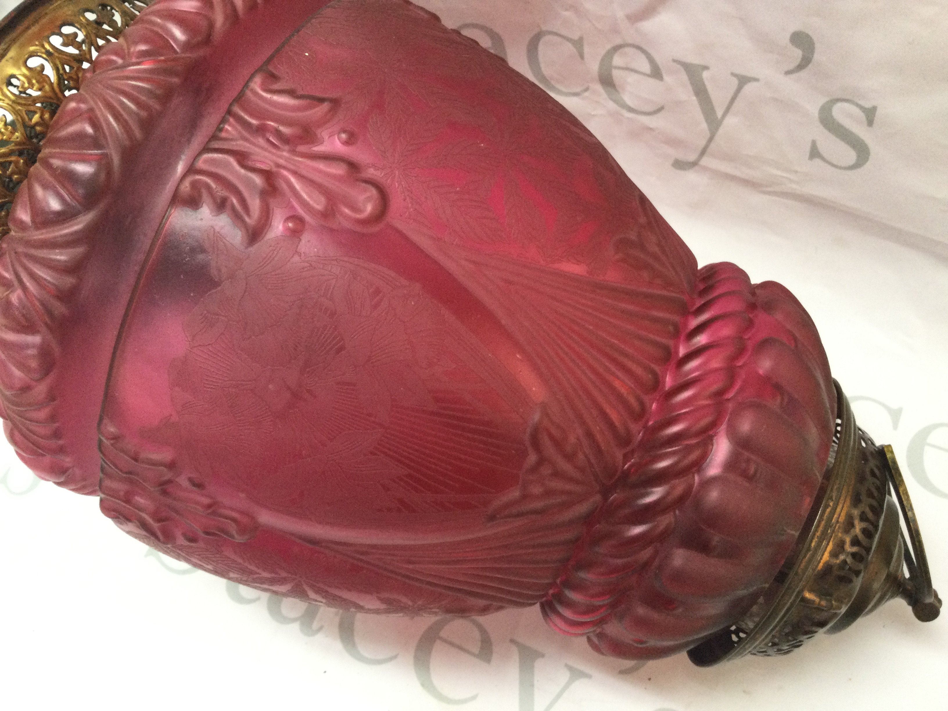 A quality early 20th century etched glass red lamp shade. Total height approximately 52cm ,26cm wide approx