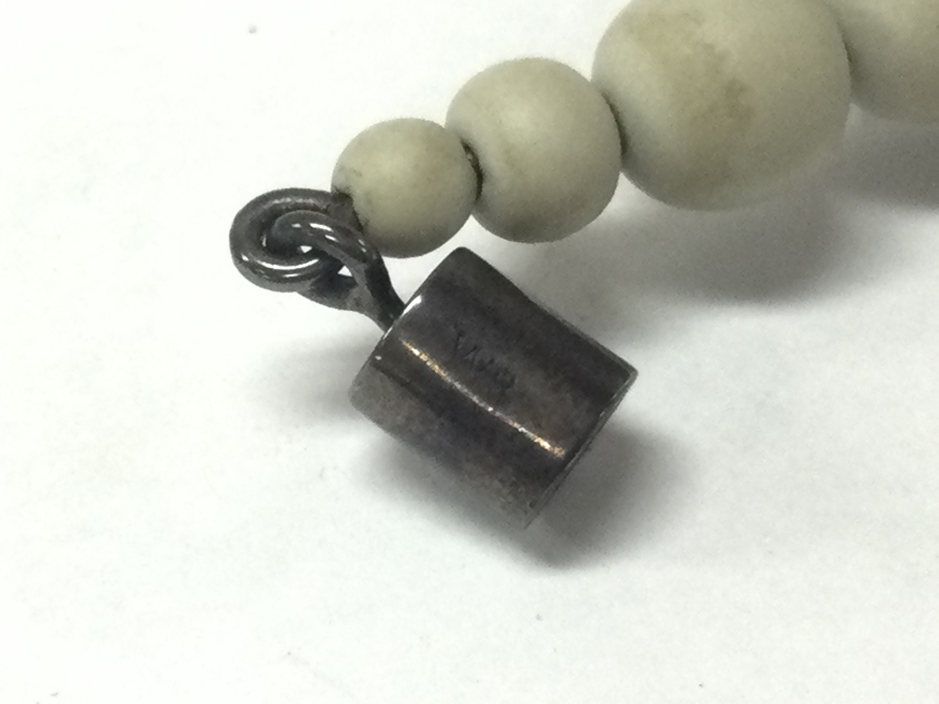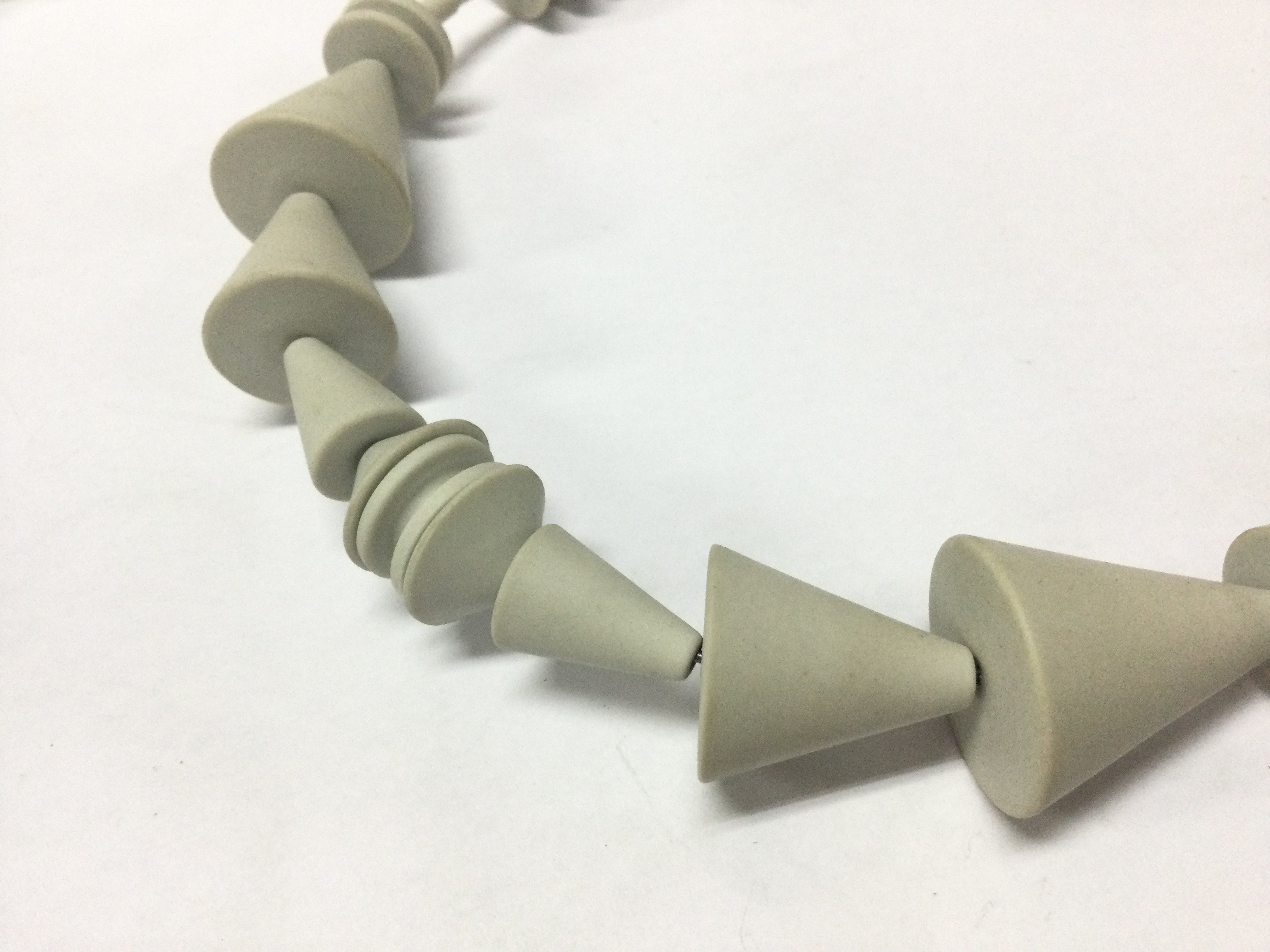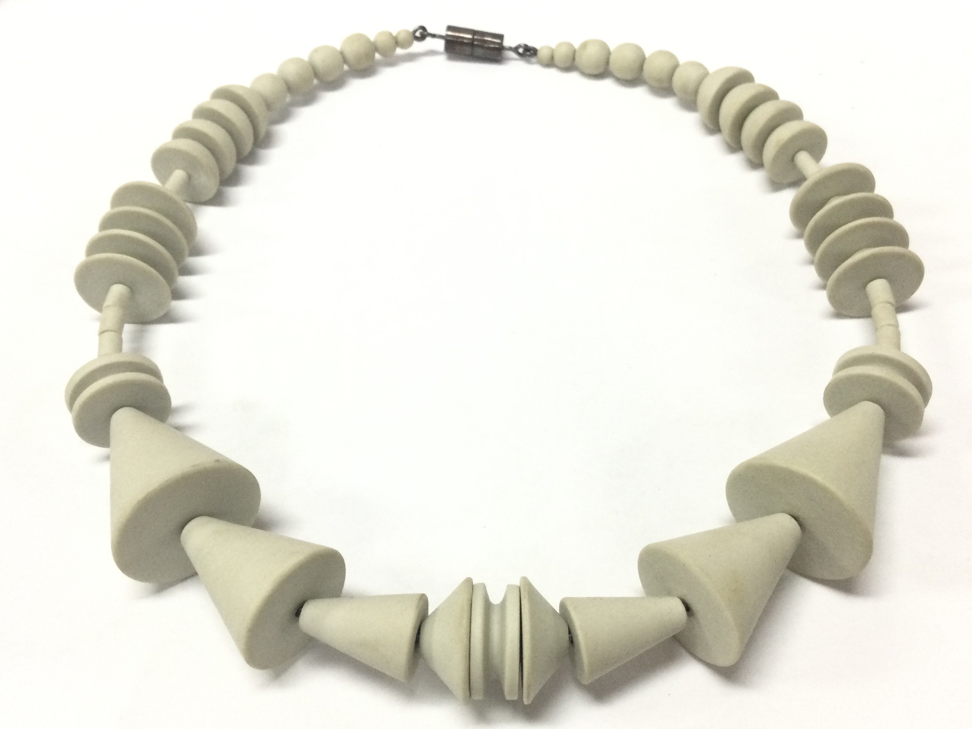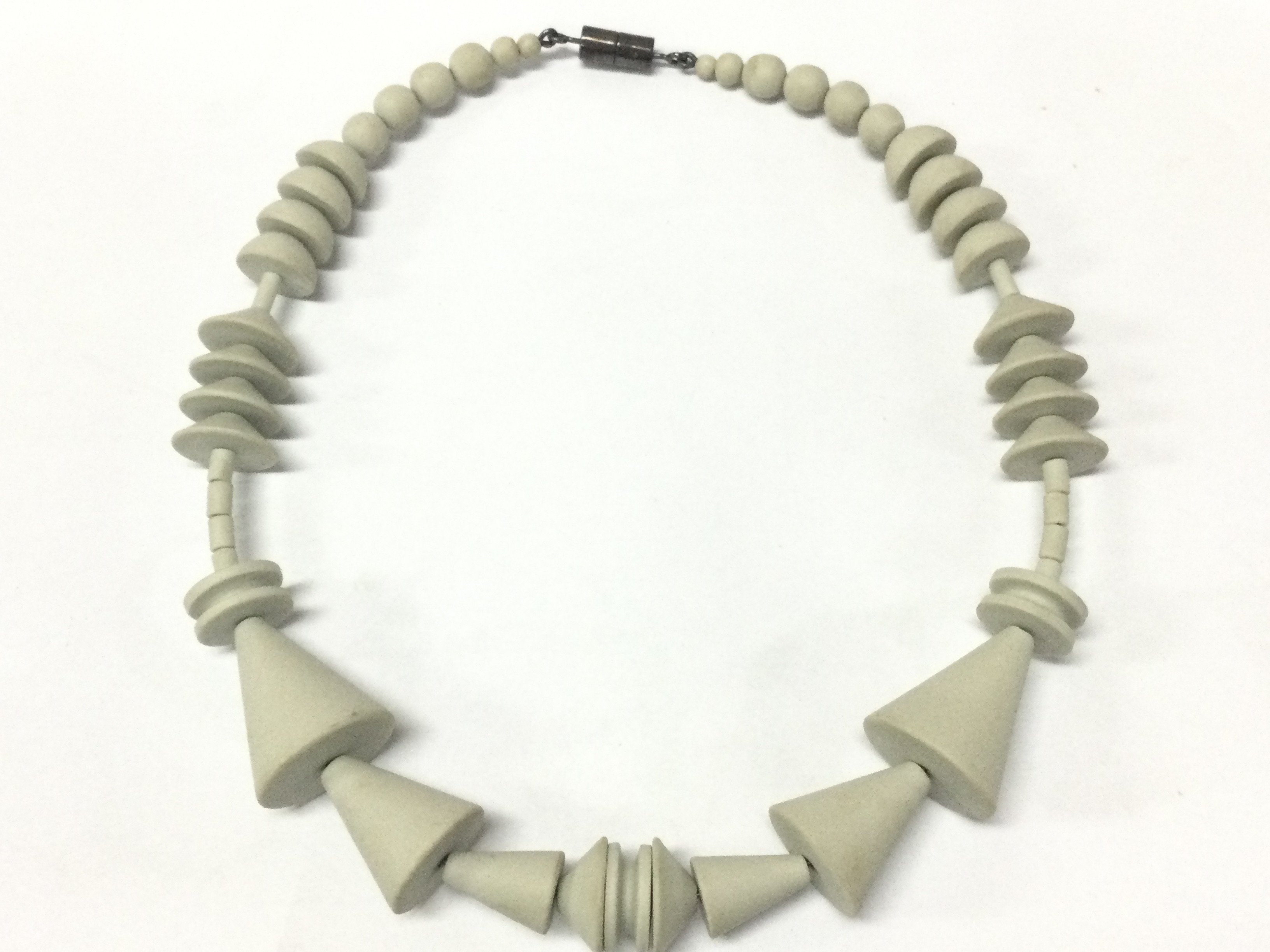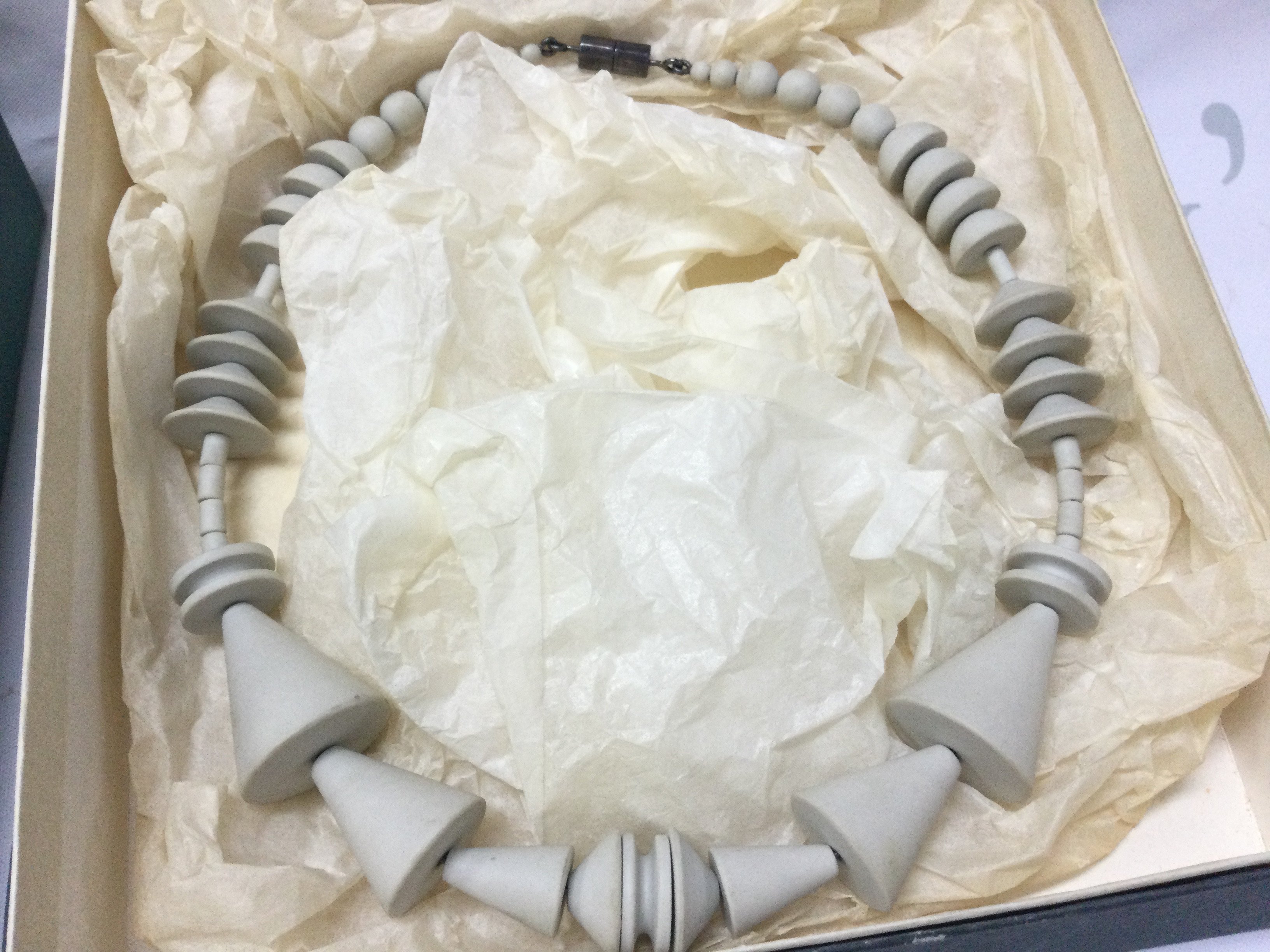 A boxed Wendy Ramshaw (1939-2018) necklace with Wedgwood hand turned beads ,a silver clasp hallmarked maker J.W and signed WR. 16cm wide approximately . Postage category B