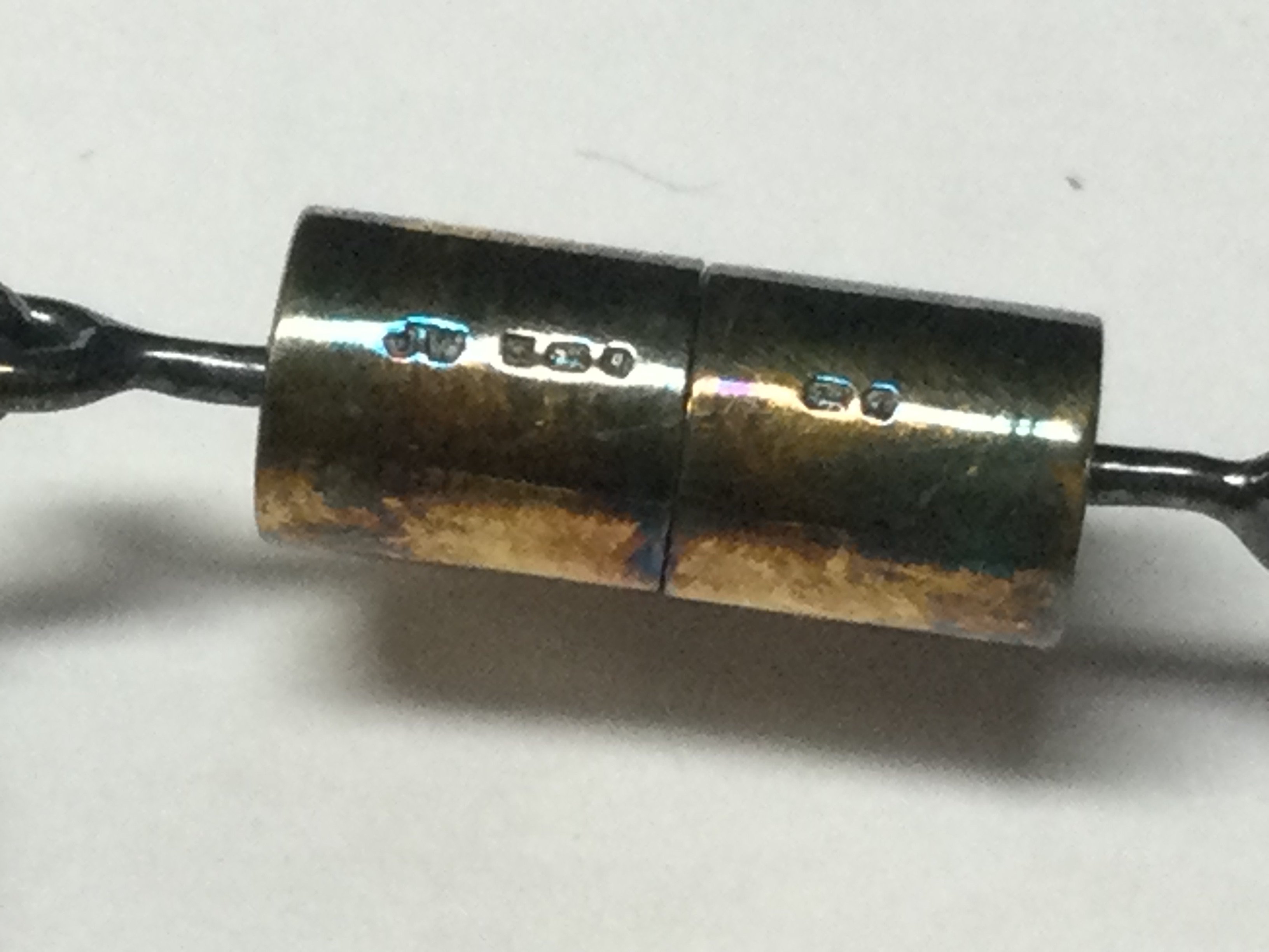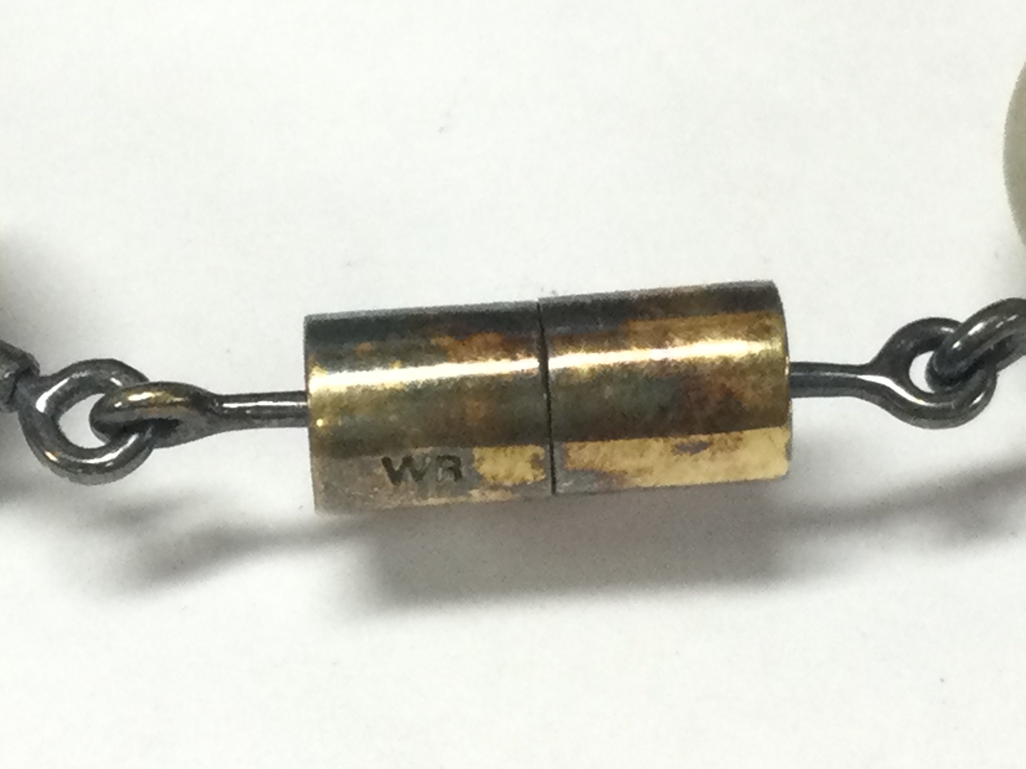 A boxed Wendy Ramshaw (1939-2018) necklace with Wedgwood hand turned beads ,a silver clasp hallmarked maker J.W and signed WR. 13cm wide approximately . Postage category B