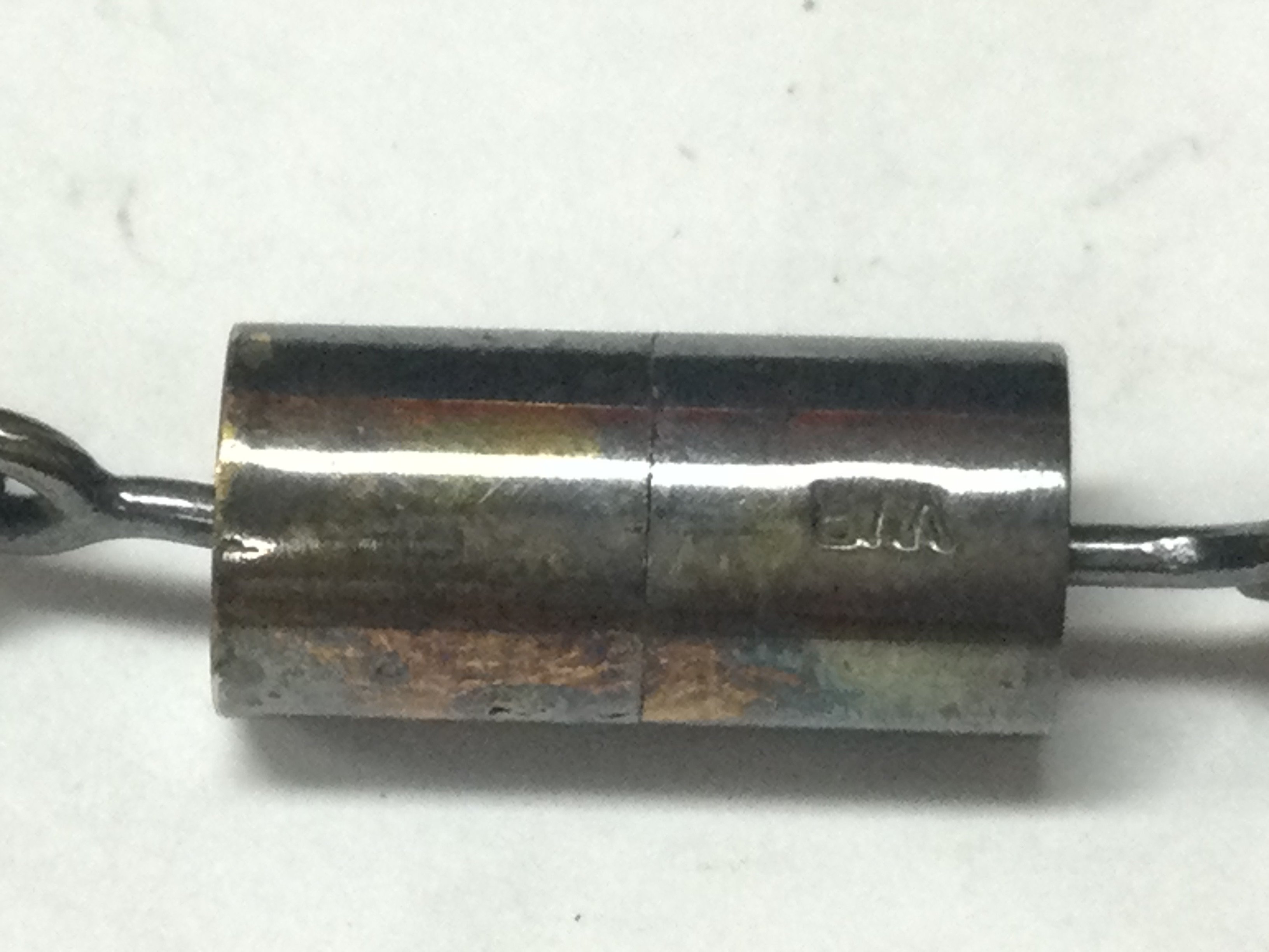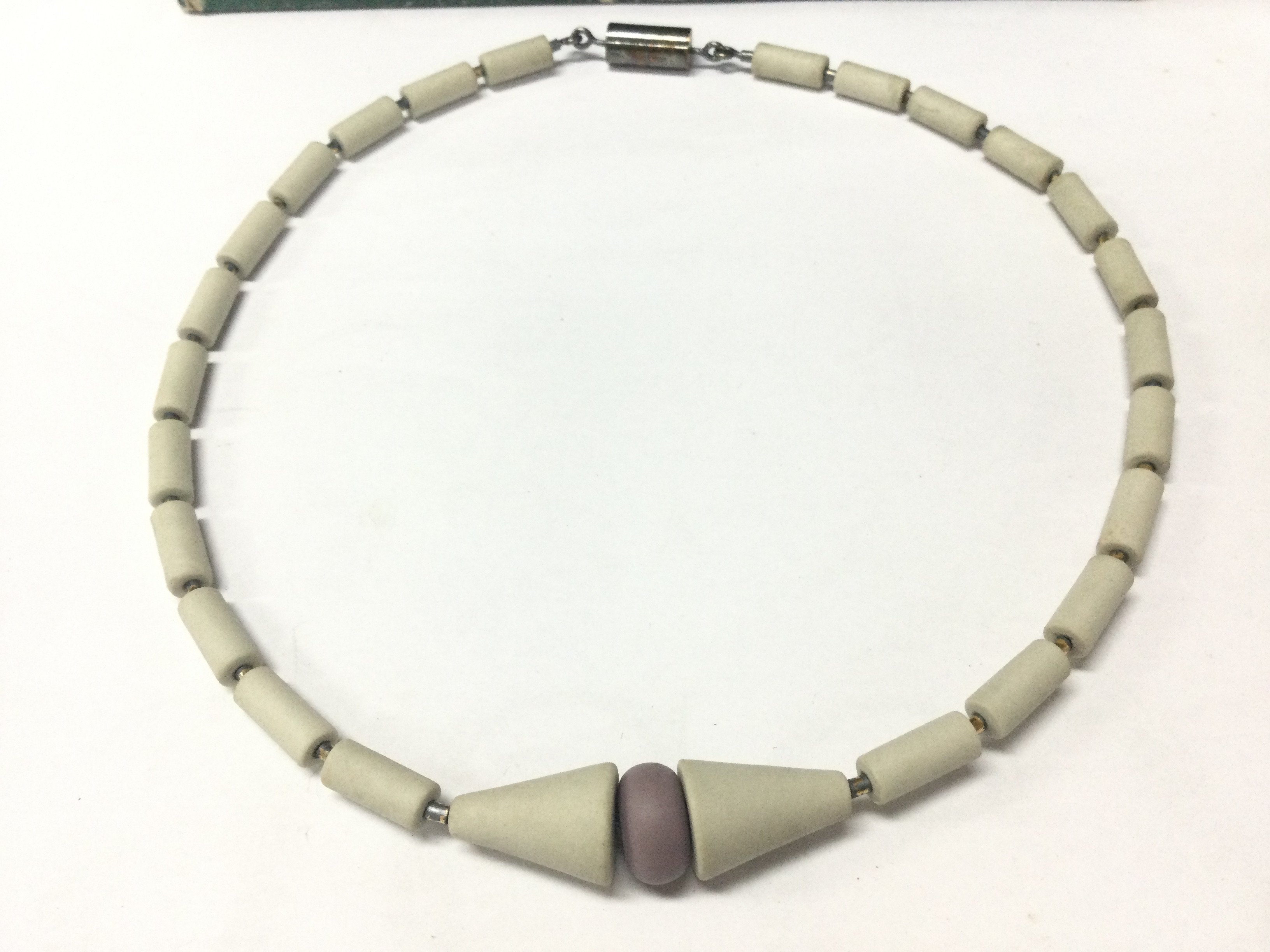 A boxed Wendy Ramshaw (1939-2018) necklace with Wedgwood hand turned beads ,a silver clasp hallmarked maker J.W and signed WR. 14cm wide approximately . Postage category B
