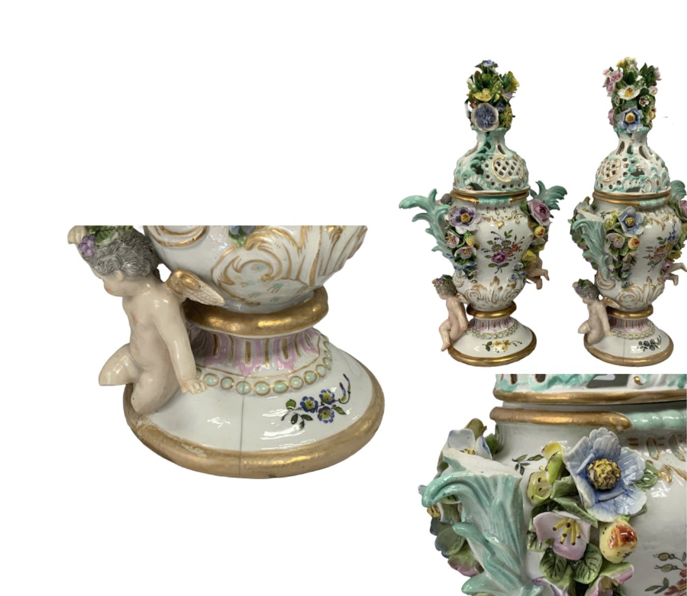 A pair of 19th Century German porcelain pot pourri vases and covers with cherub and floral decoration. 36cm. (Some areas of damage).