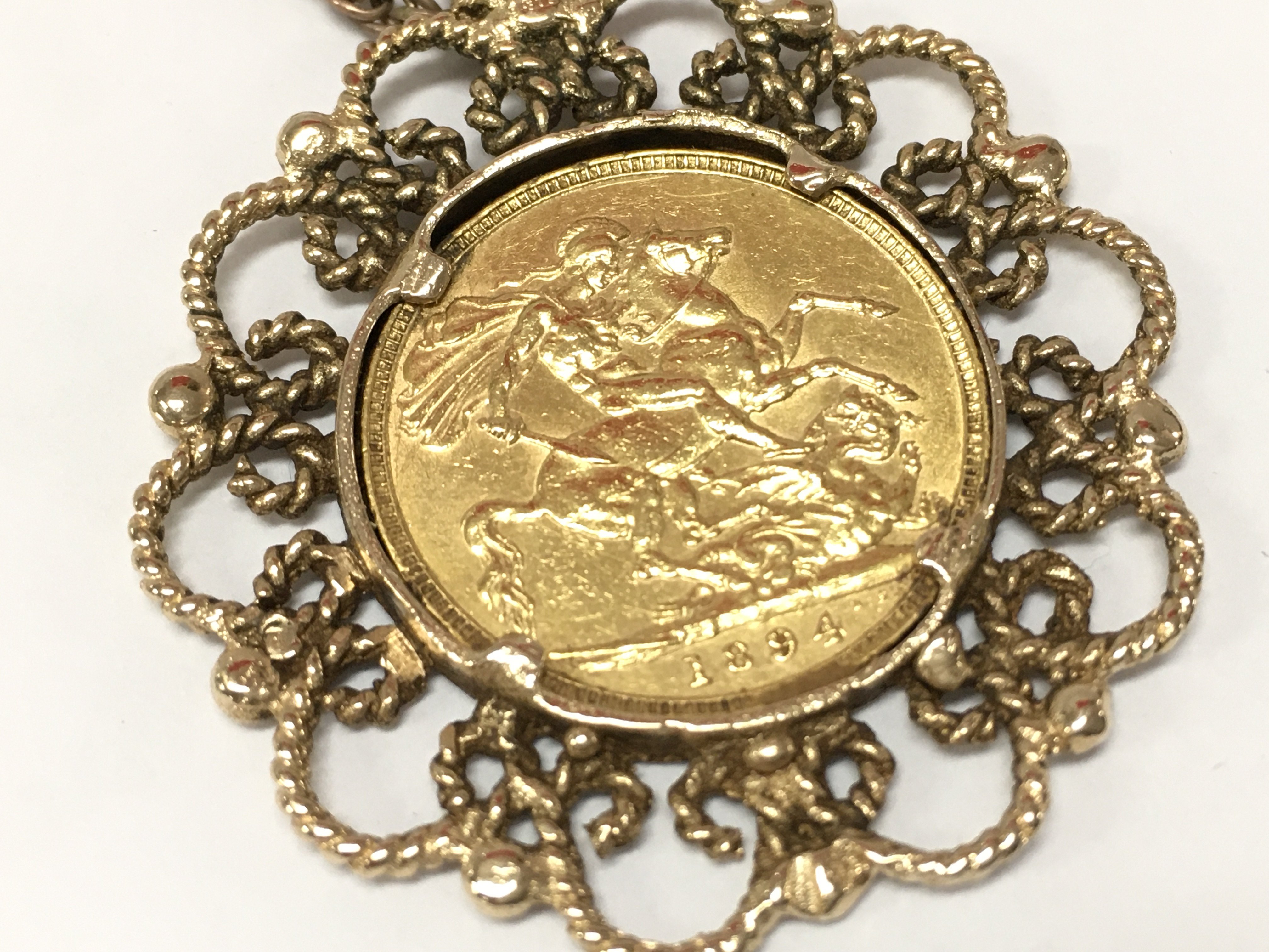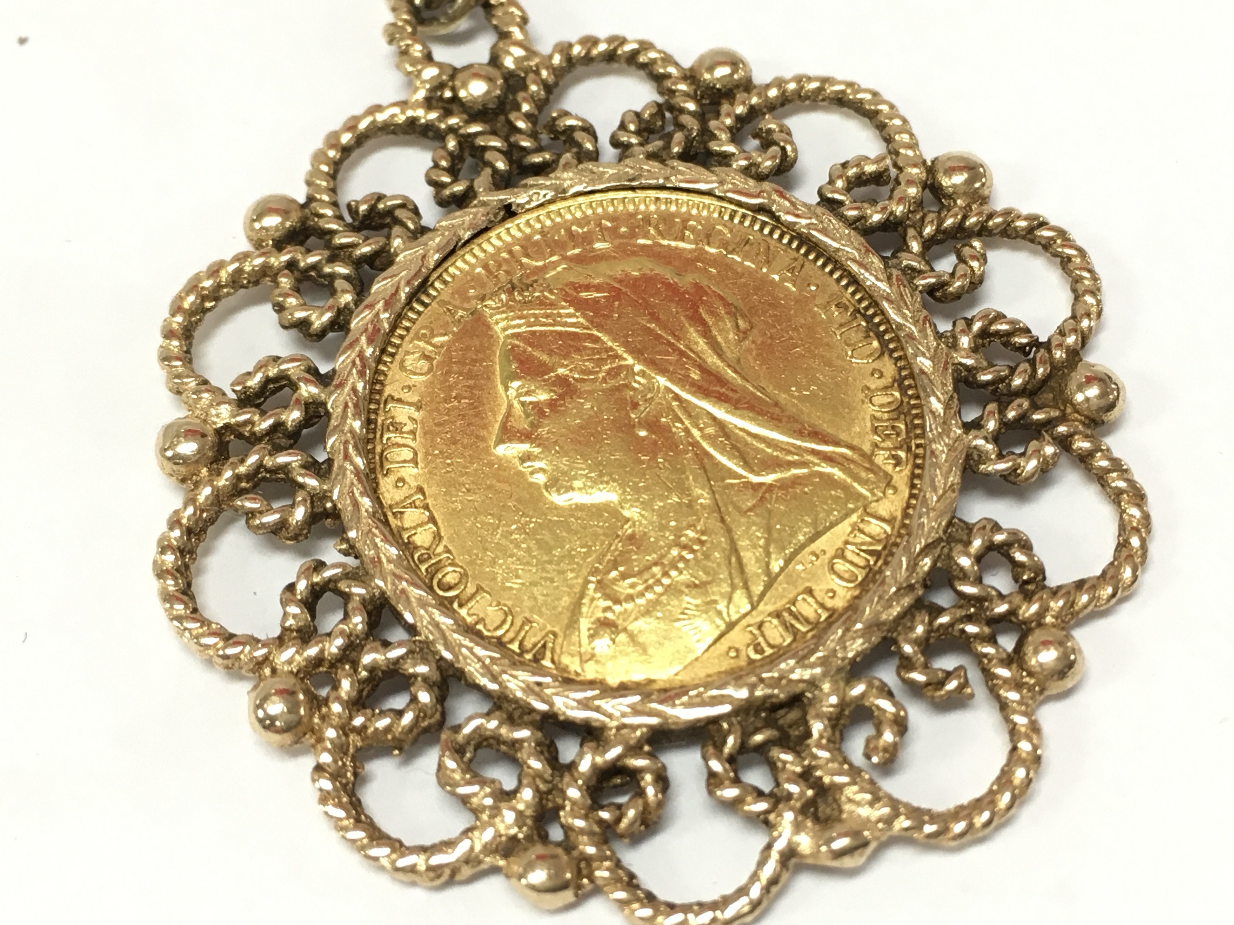 A Victorian sovereign in a 9ct gold mount , 9k marked chain. 23g total weight. Postage category A