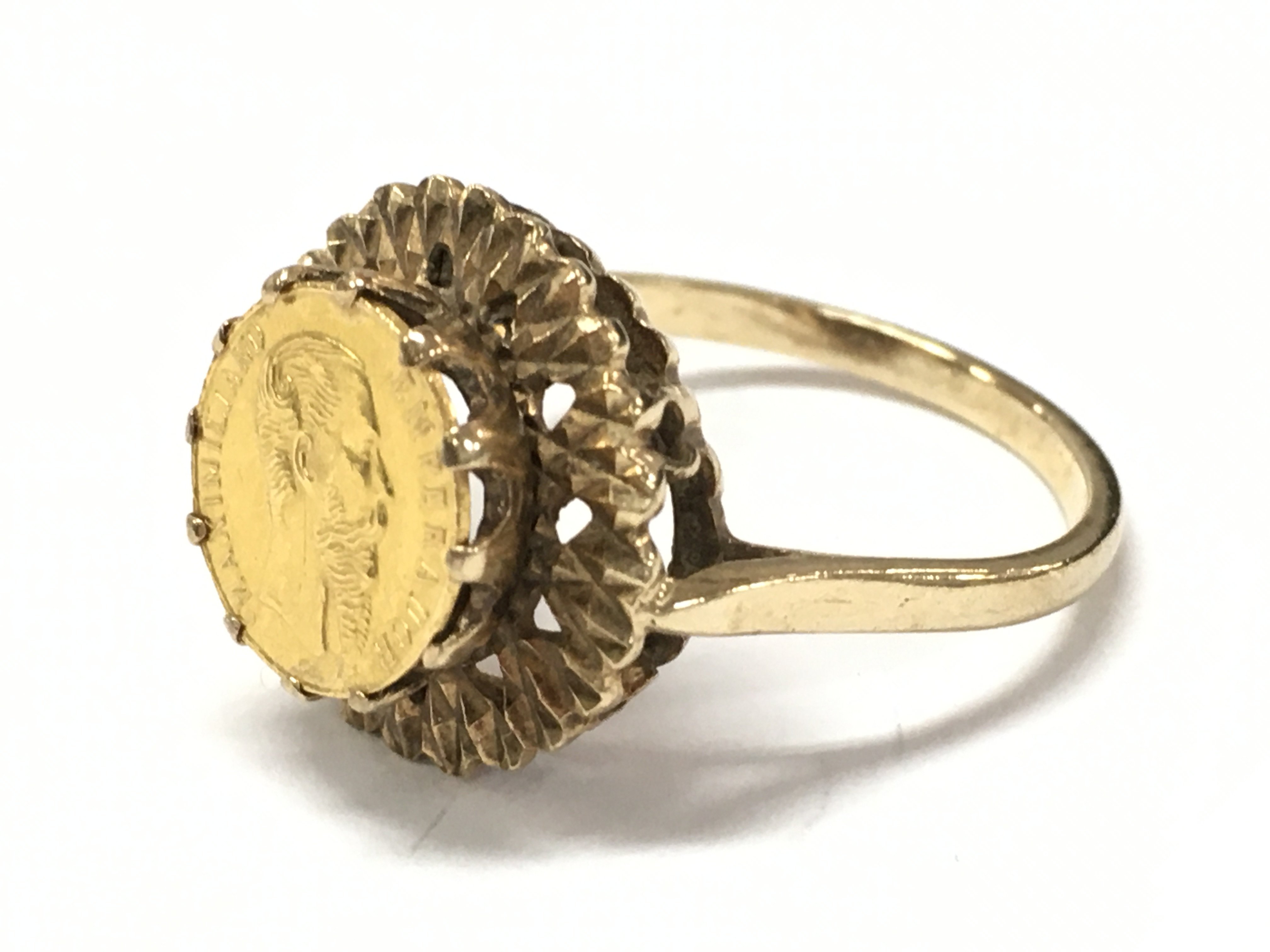 A 9ct gold ring set with a small Maximiliano Emperador coin. 3.6g total weight . Size P. Postage cat A