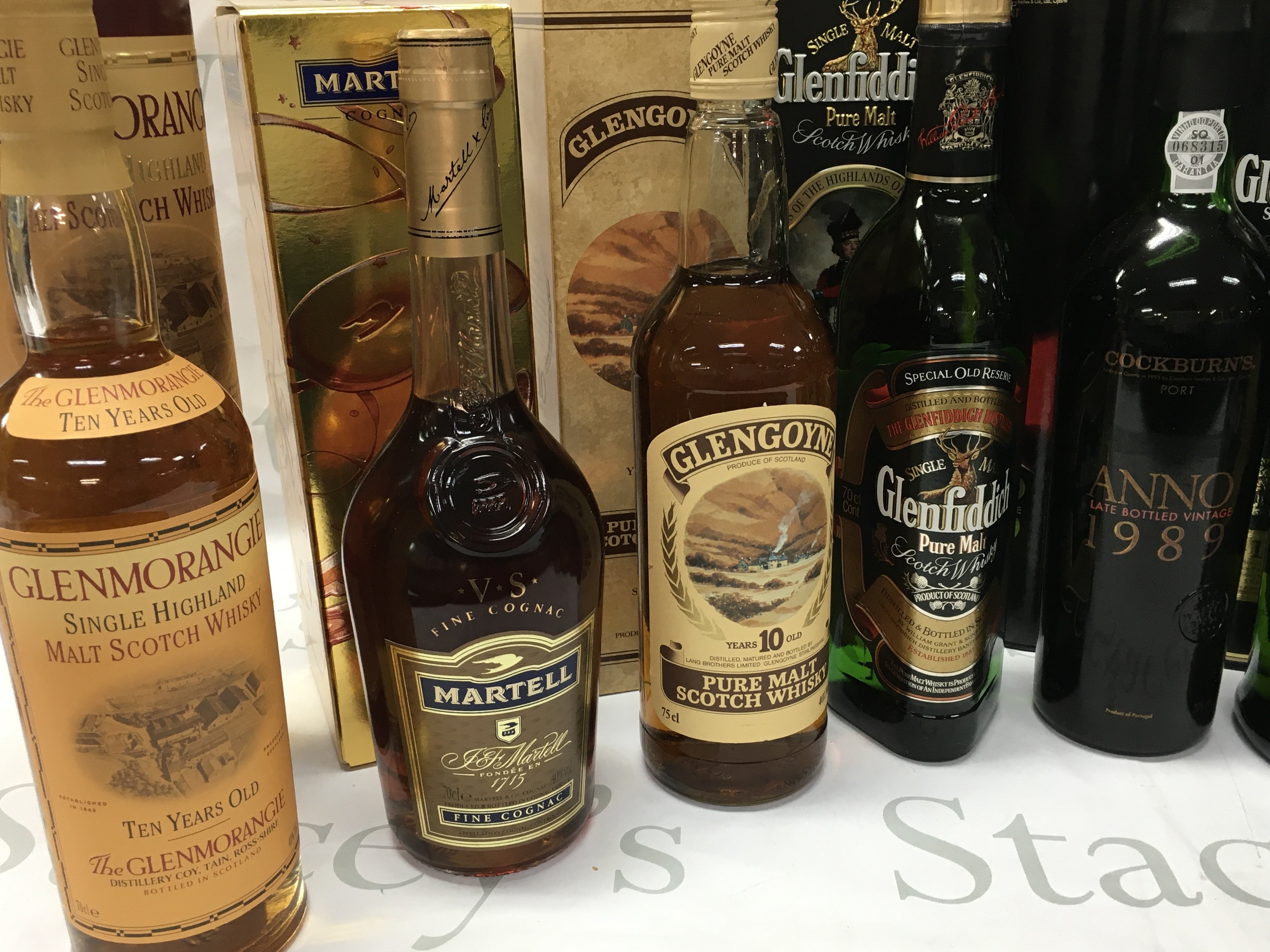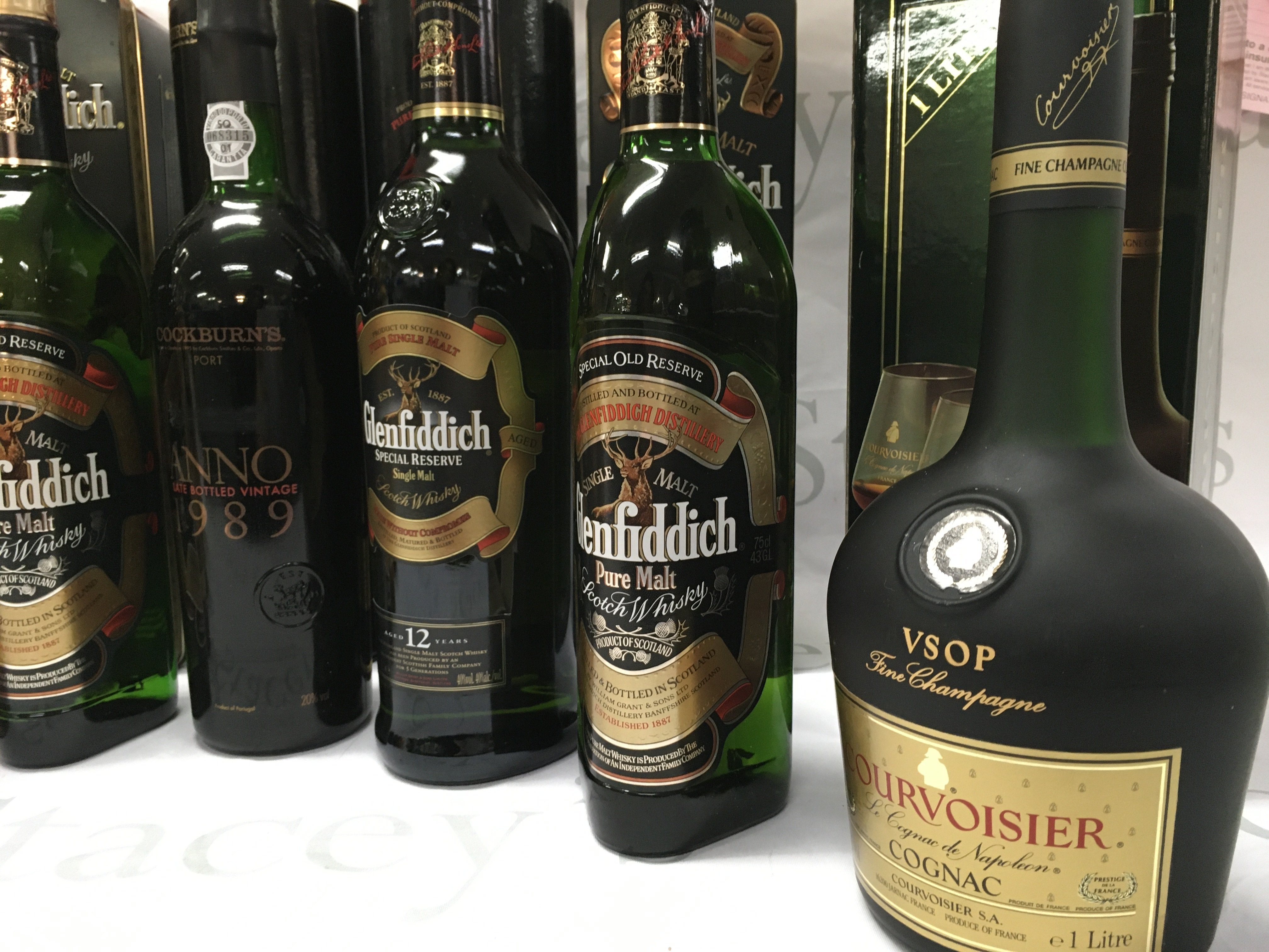 A Collection of boxed whiskey including Glenfiddich single malt , Cockburns 1989 port, Courvoisier fine champagne . This lot cannot be posted