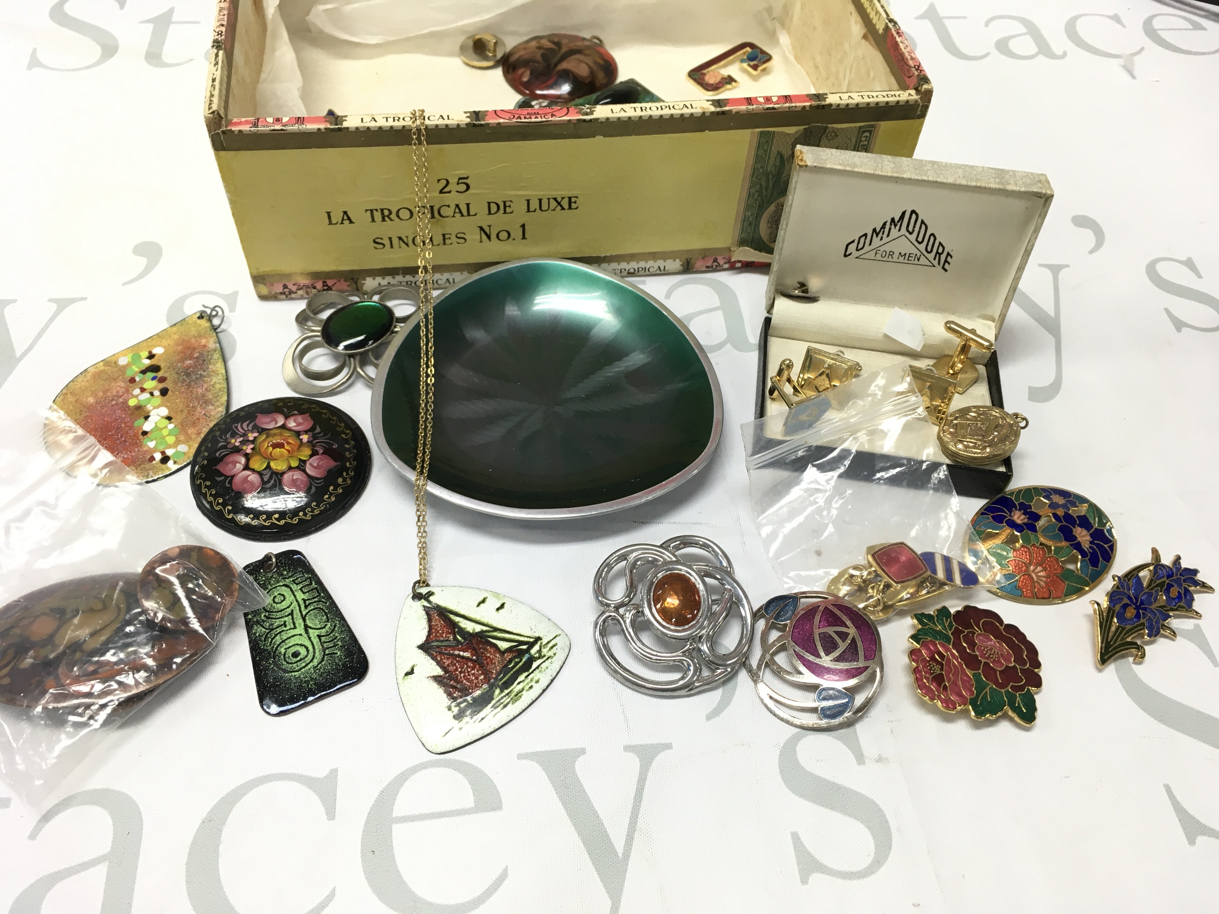 A box of enamel jewellery including four pieces of Masonic Jewellery . Postage category b