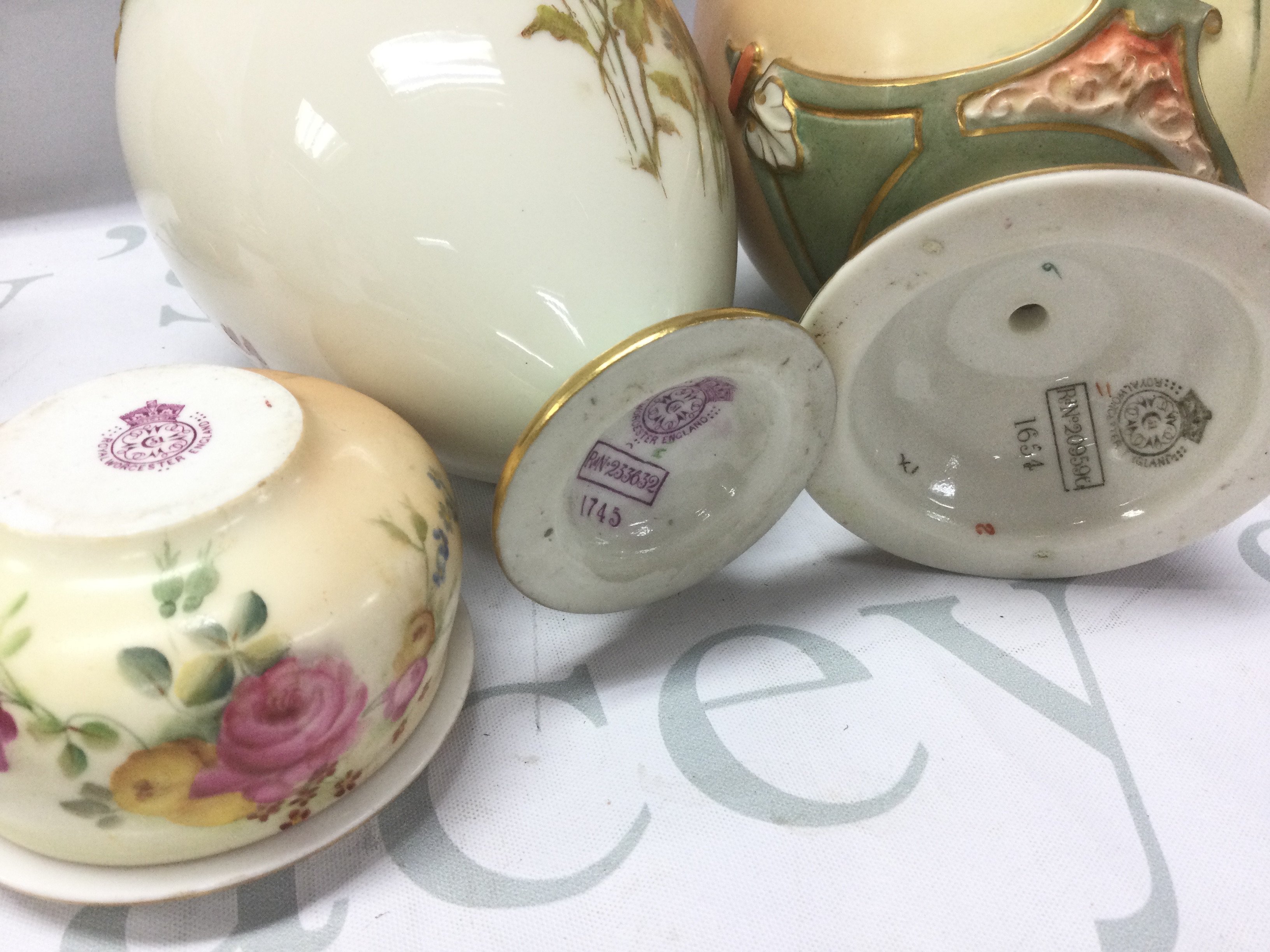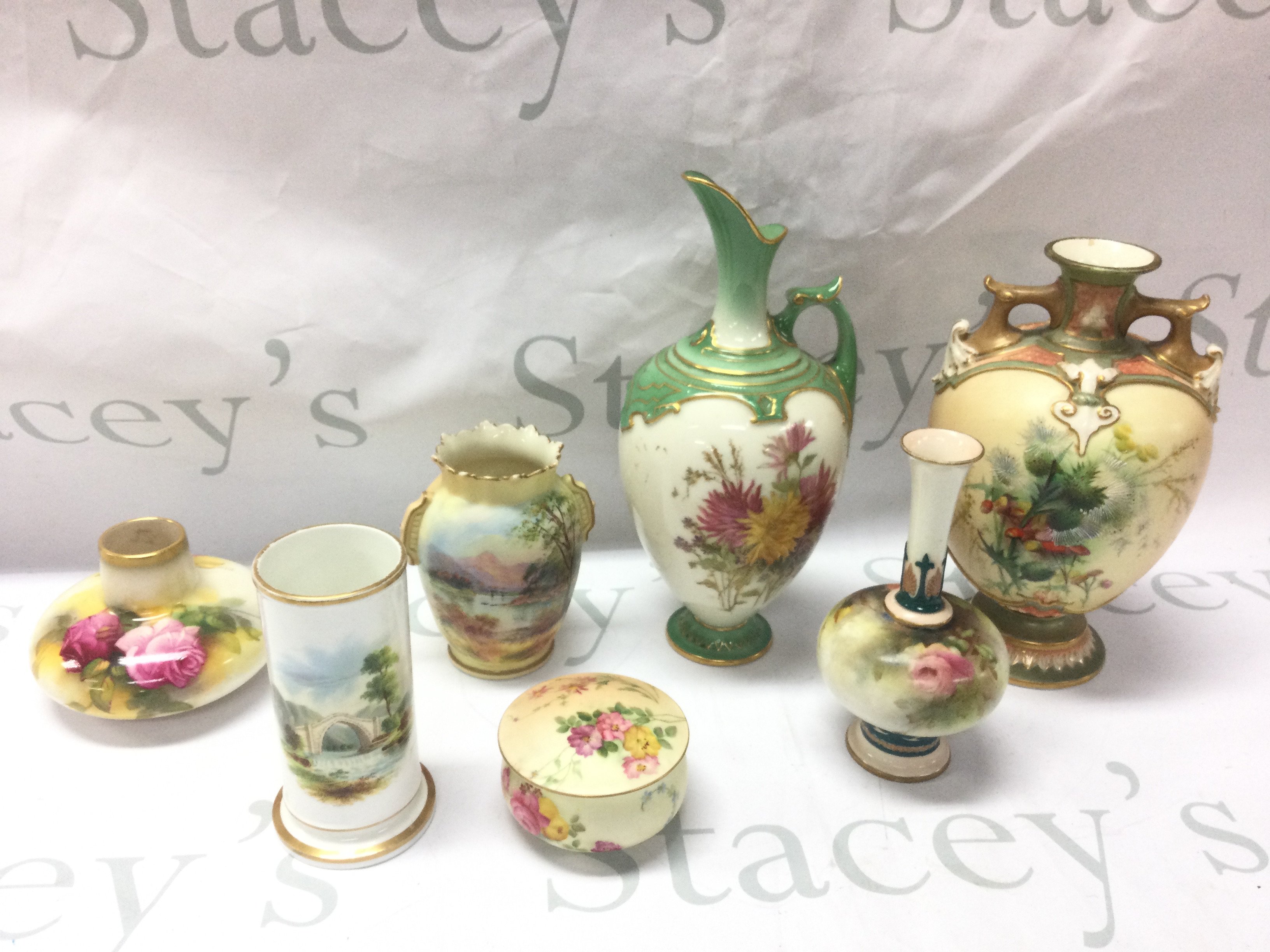 A collection of Royal Worcester Blush Ivory vases and a lidded pot also including a 19th century vase with hand painted bridge scene. 5 to 23cm tall. This lot cannot be posted