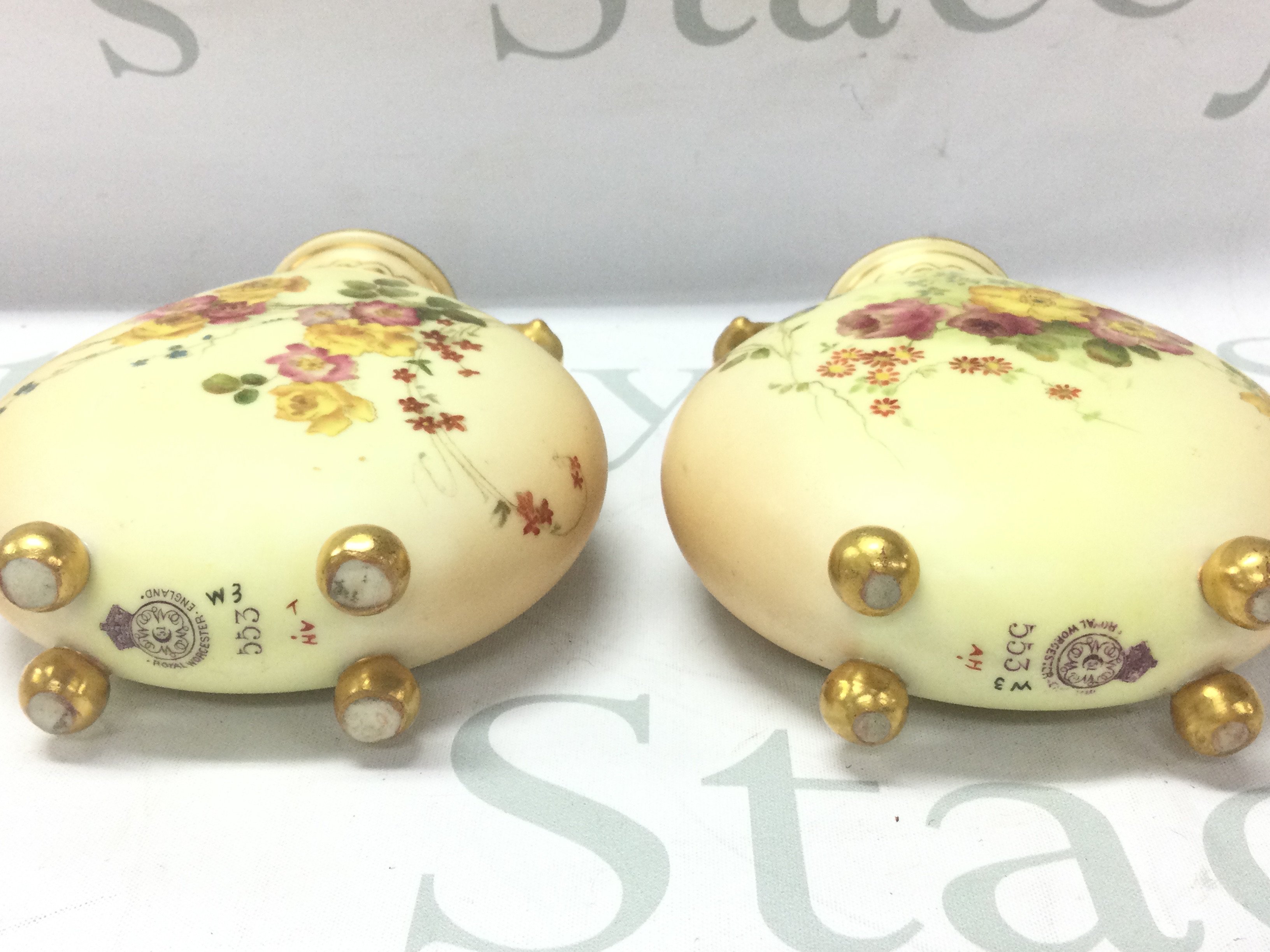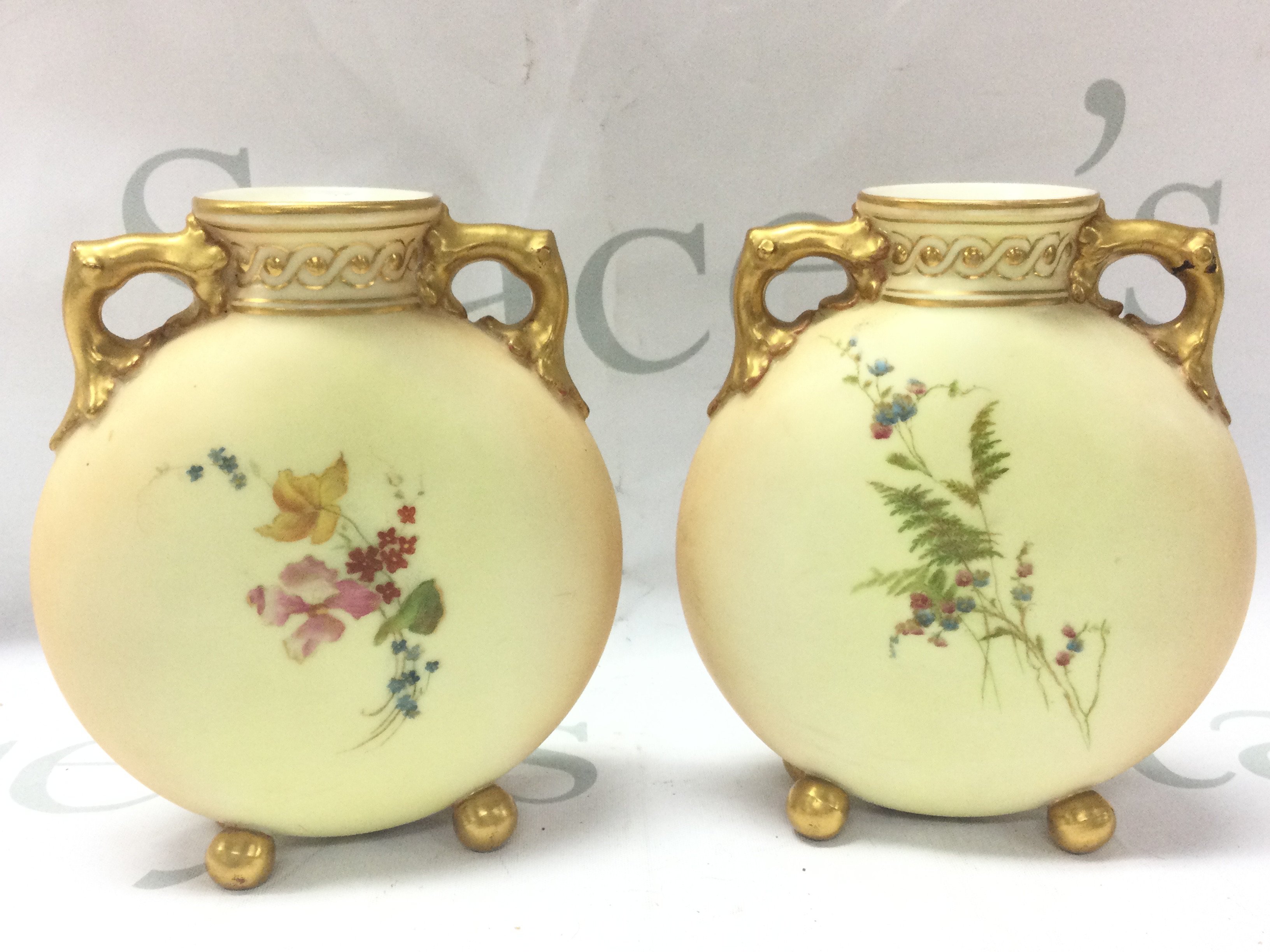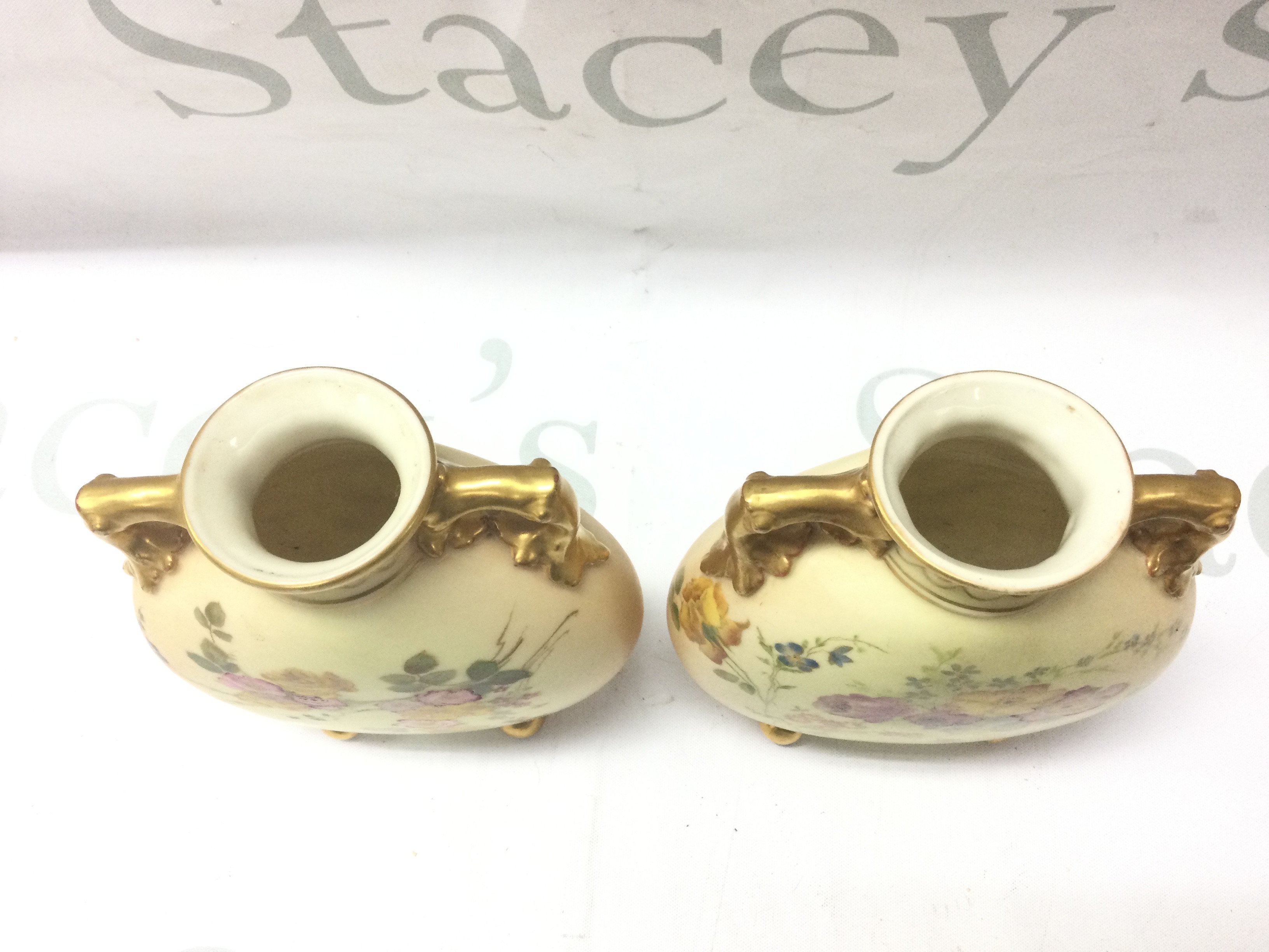 Royal Worcester Blush Ivory moon flash style porcelain vases with floral decoration, gilt handles and feet . 11cm wide 13cm tall. This lot cannot be posted