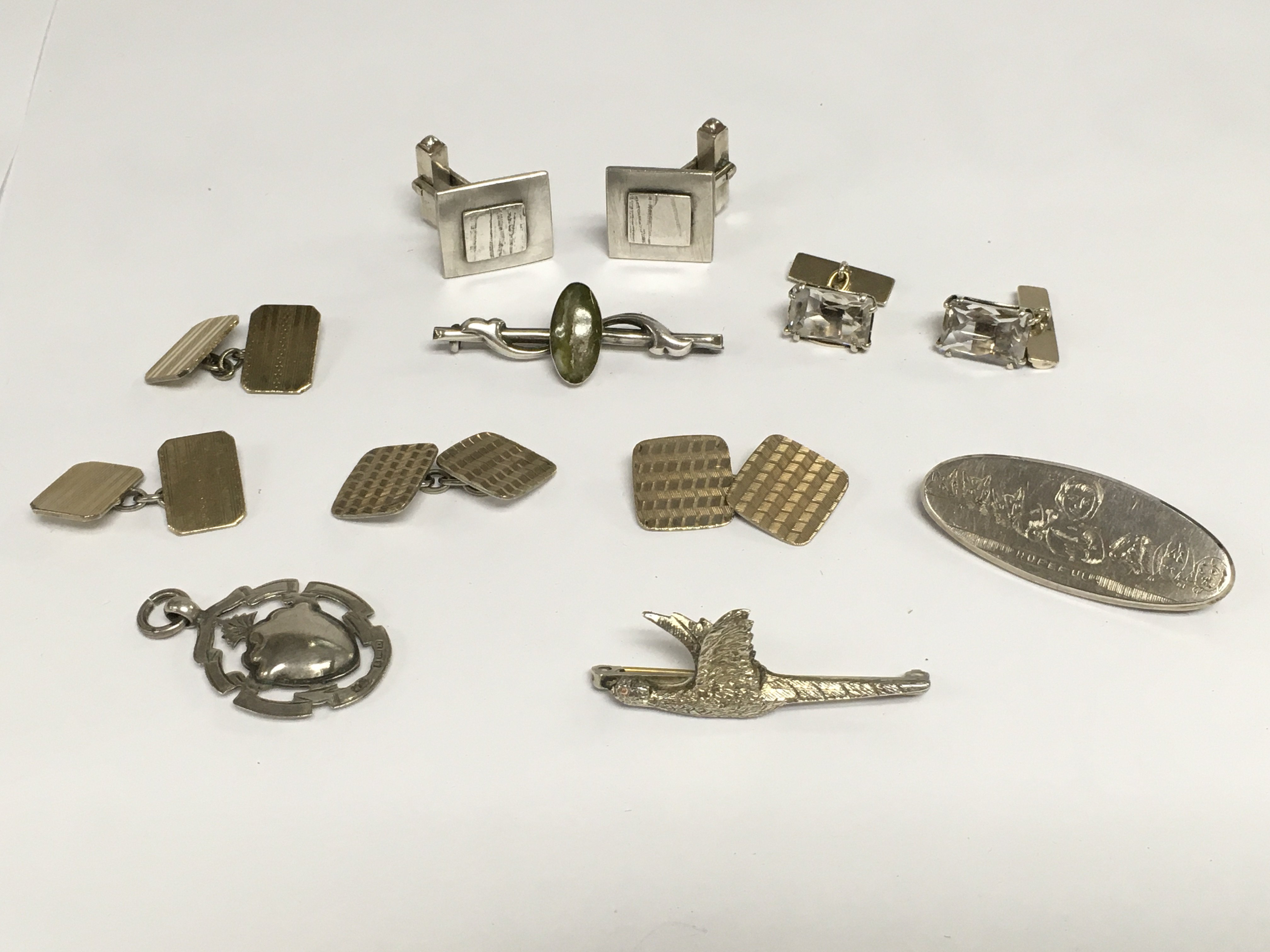A collection of gents silver cufflinks, tie pins, fob etc. Shipping category A.
