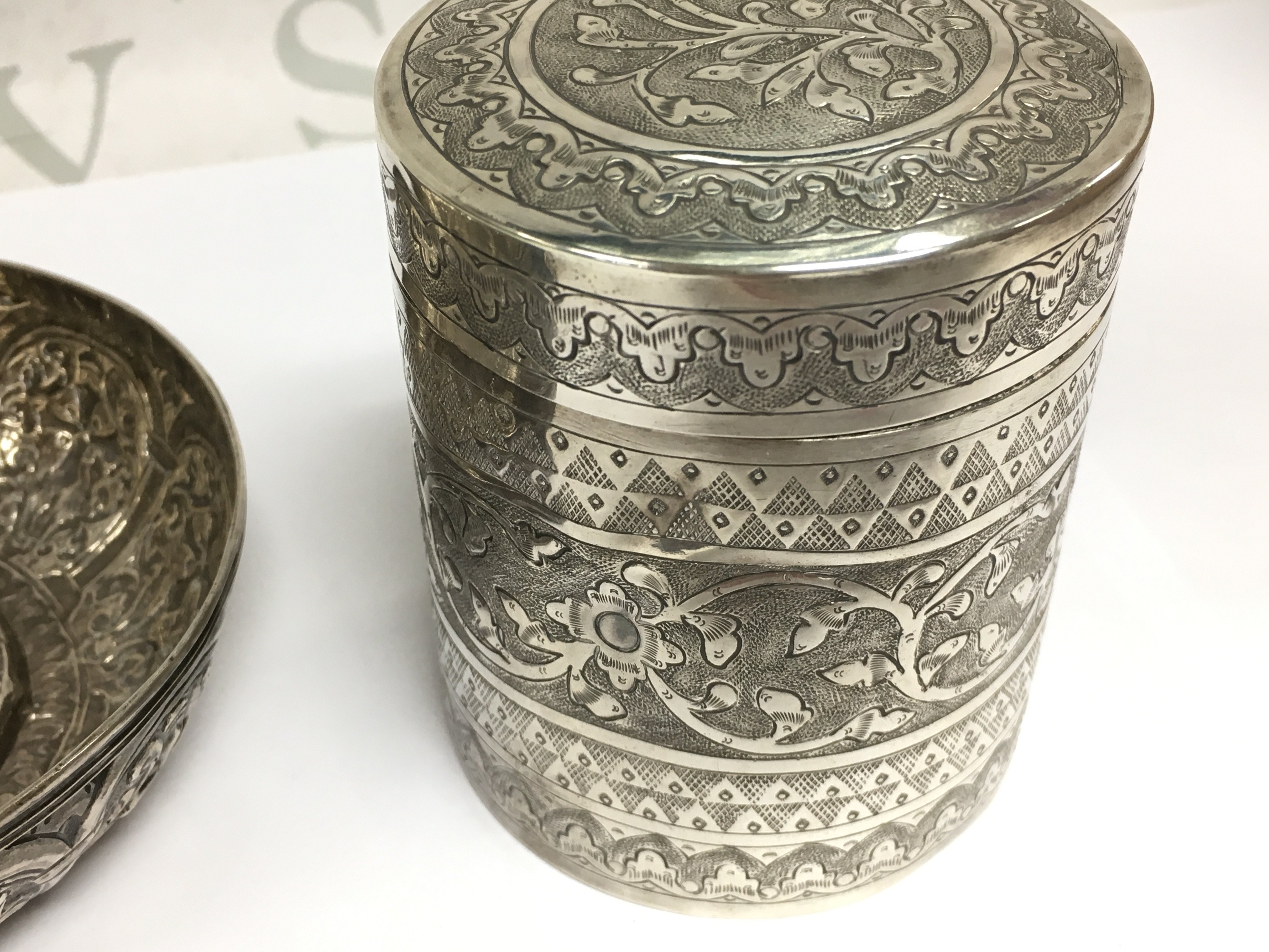 withdrawn - An embossed silver bowl of Indian influence depicting St George and the dragon to the centre, approx diameter 12.5cm plus a silver jar and cover, some damage. Shipping category B.