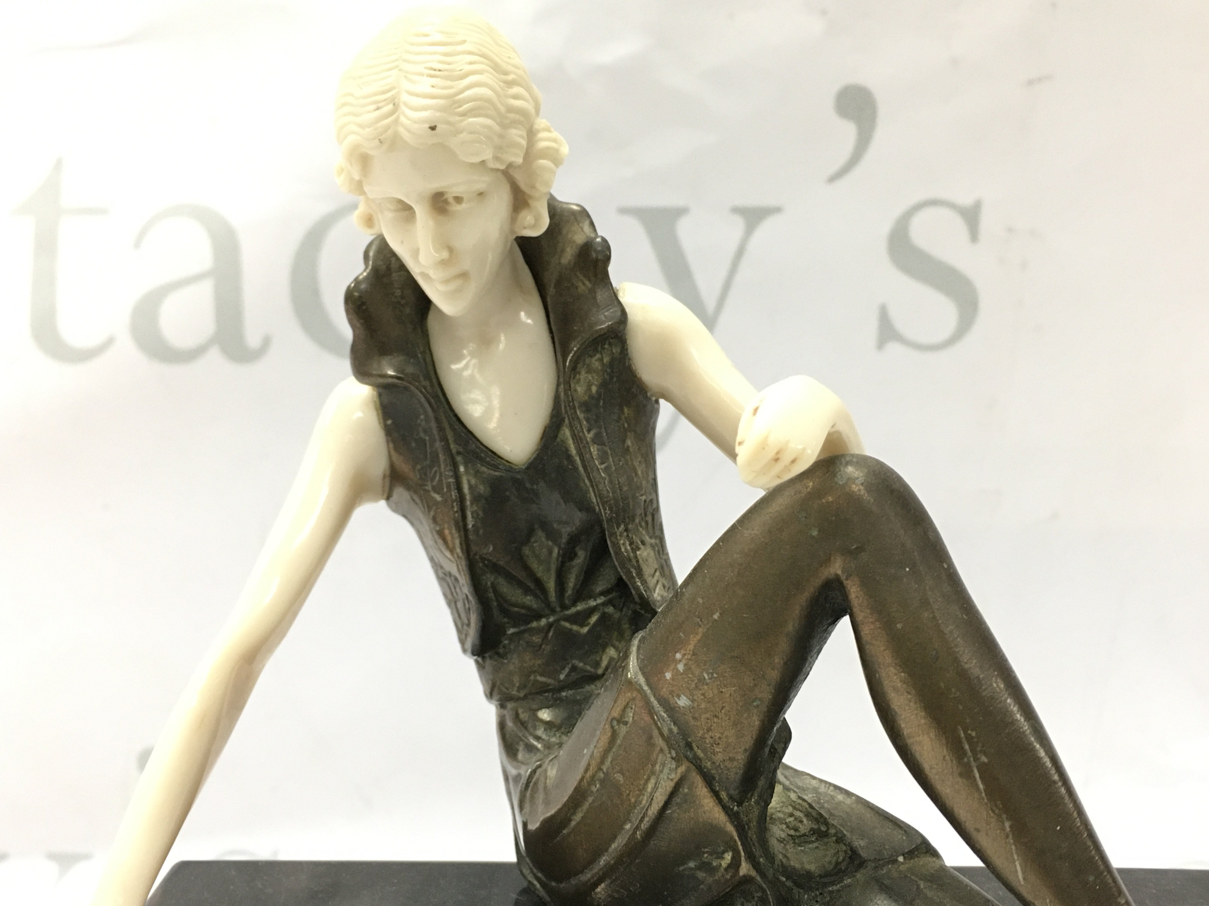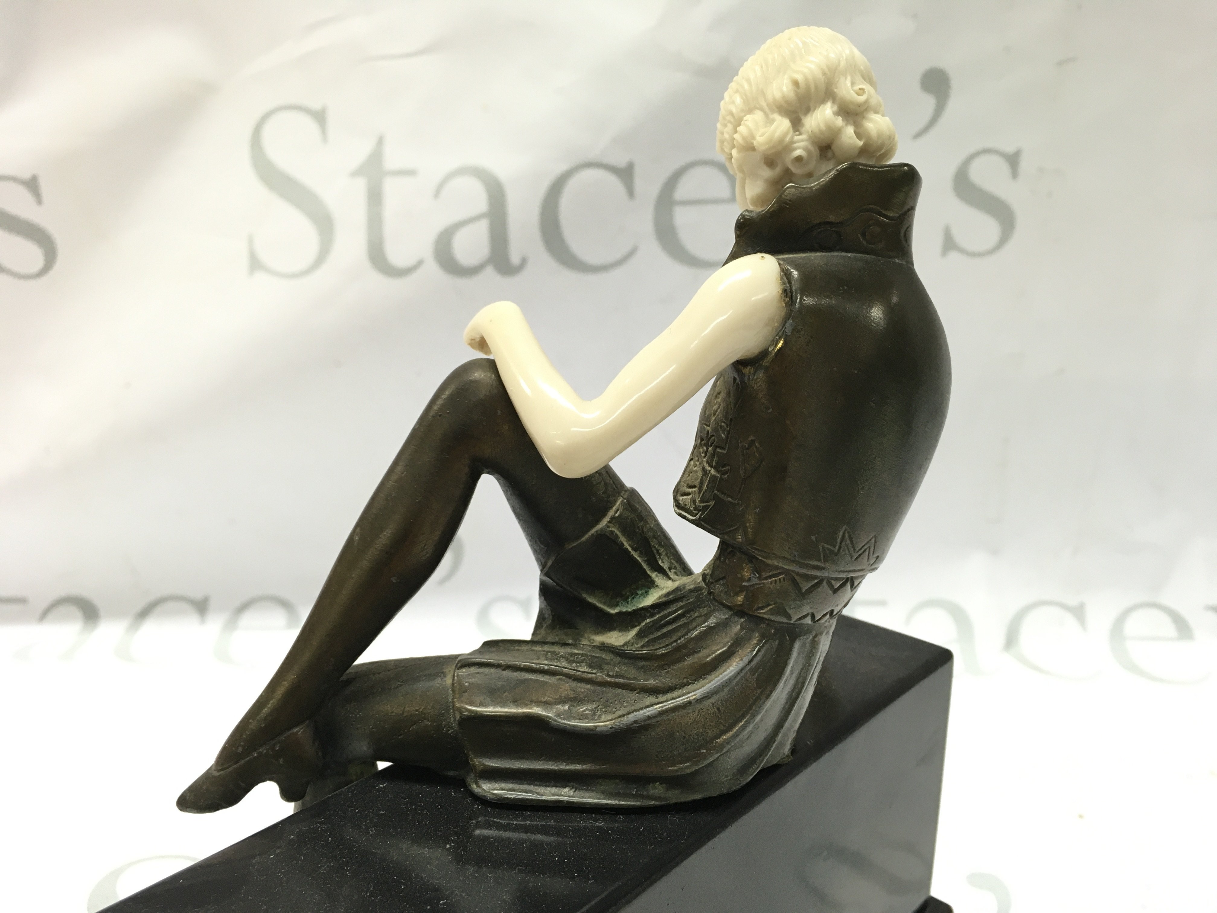 A bronze Art Deco Ferdinand Preiss figure , seated lady on marble base. 22cm tall 18cm wide approximately. Postage category B