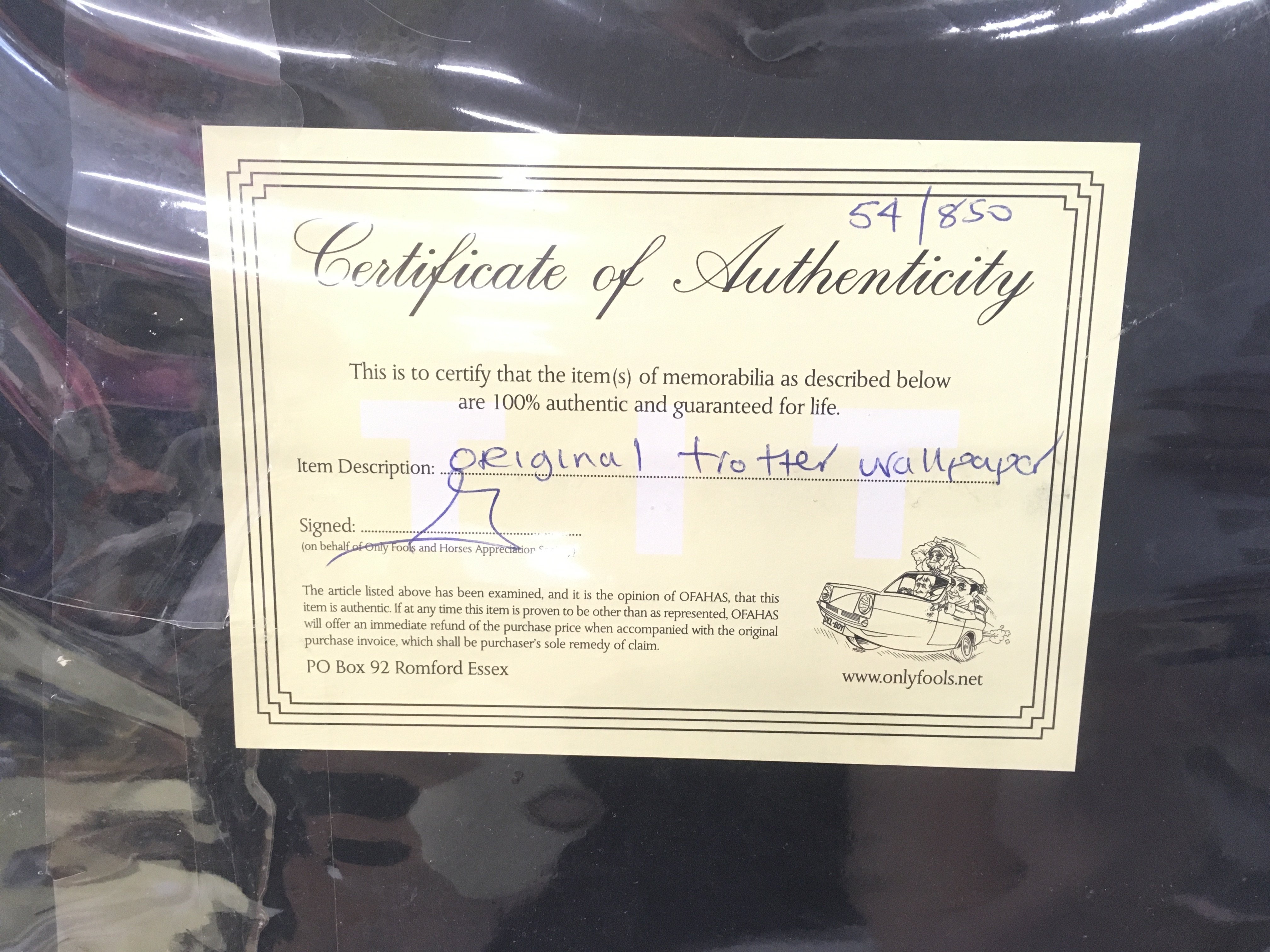 An UnFramed Authentic Only Fools And Horses Piece of Trotter Wallpaper From The 2003 Christmas Special. Limited Edition of 850 Pieces. With Certificate.