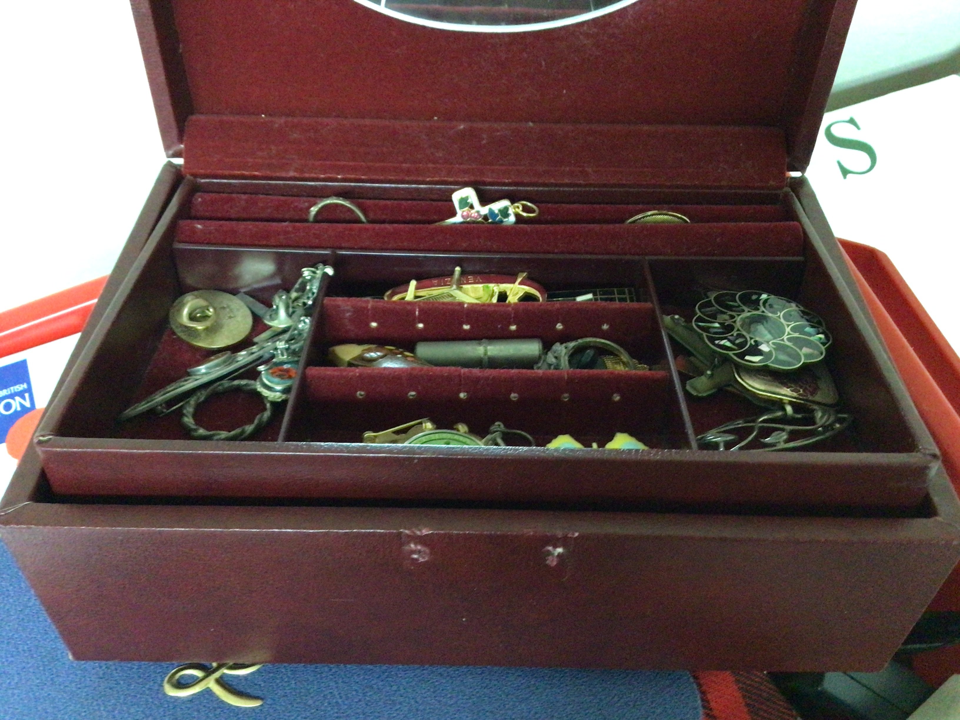 A plastic tub and jewellery box containing a large quantity of costume jewellery including some silver jewellery cultured pearls and other oddments.