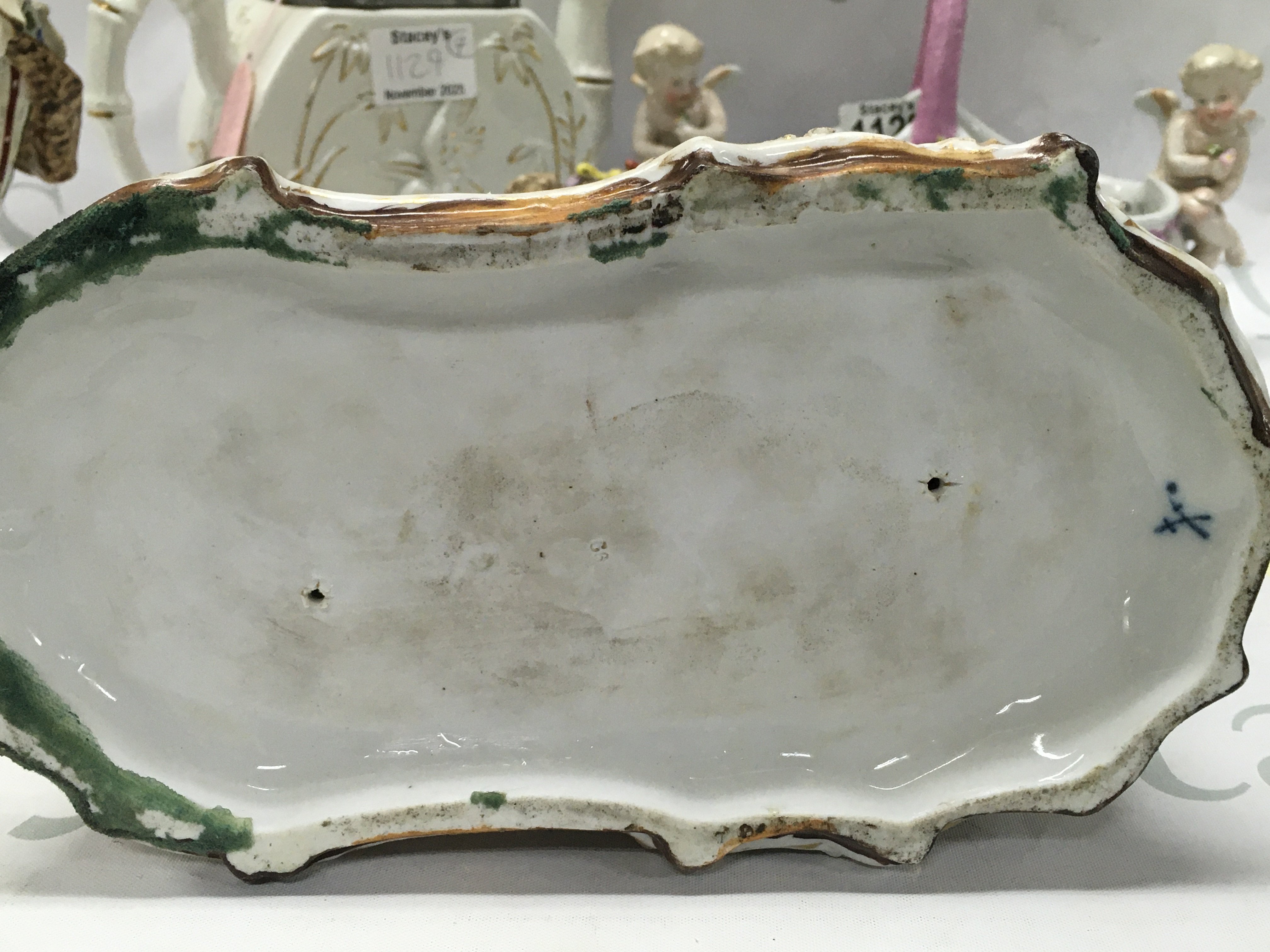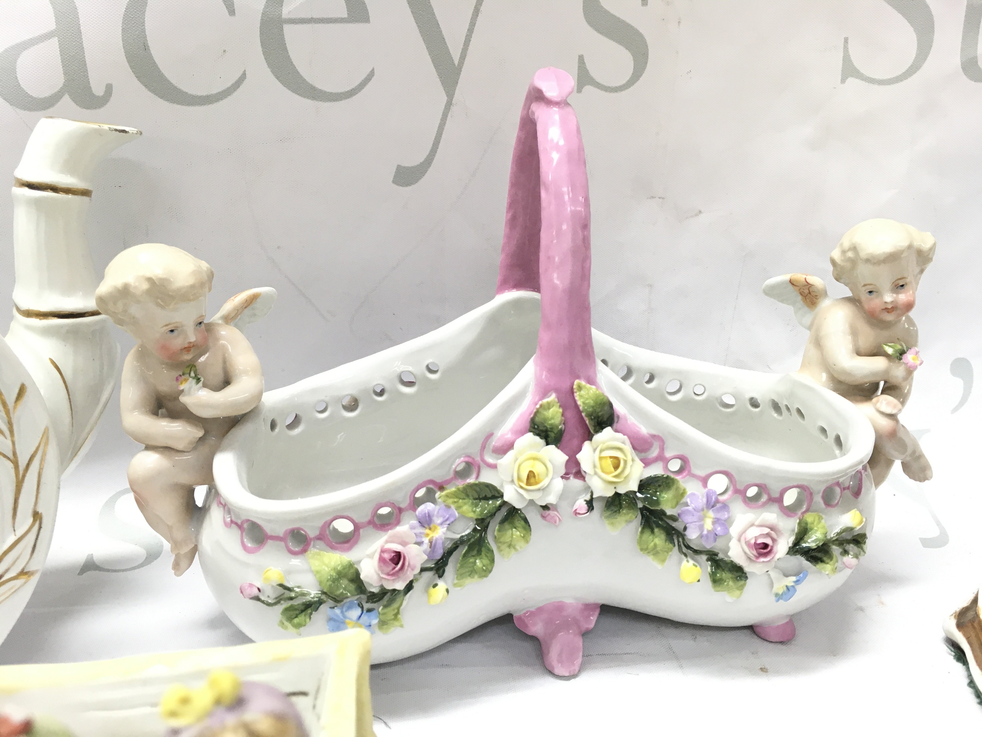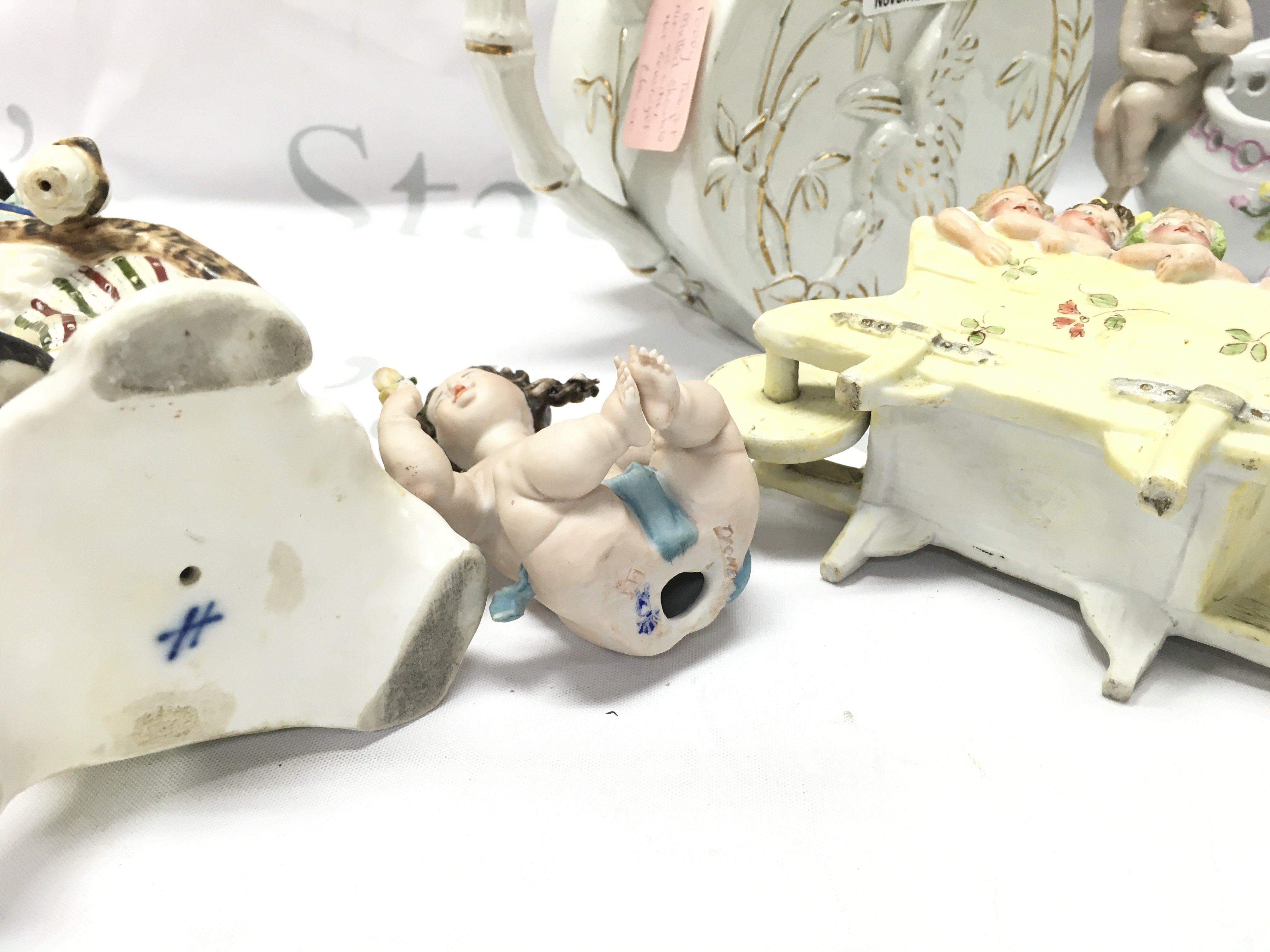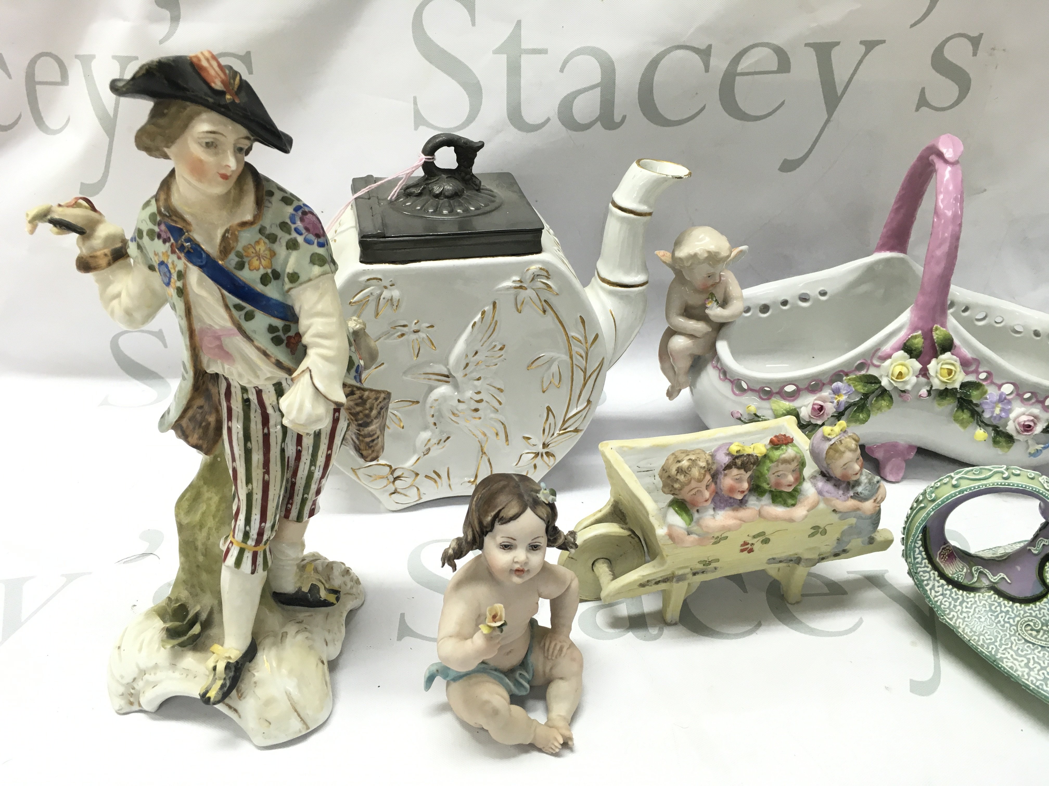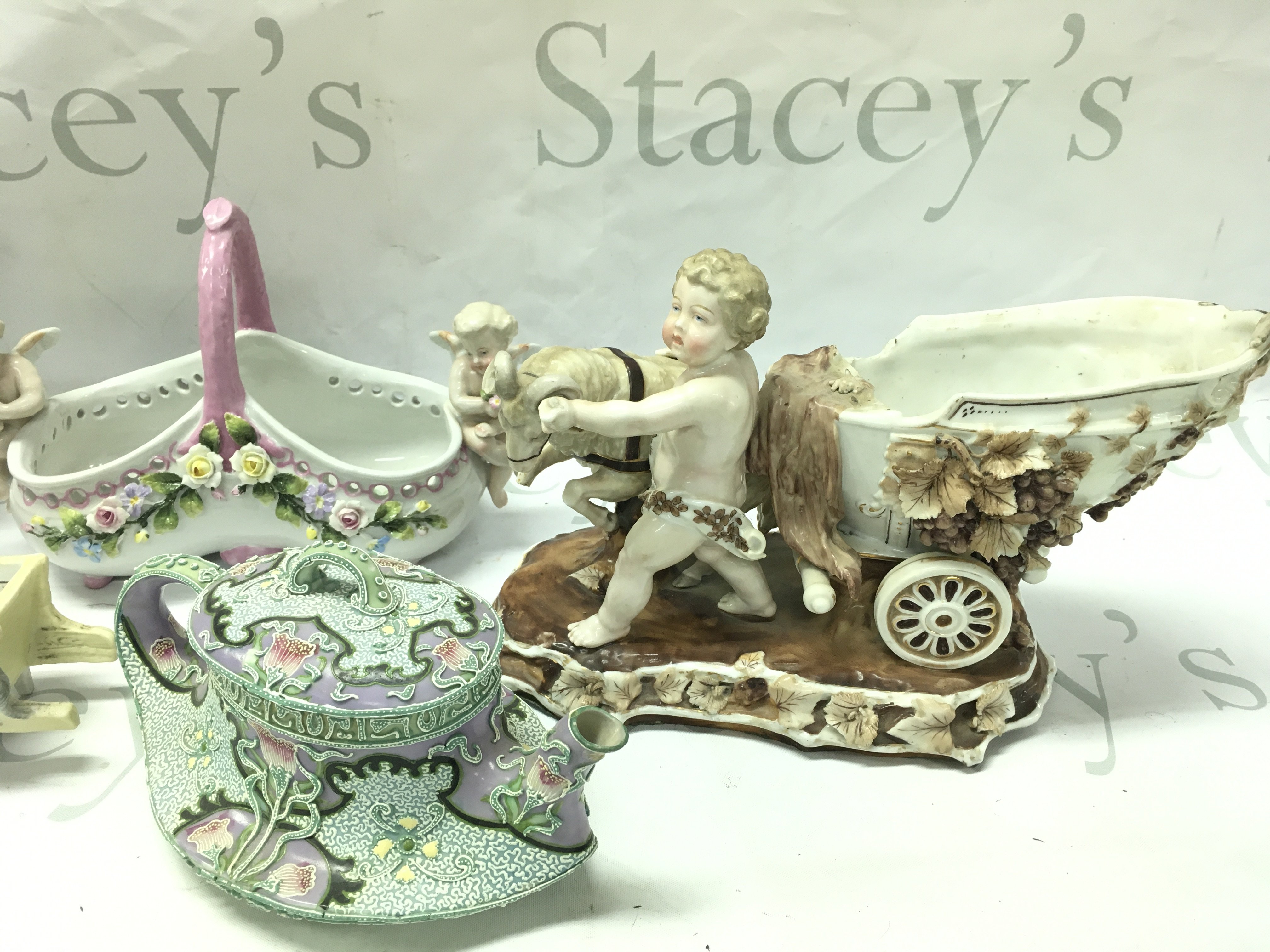 A Collection of early 20th century ceramics including an Crane design teapot, Capodimonte small girl figure , Italian Depose cherub basket , German Putti with chariot and goat figure group. This lot cannot be posted