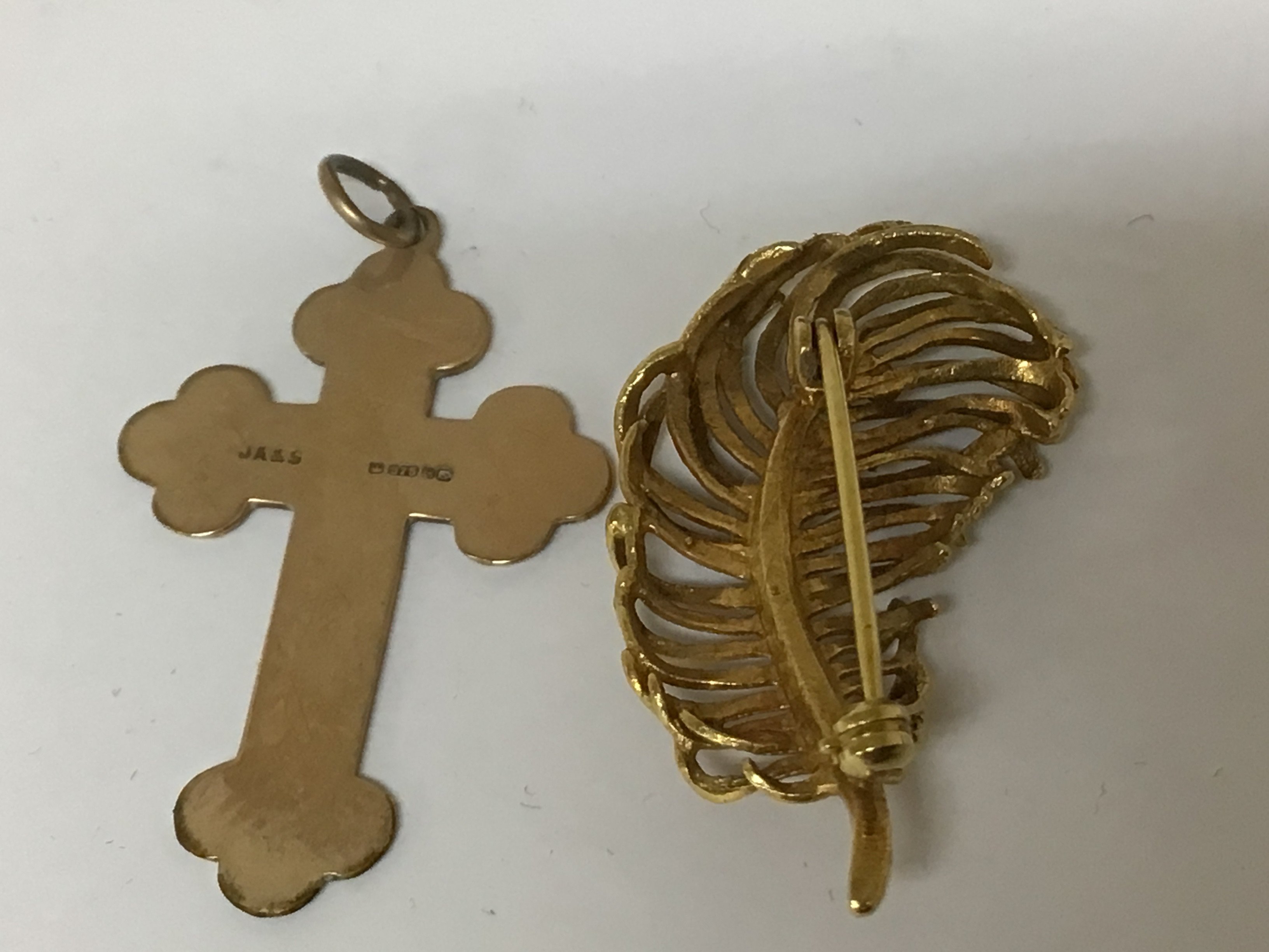 A 9carat gold brooch in the form of a feather and a 9carat gold cross pendent total weight 5.6g