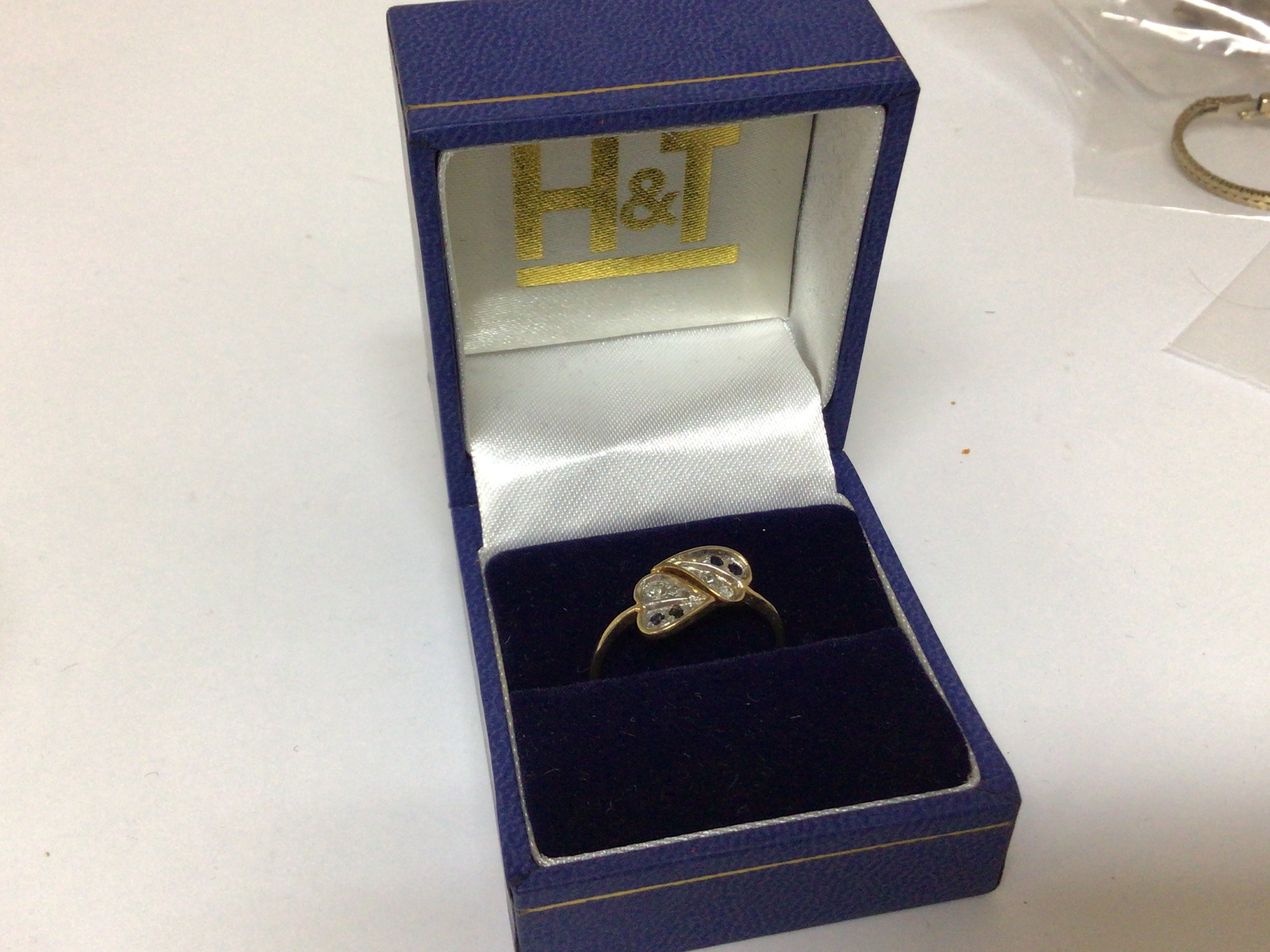 A 9carat gold ring set with a pattern of sapphire and small diamond in shaped naturalistic heart form weight 1.6g