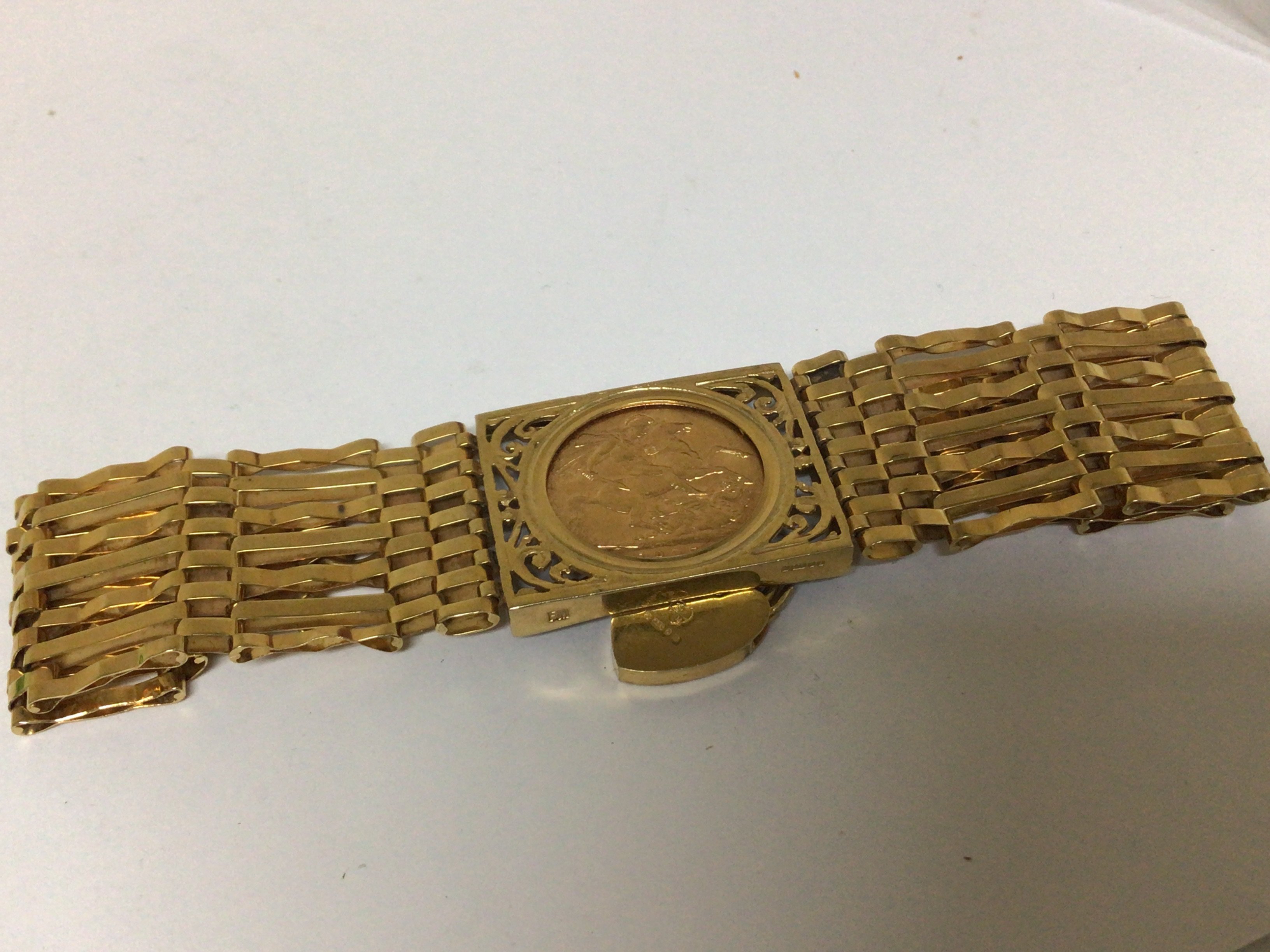 A 9cart gold gate bracelet set with a 1907 Sovereign total weight 27g