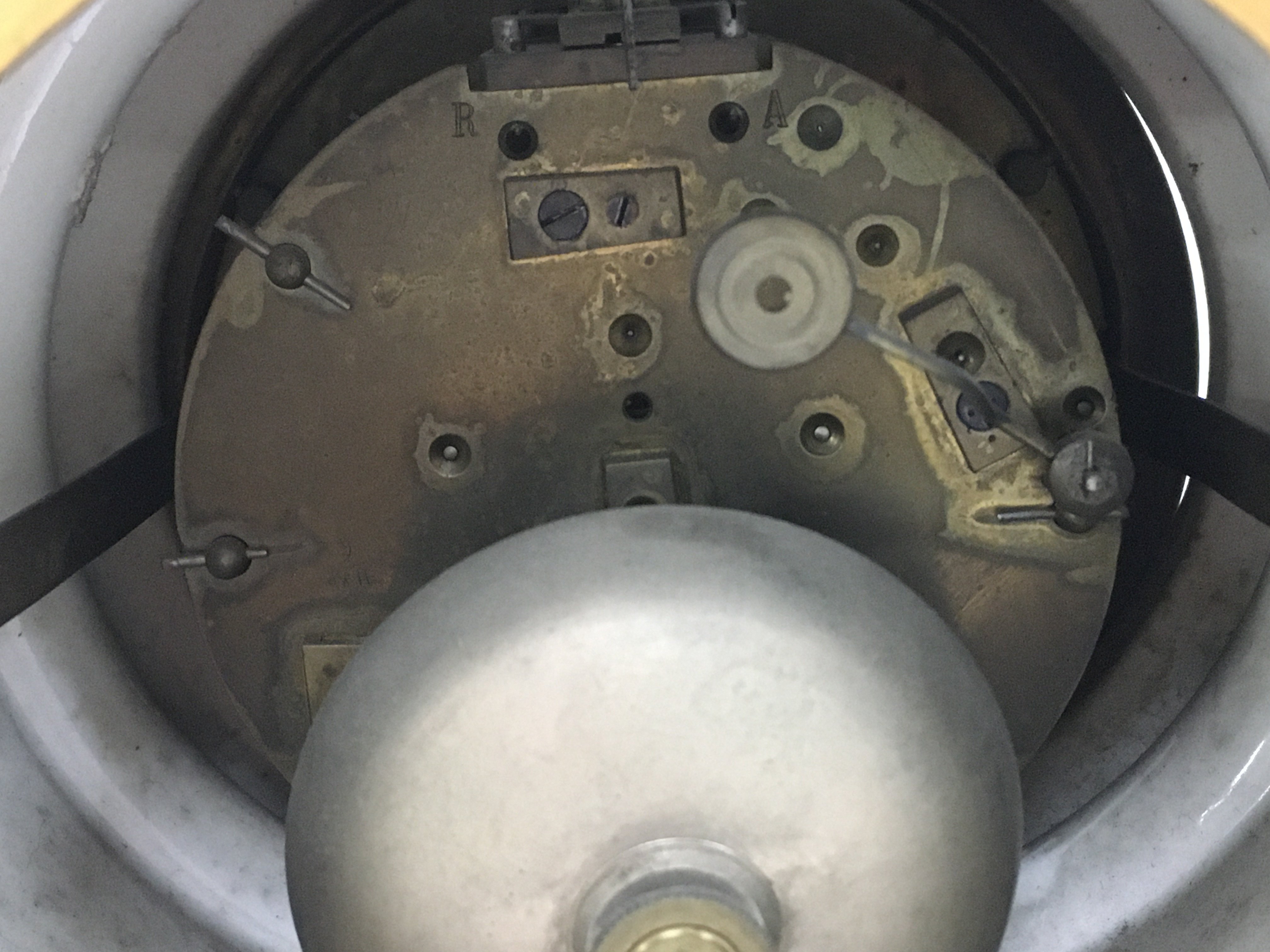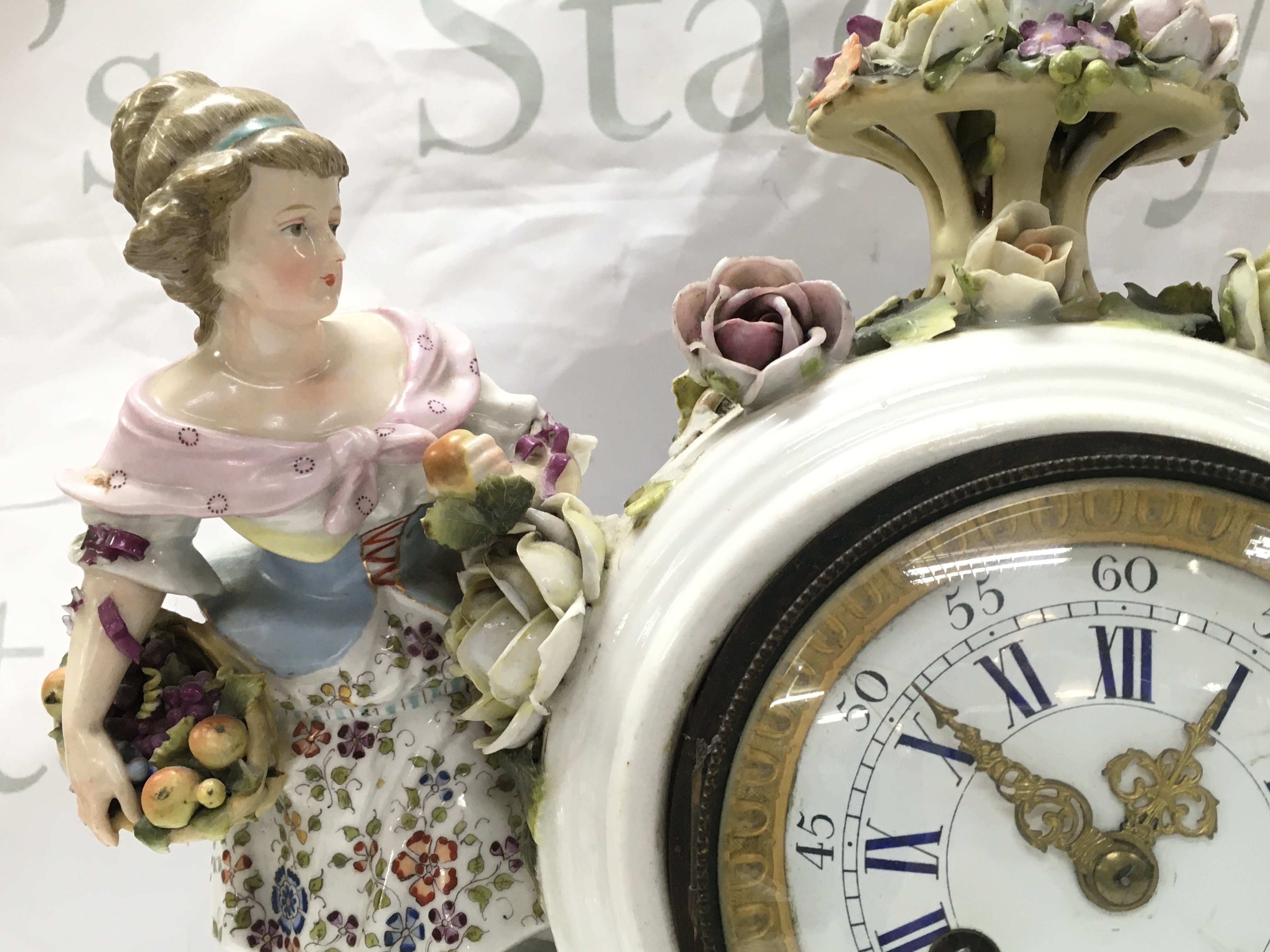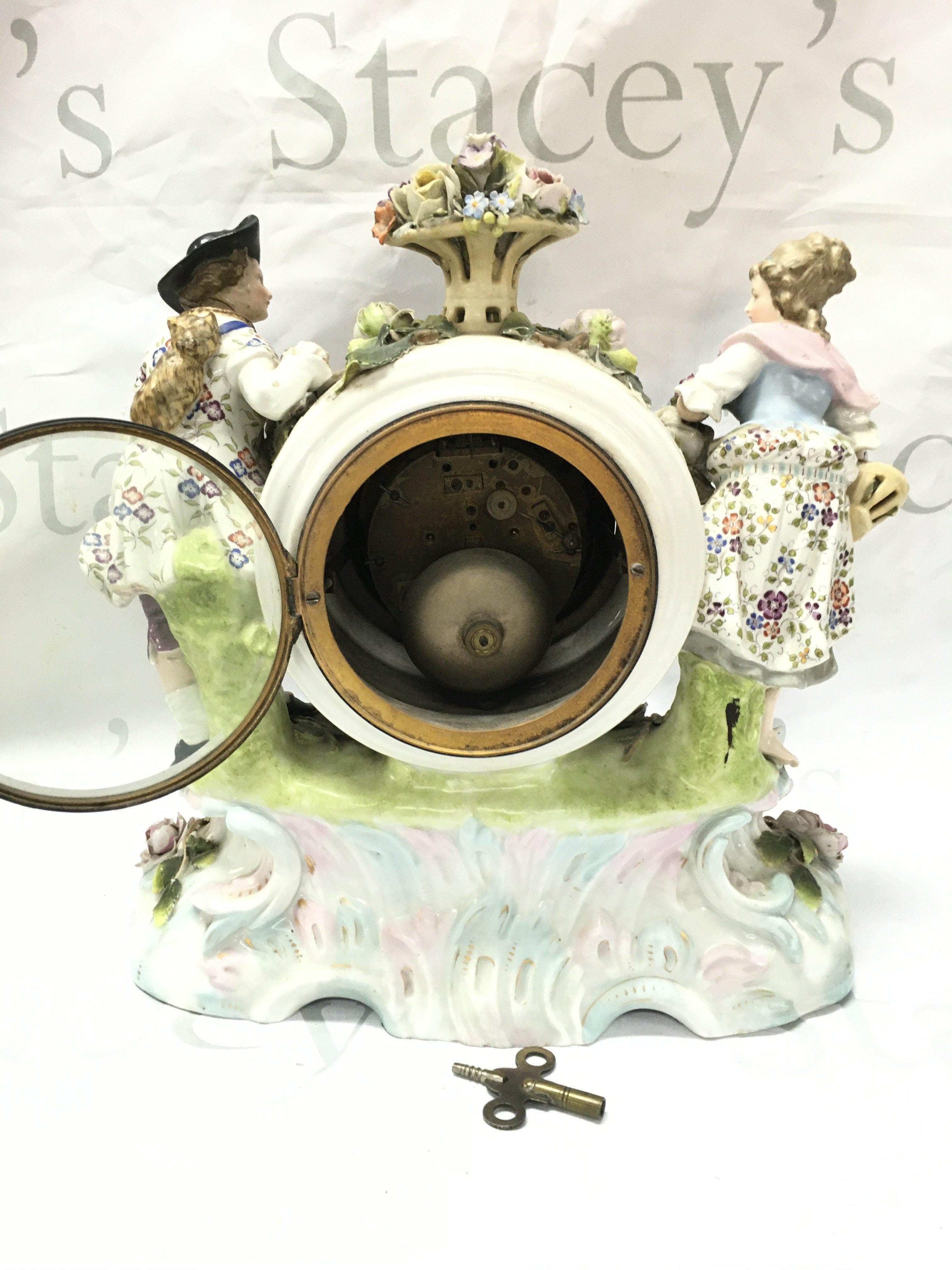 A porcelain clock with raised figures, encrusted with flowers . French movement. Hand missing. Male figures head is damaged. 32cm tall 30cm wide