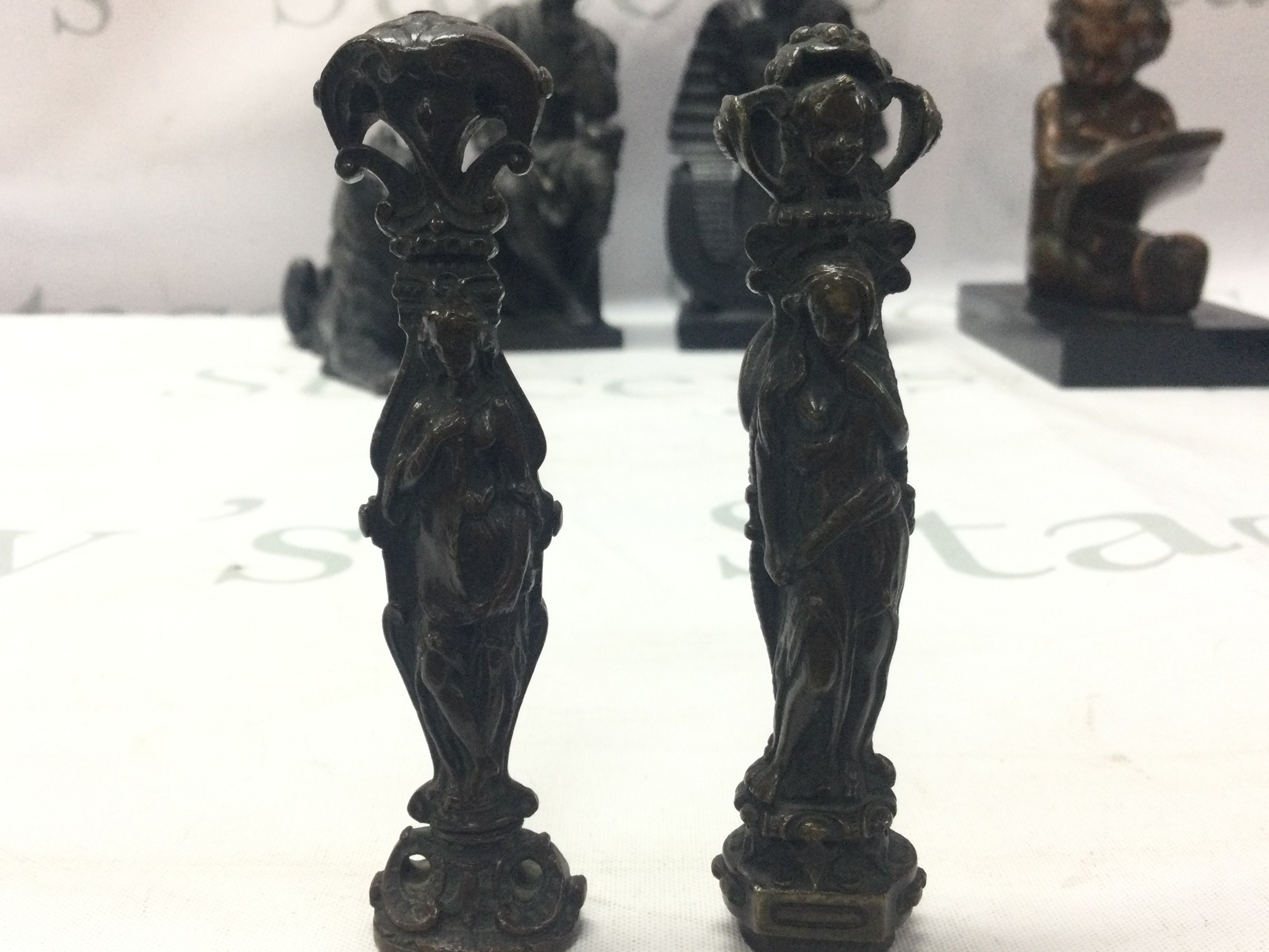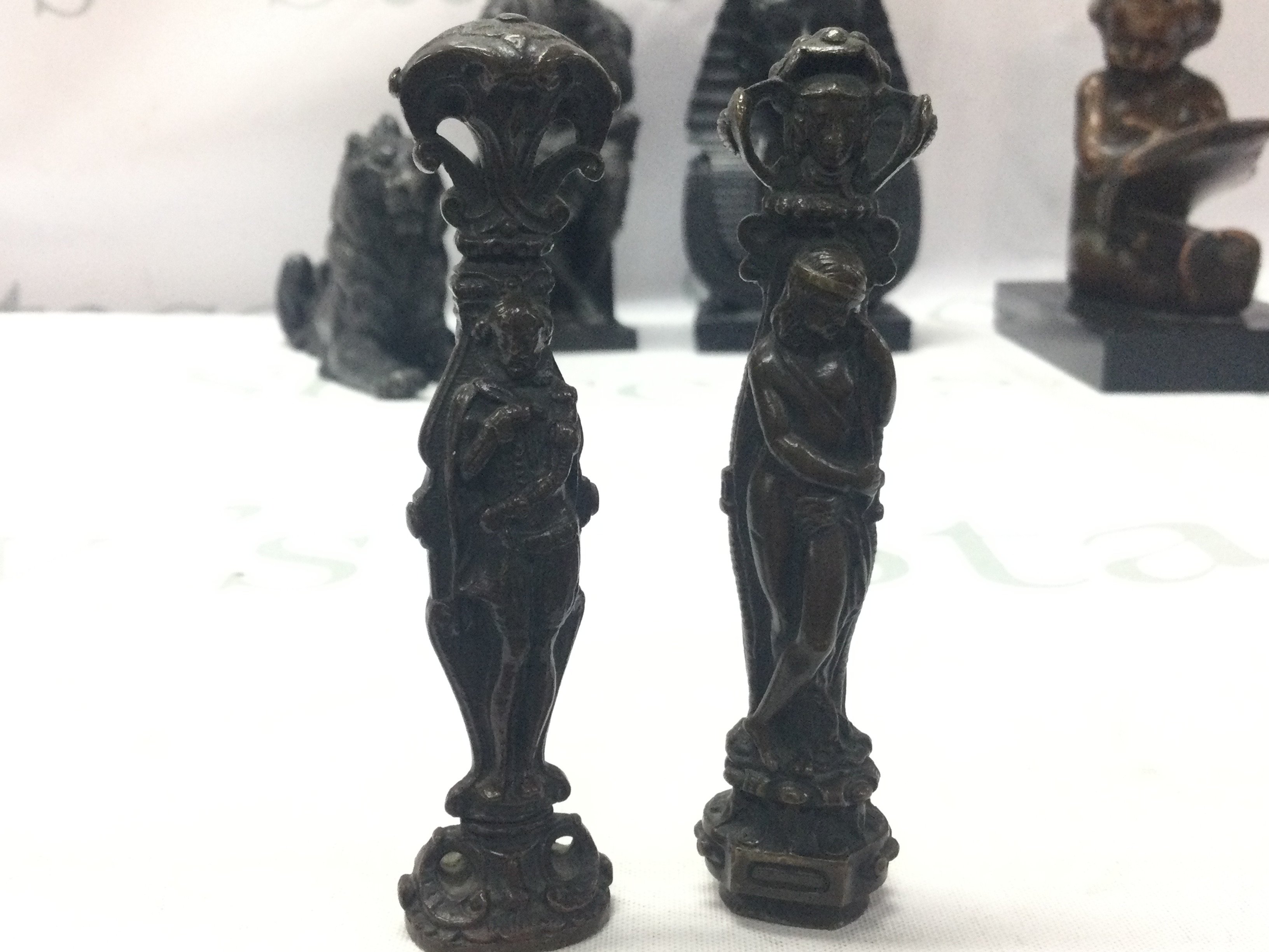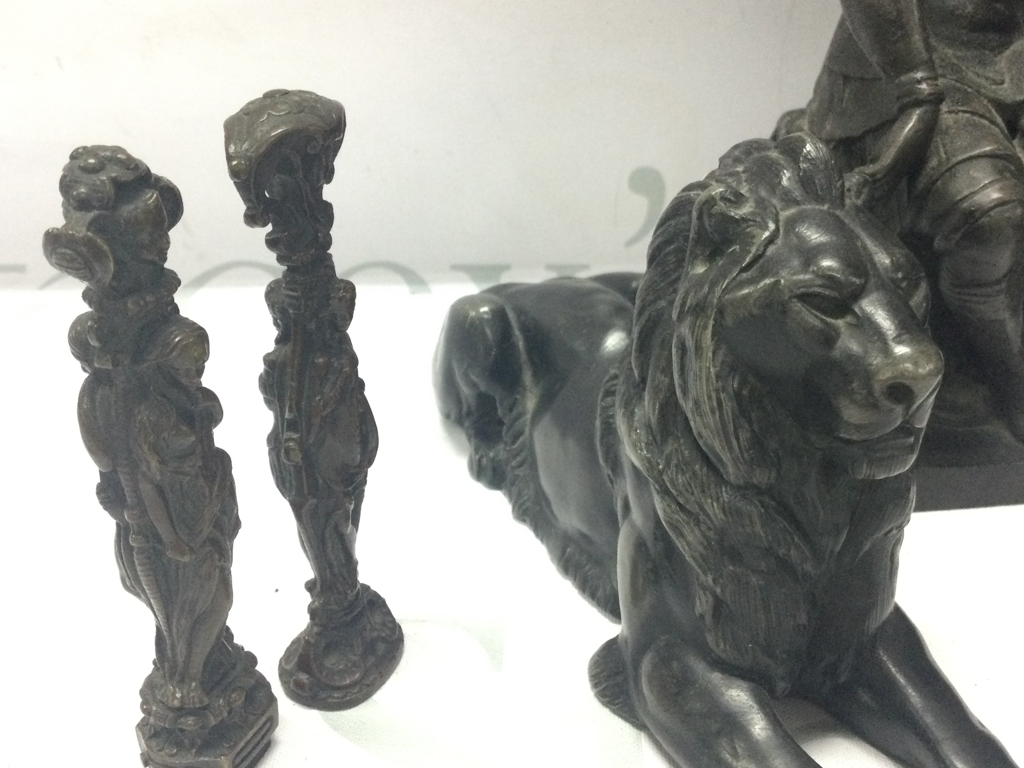 A Tutankhamen bust, lion figure, child reading book , Lorenzo di Piero de Medici figure, bronze figures desk seals. Postage category C