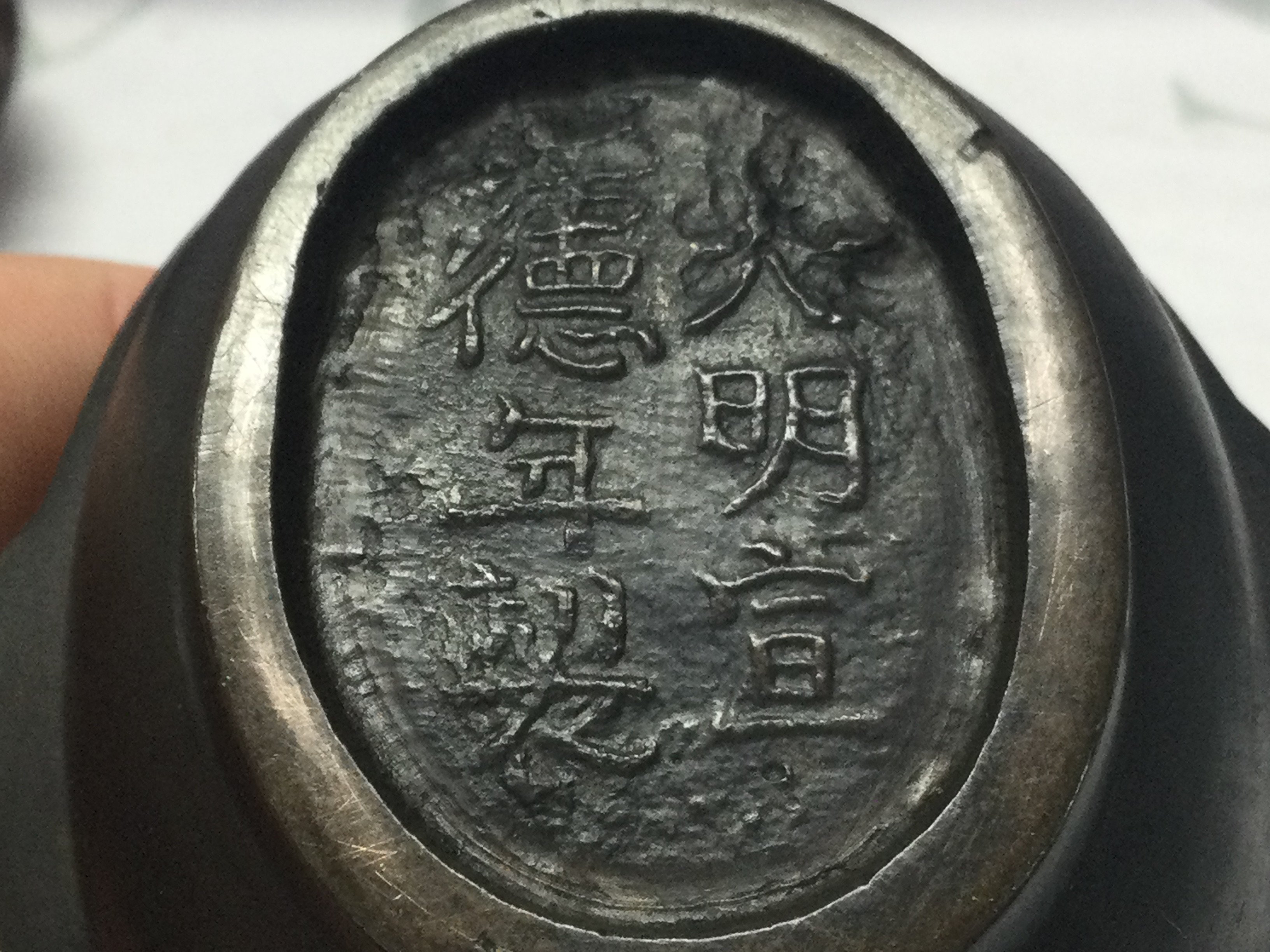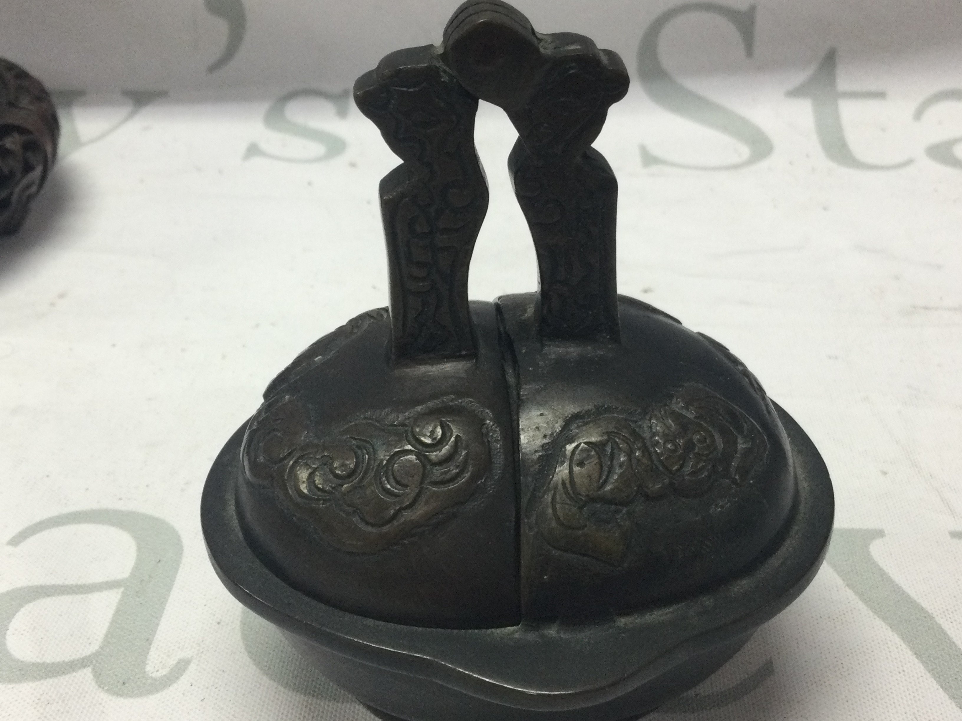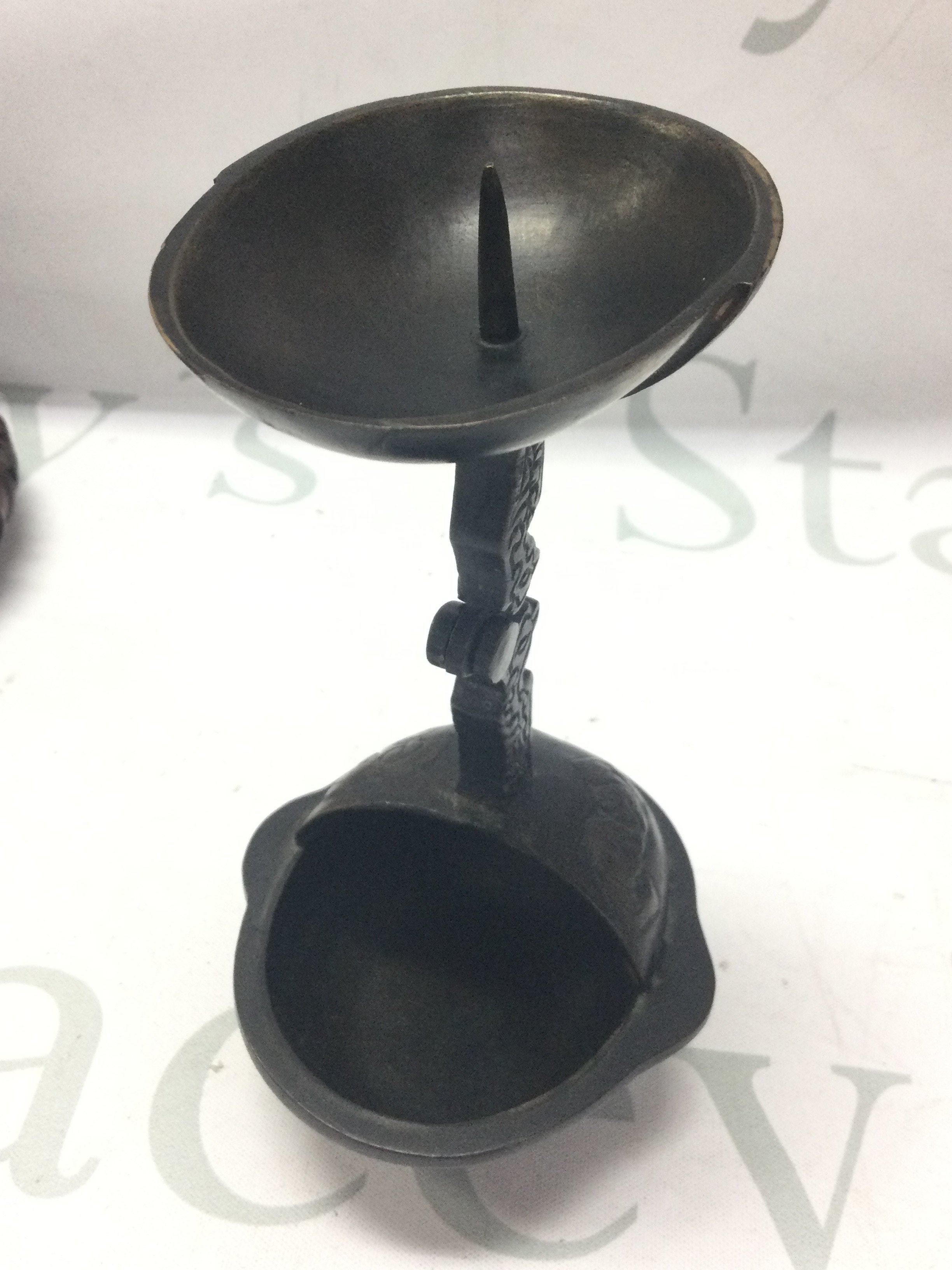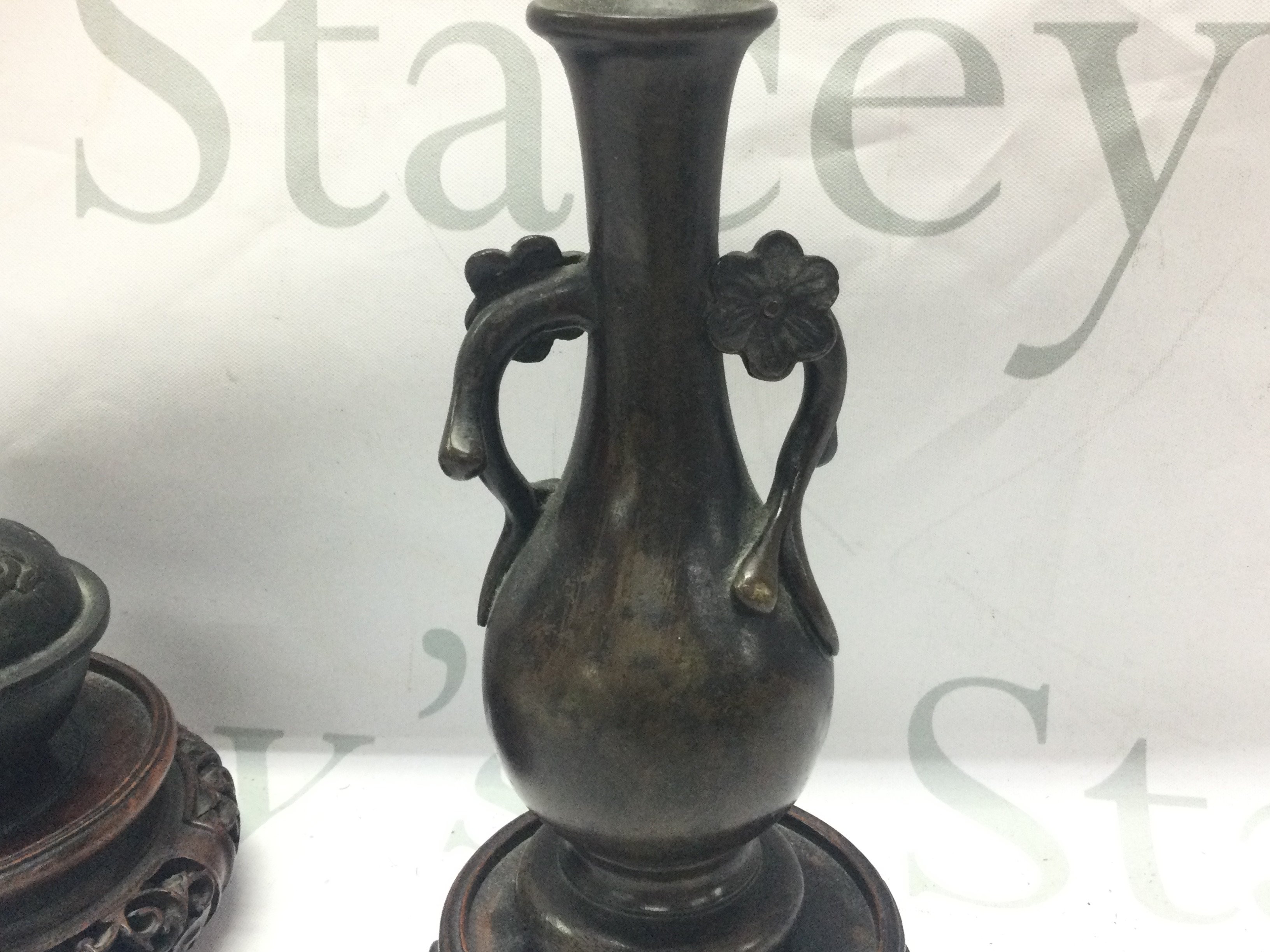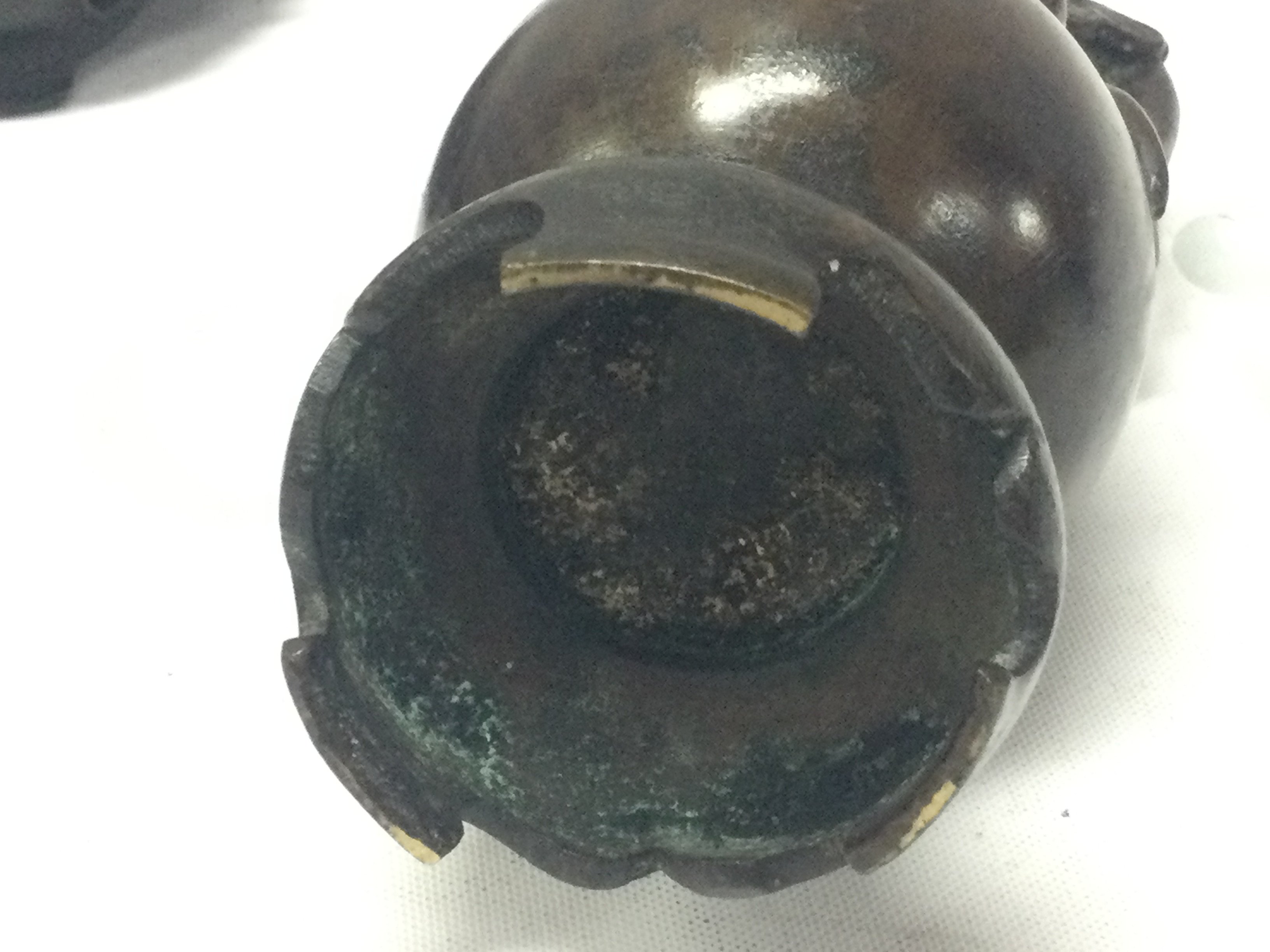 An unusual Bronze Chinese foldable candlestick with a six character mark to base and a bronze Japanese flower vase . 9 and 15cm tall. Postage category B