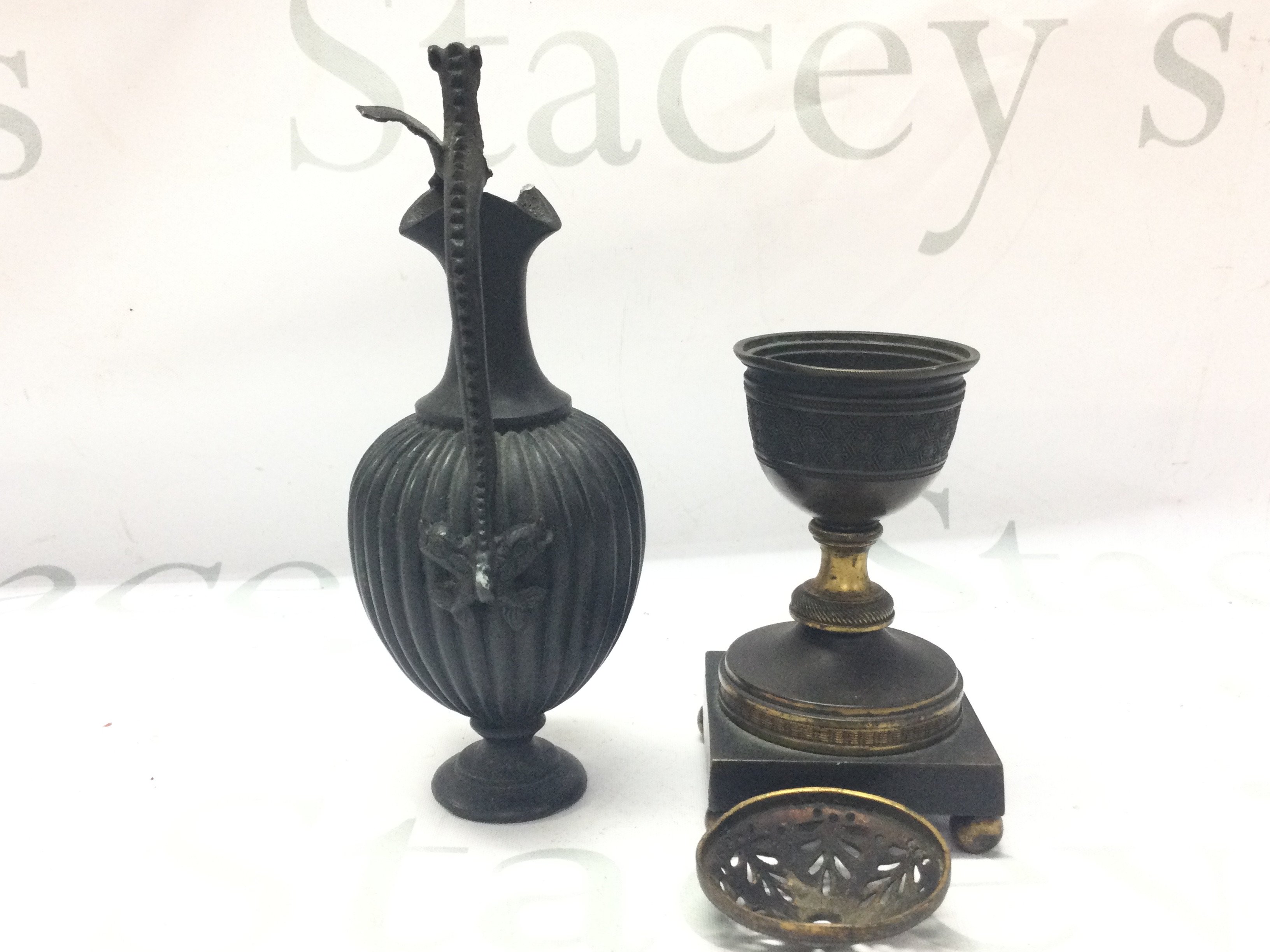A small bronze ewer and a George III gilt metal pot porri 13 and 17cm tall. Postage category B