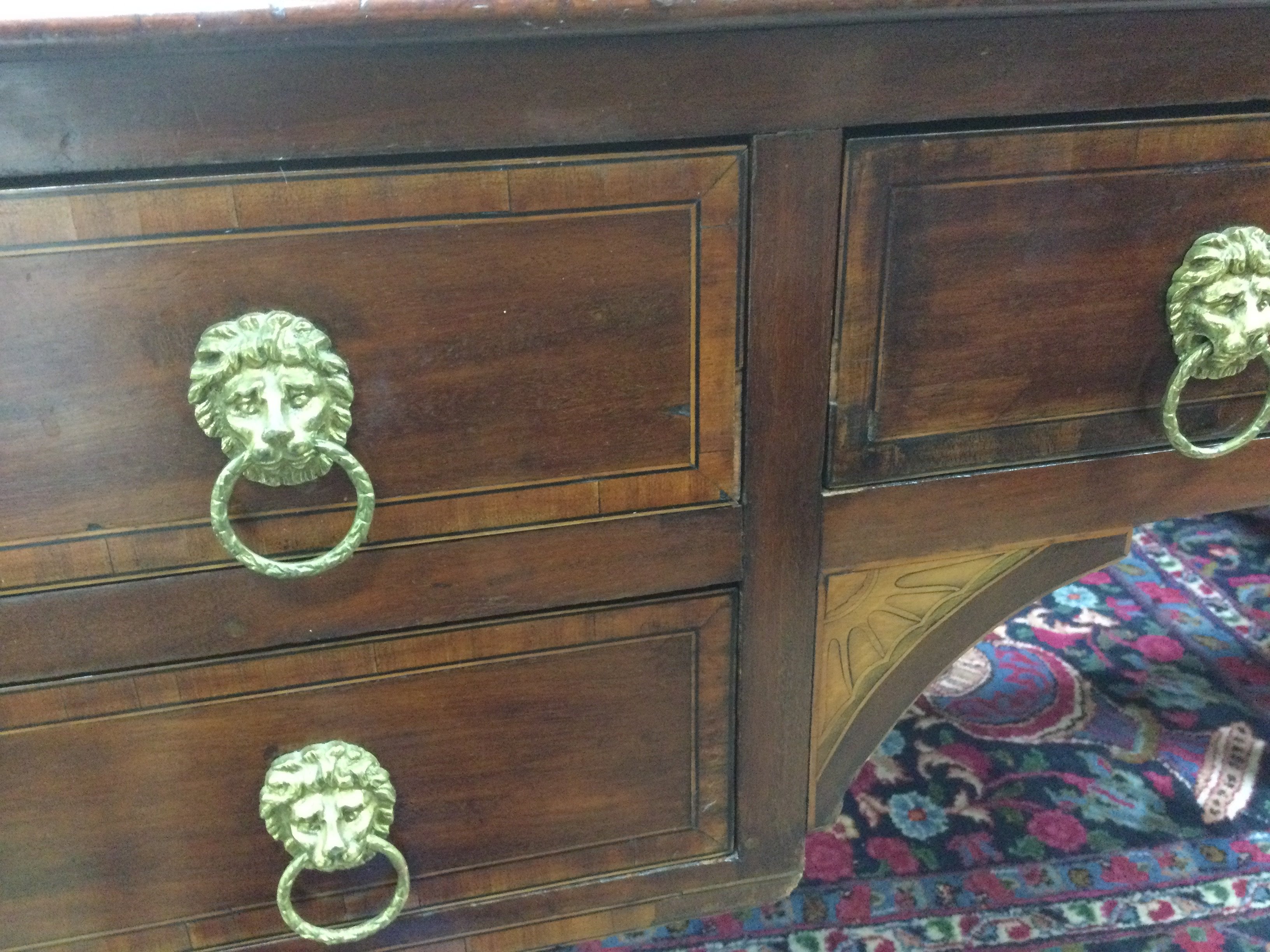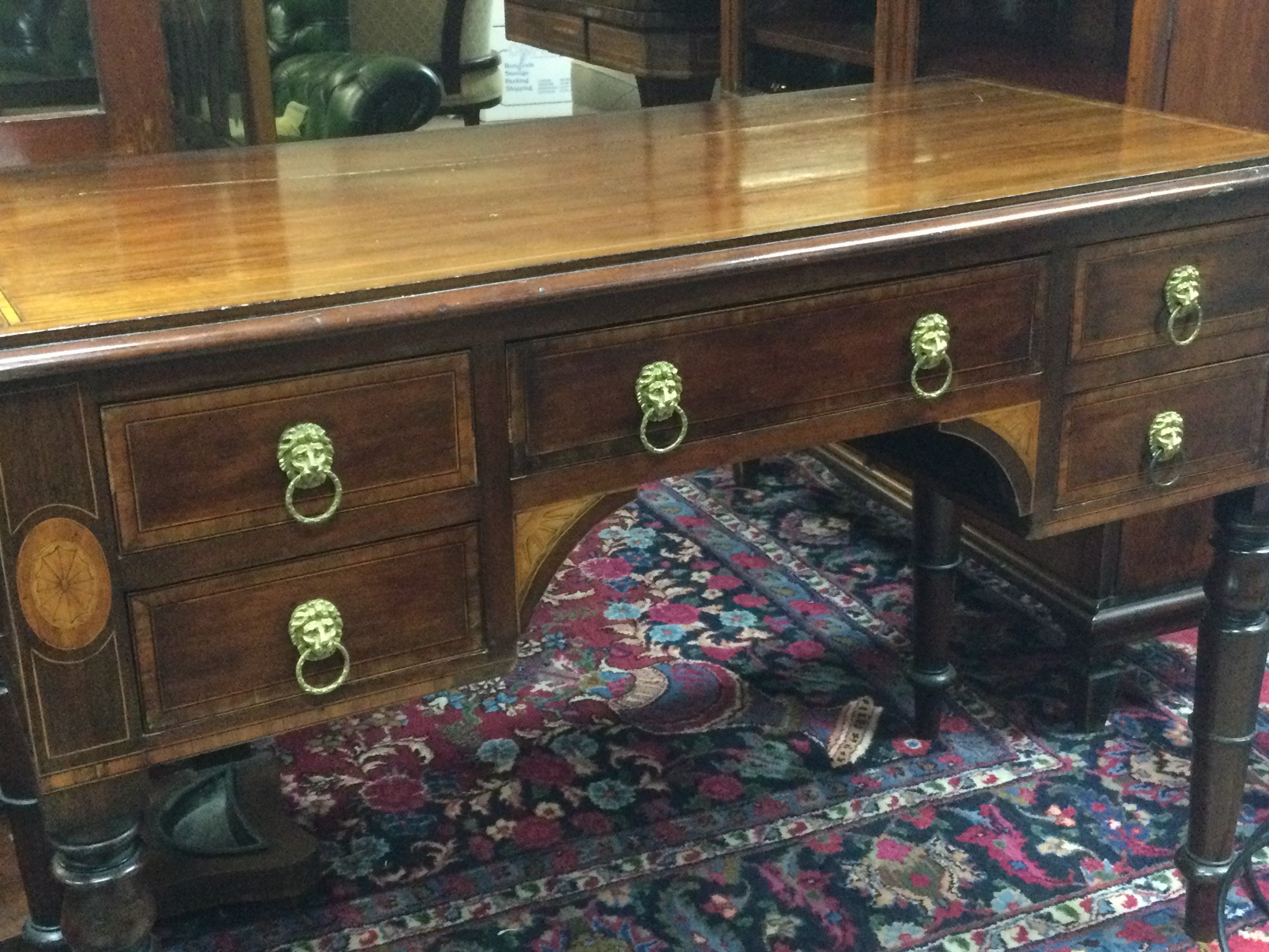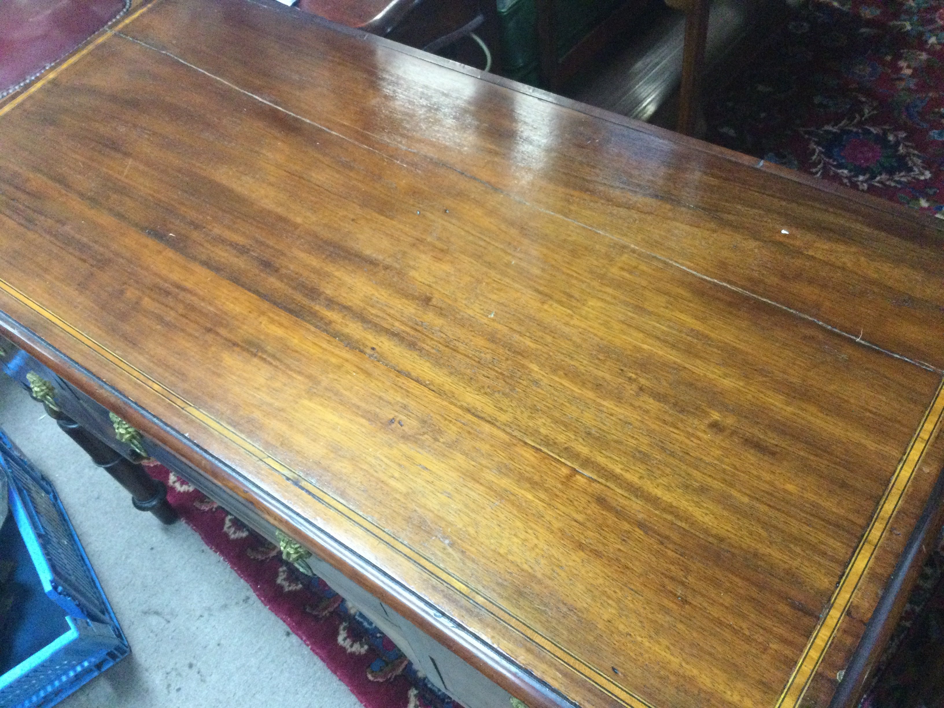 An inlaid mahogany desk fitted with drawers on turned legs , dimensions 104cm wide 50cm deep 75cm tall
