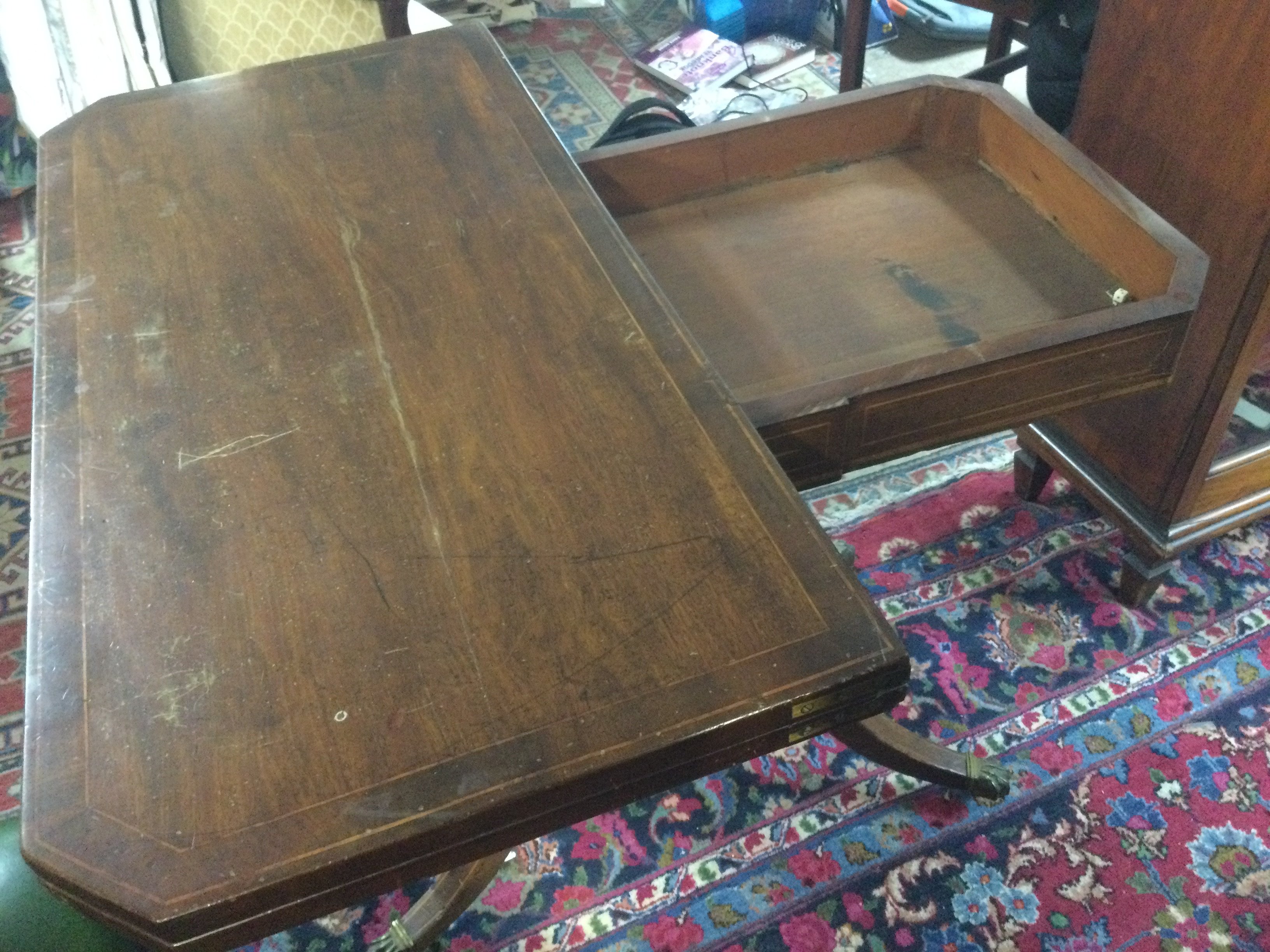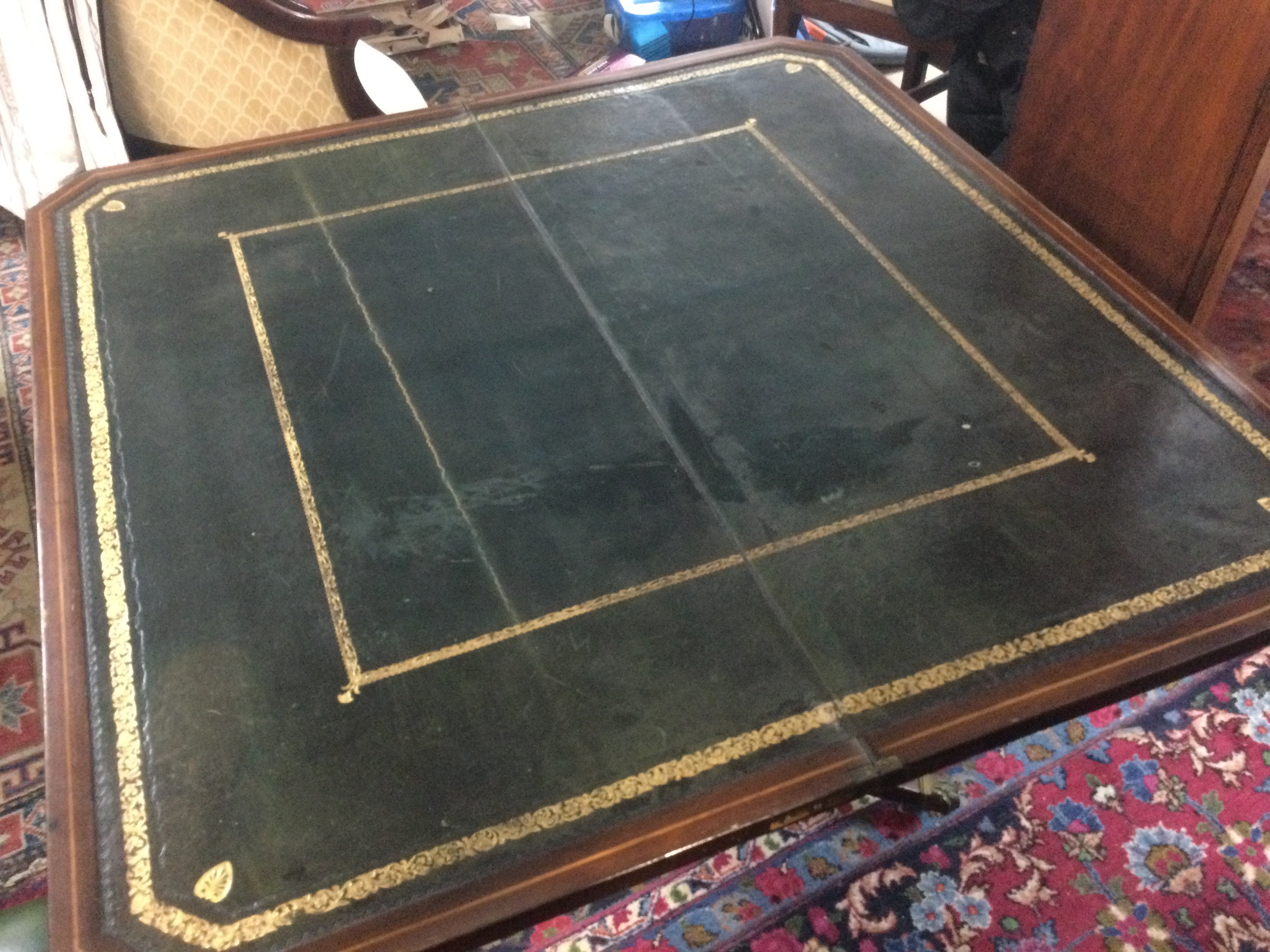 An inlaid regency style card table with a green leather top 76cm tall 89cm wide 44cm deep approximately . Games table 89x89cm