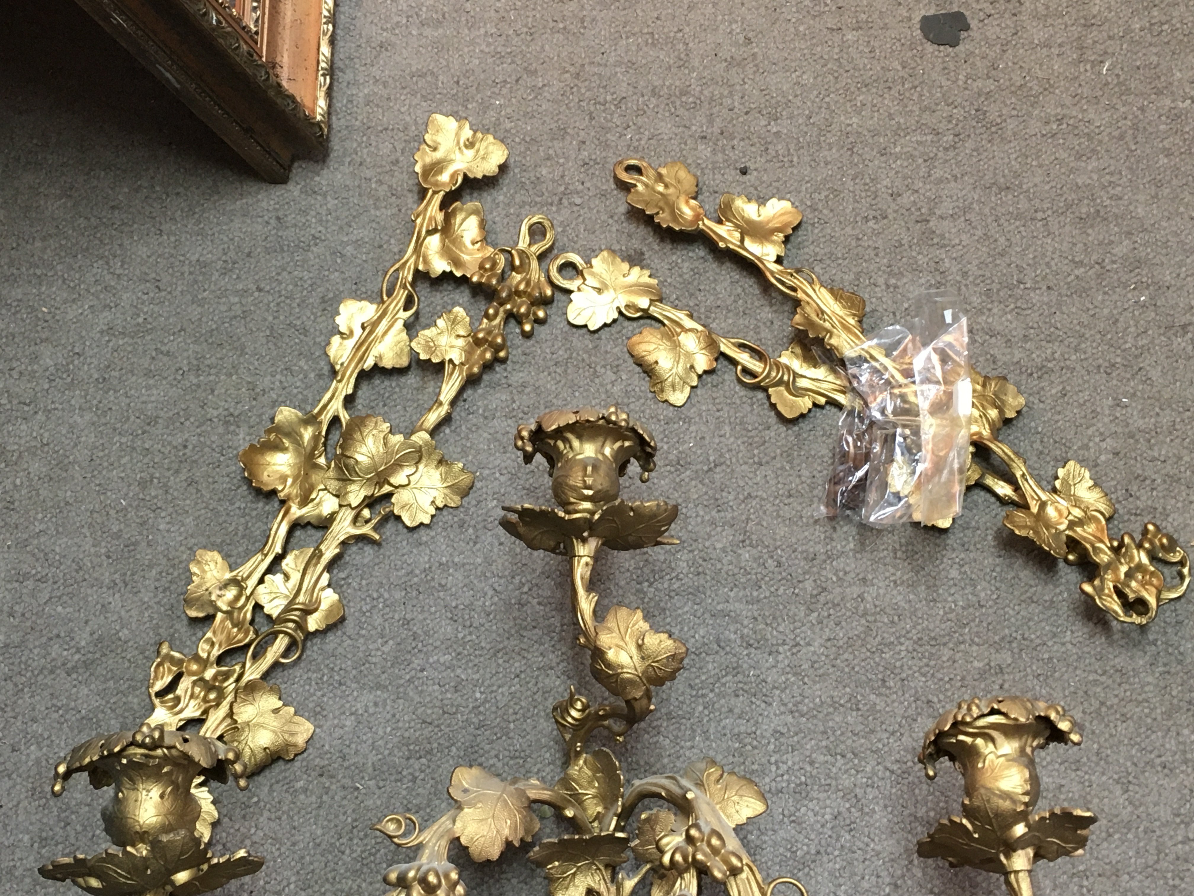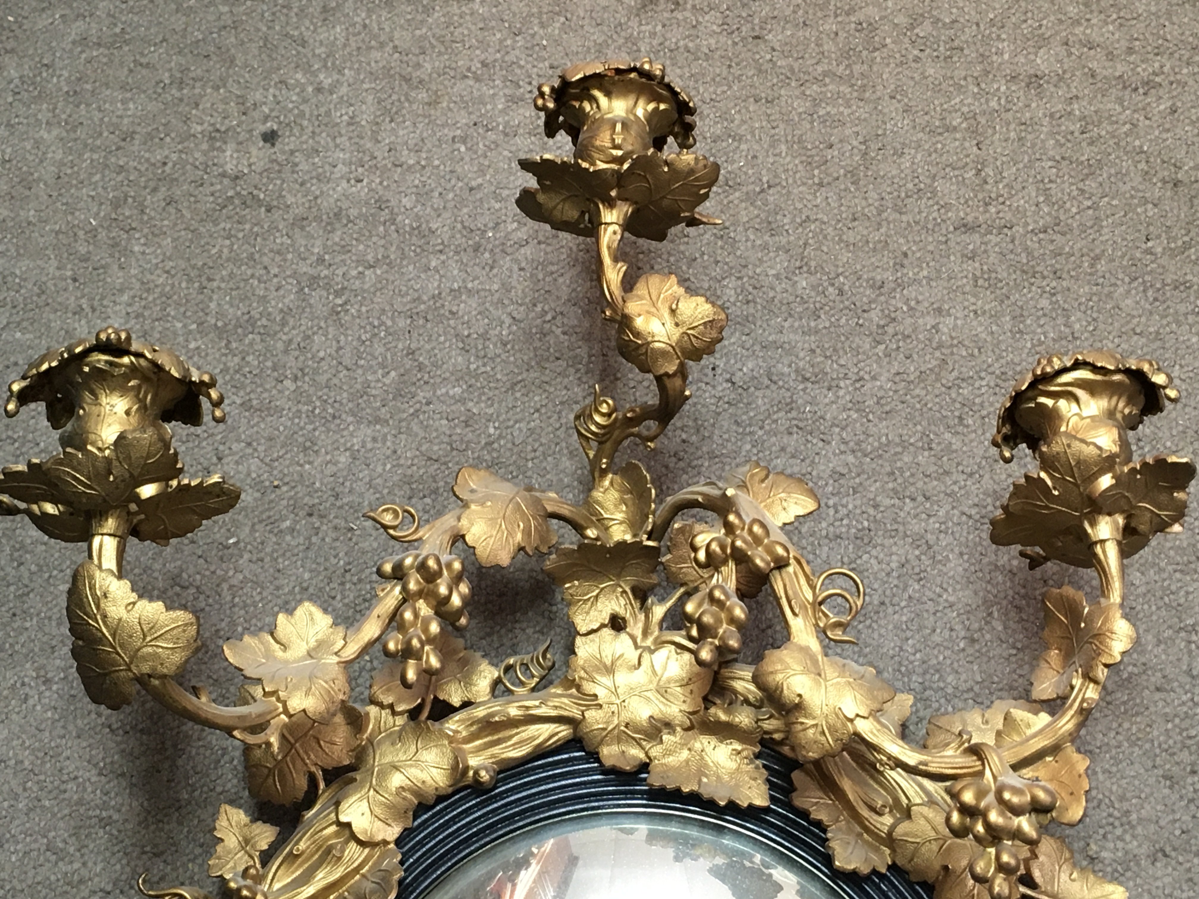A quality 19th century gilt metal girandole wall mirror with a frame featuring twisted branches, leaves and grapes. 49cm wide. This lot cannot be posted