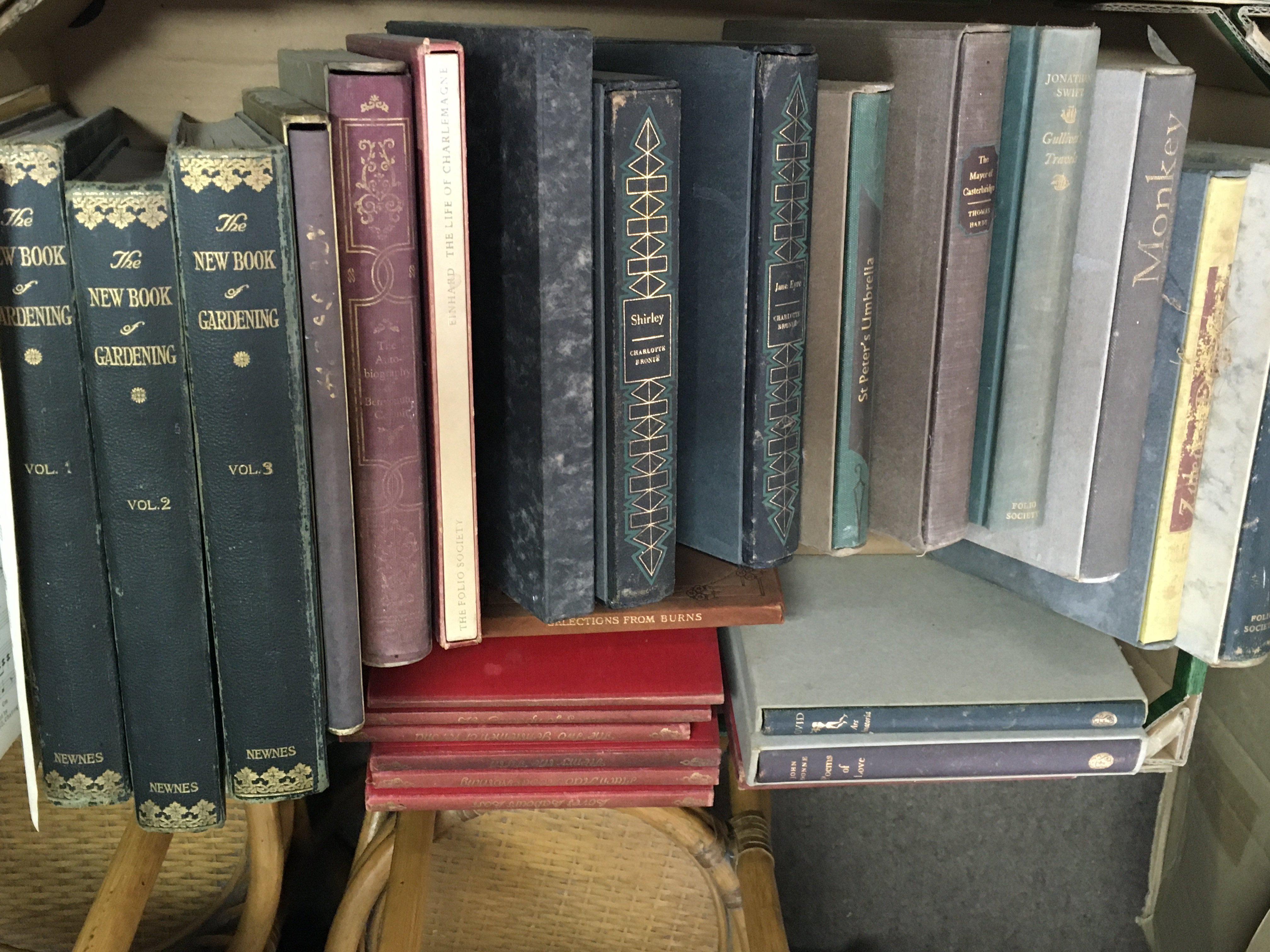 Two boxes of books including a short history of the world by H.G WELLS, the life of Samuel Johnson by James Boswell volumes ,Charles Dickens Waverley books , Folio society The life of Charlemagne etc. postage category C x2