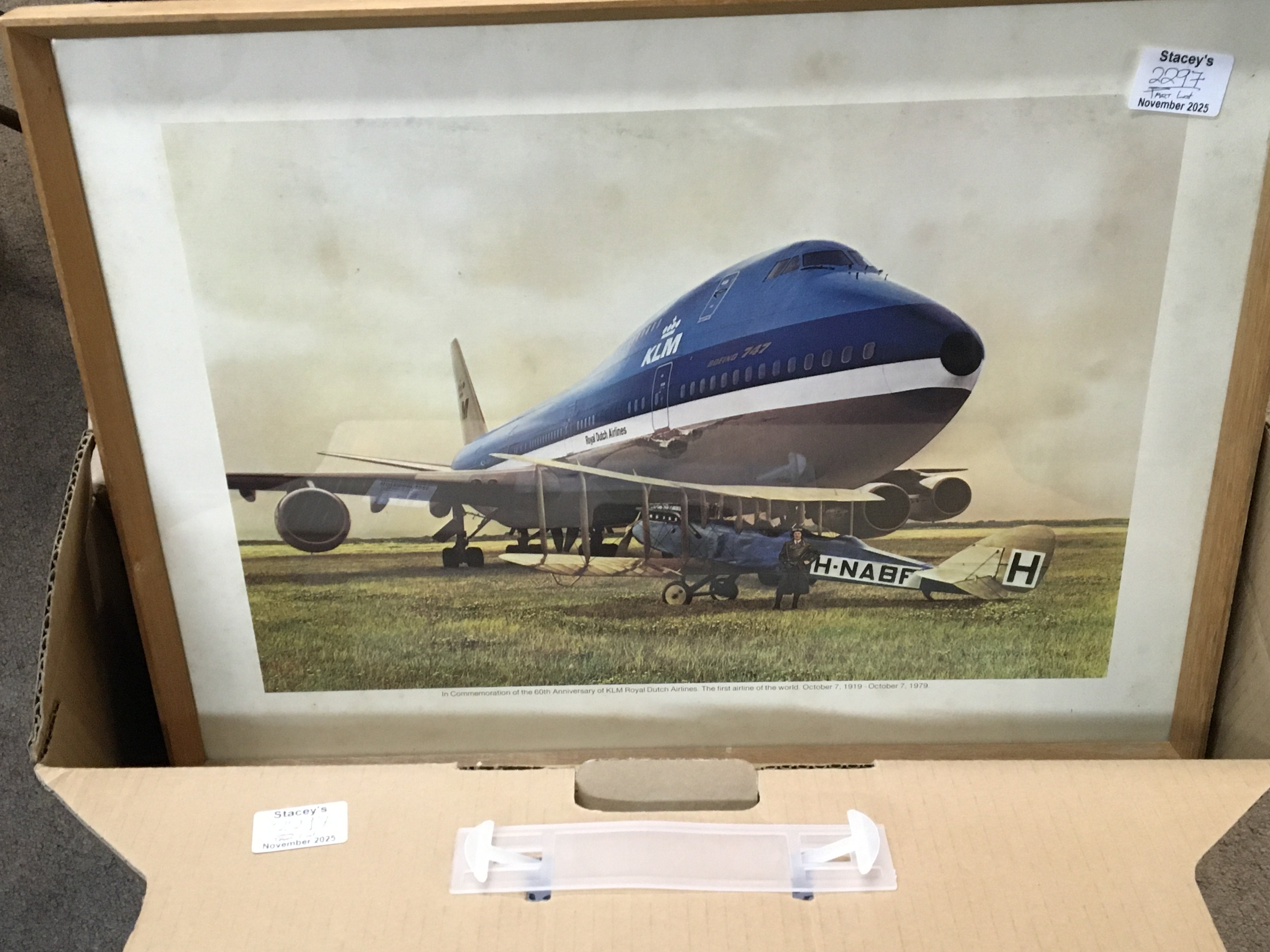 A collection of framed Commercial Aircraft photos and other unframed conforming pictures.
