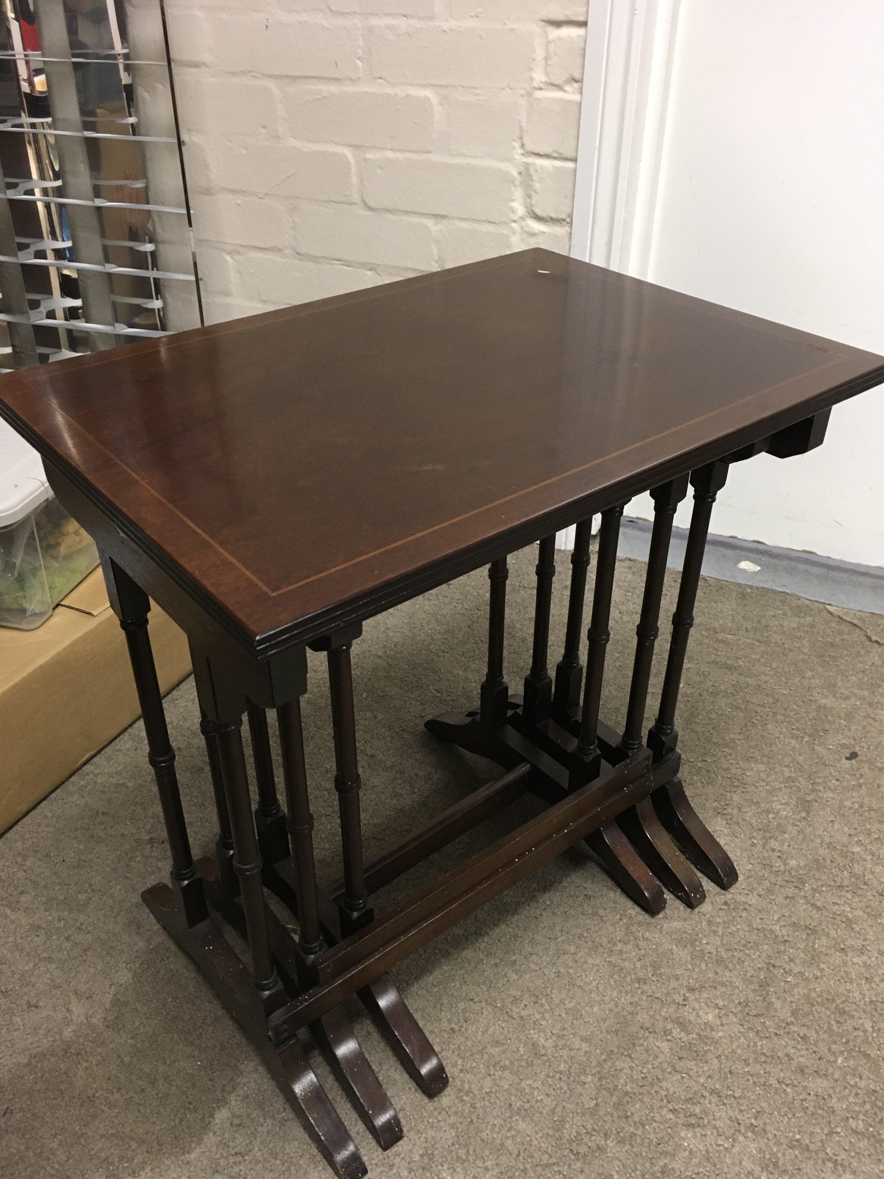 An oval oak framed wall mirror with a nest of mahogany tables. 54cm tall 52cm wide