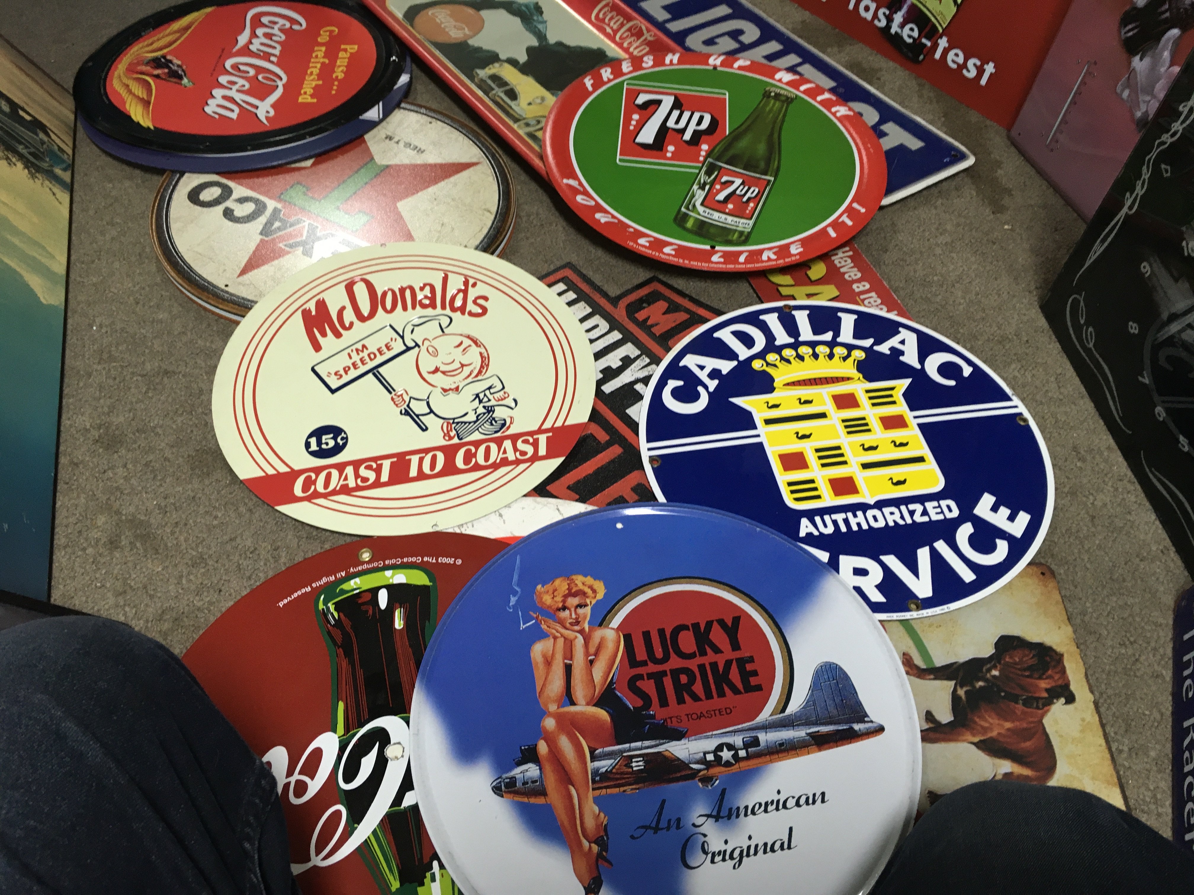 A Collection of vintage metal advertising signs including Harley Davidson, Jack Daniels, Coca Cola , Coca Cola tray , McDonalds, Cadillac, lucky strike etc . Postage category C