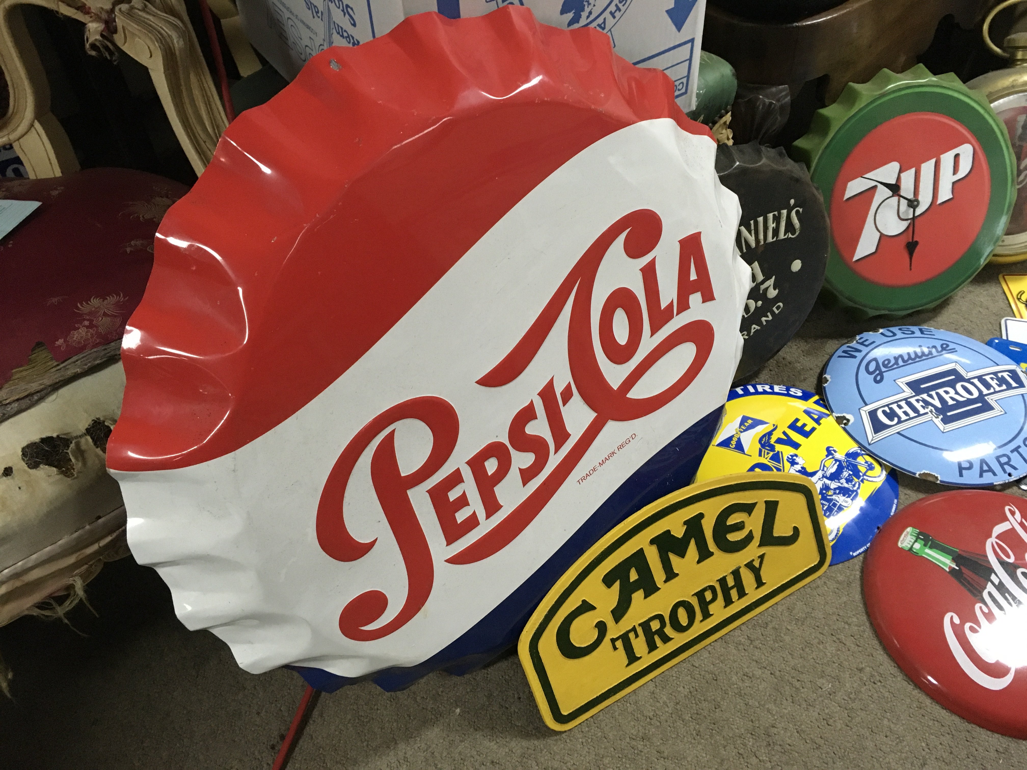 A Collection of vintage metal advertising signs including a large Pepsi bottle cap sign, camel, good year, Jack Daniels etc. this lot cannot be posted