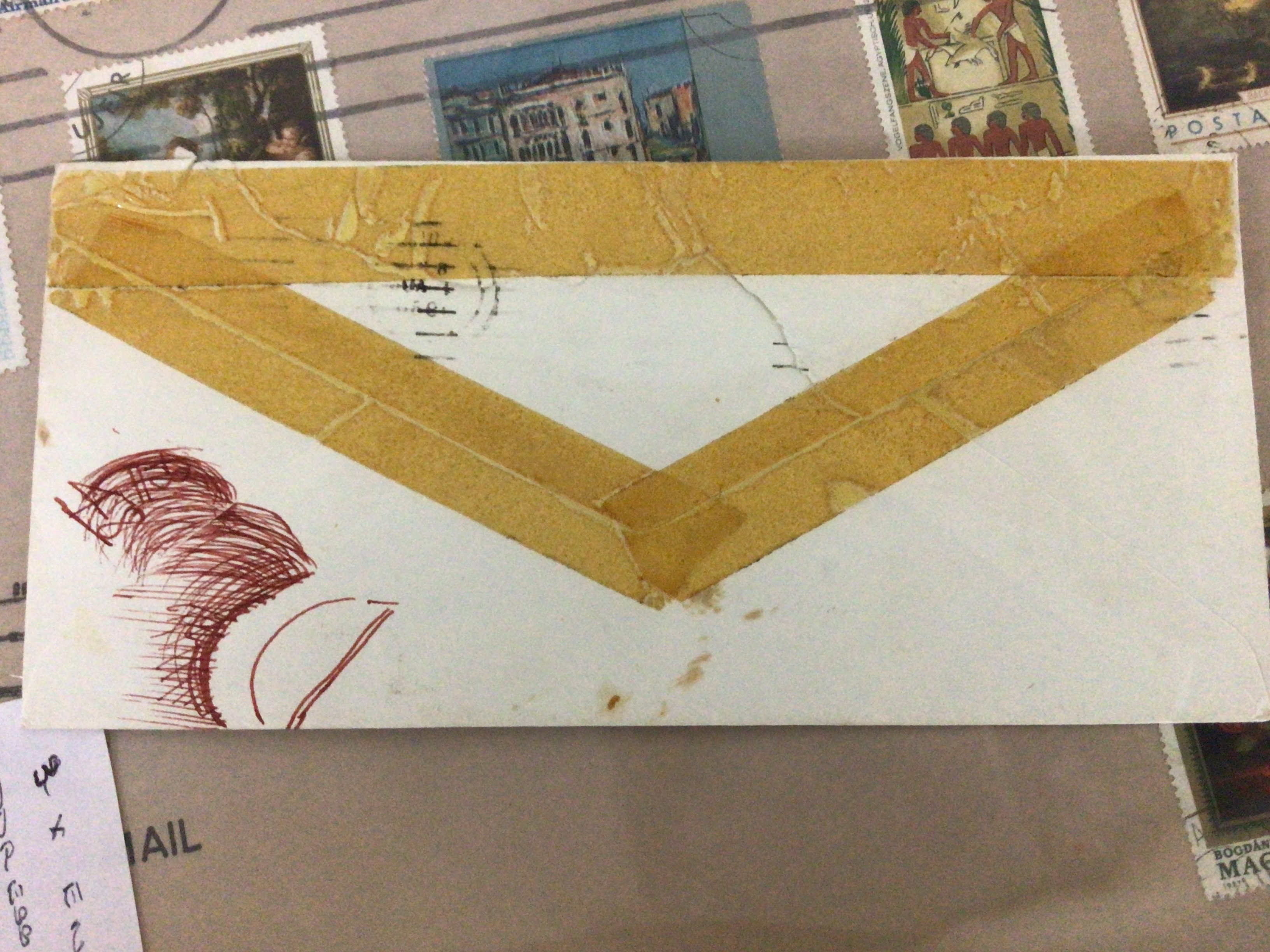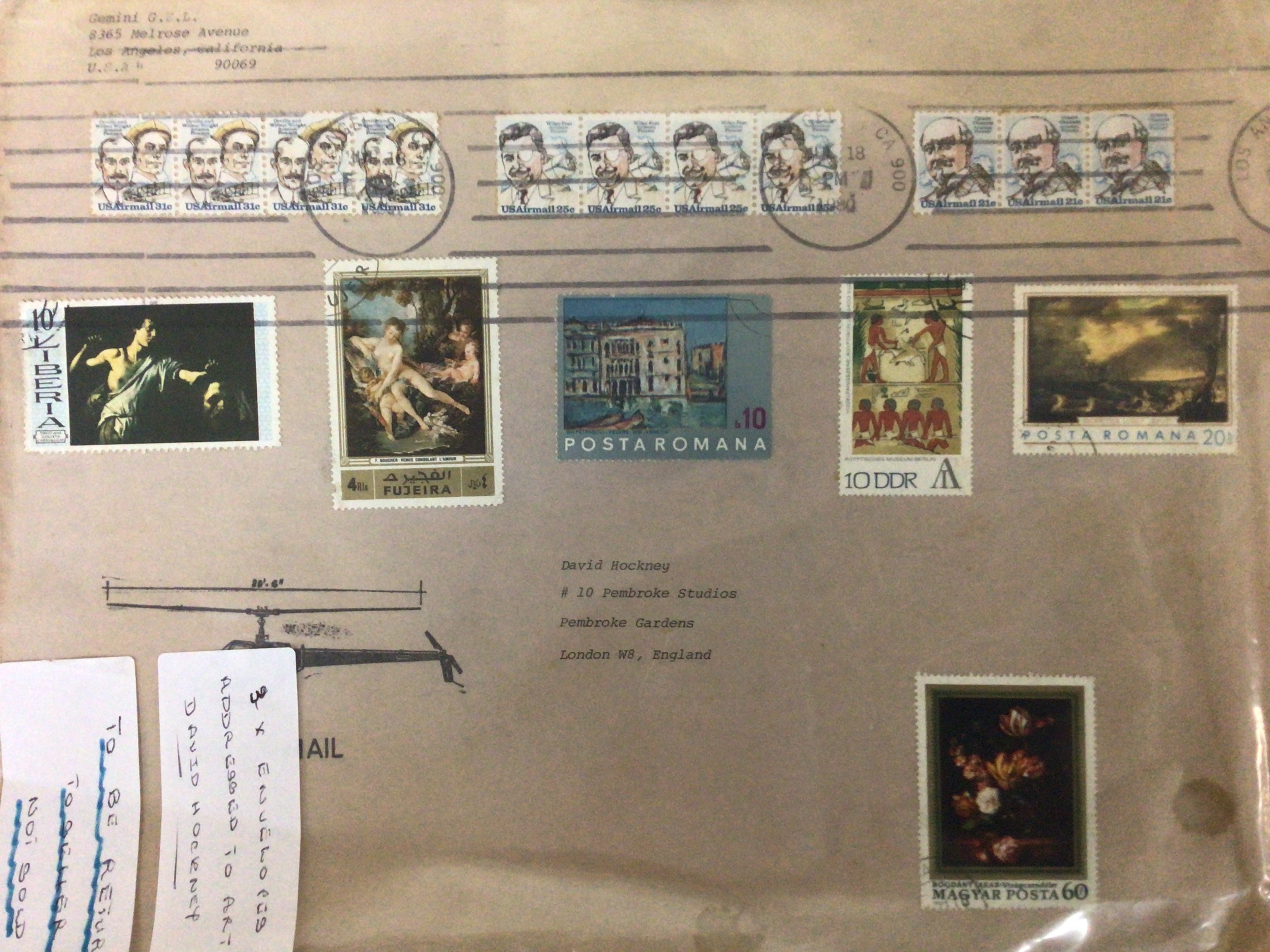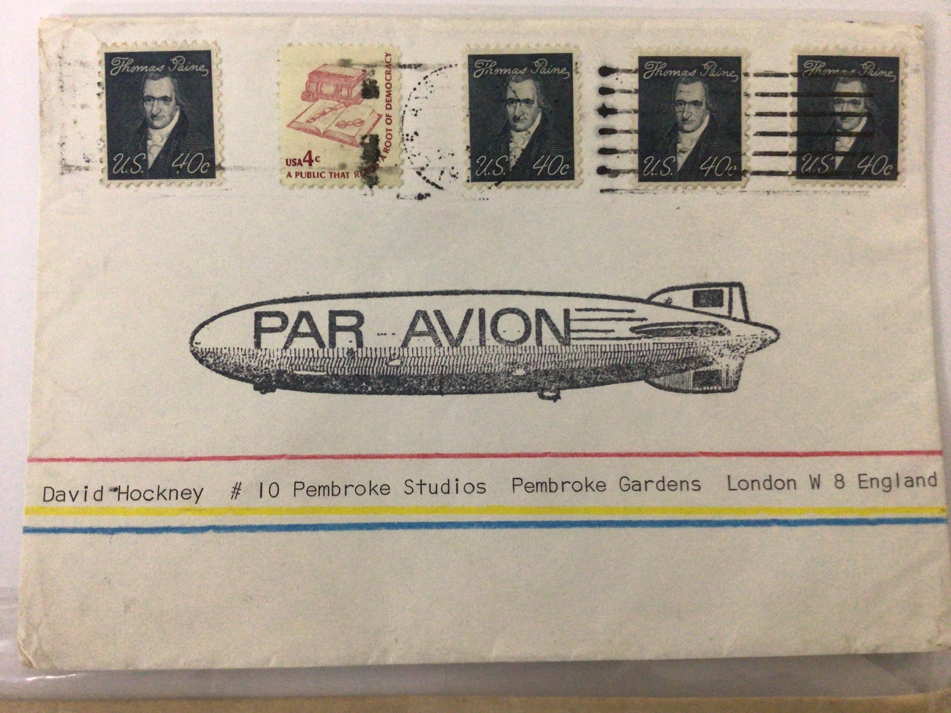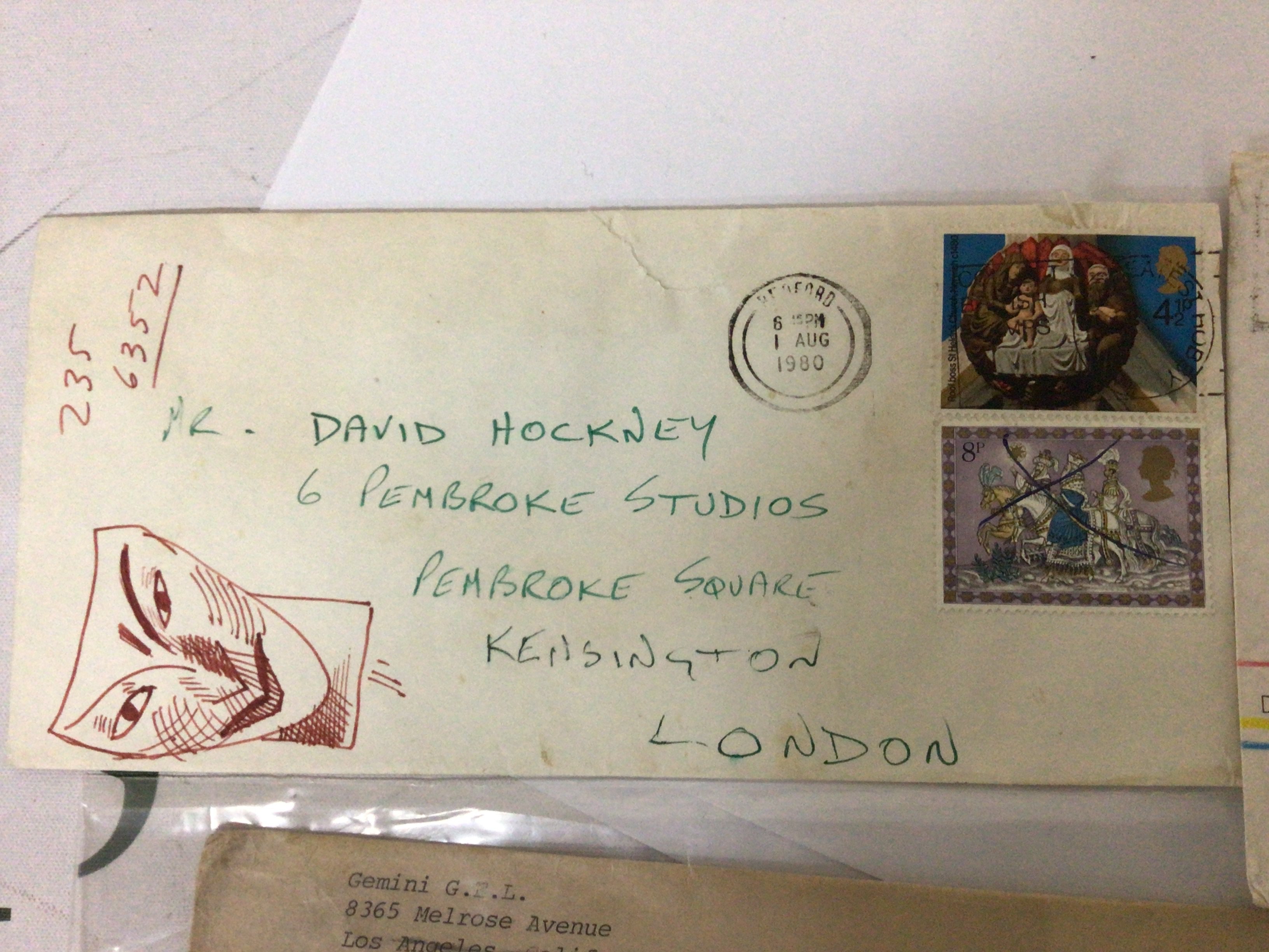 Three interesting postal Envelopes addressed to David Hockney one with an airship from the US with the address 10 Pembroke Studios Pembroke Gardens running horizontally through coloured lines. Another dated 1980 the envelope with additional pen sketch possible by David Hockney. Also a larger envelope addressed to David Hockney again to the Pembroke studio from Gemi GEL Los Angeles.