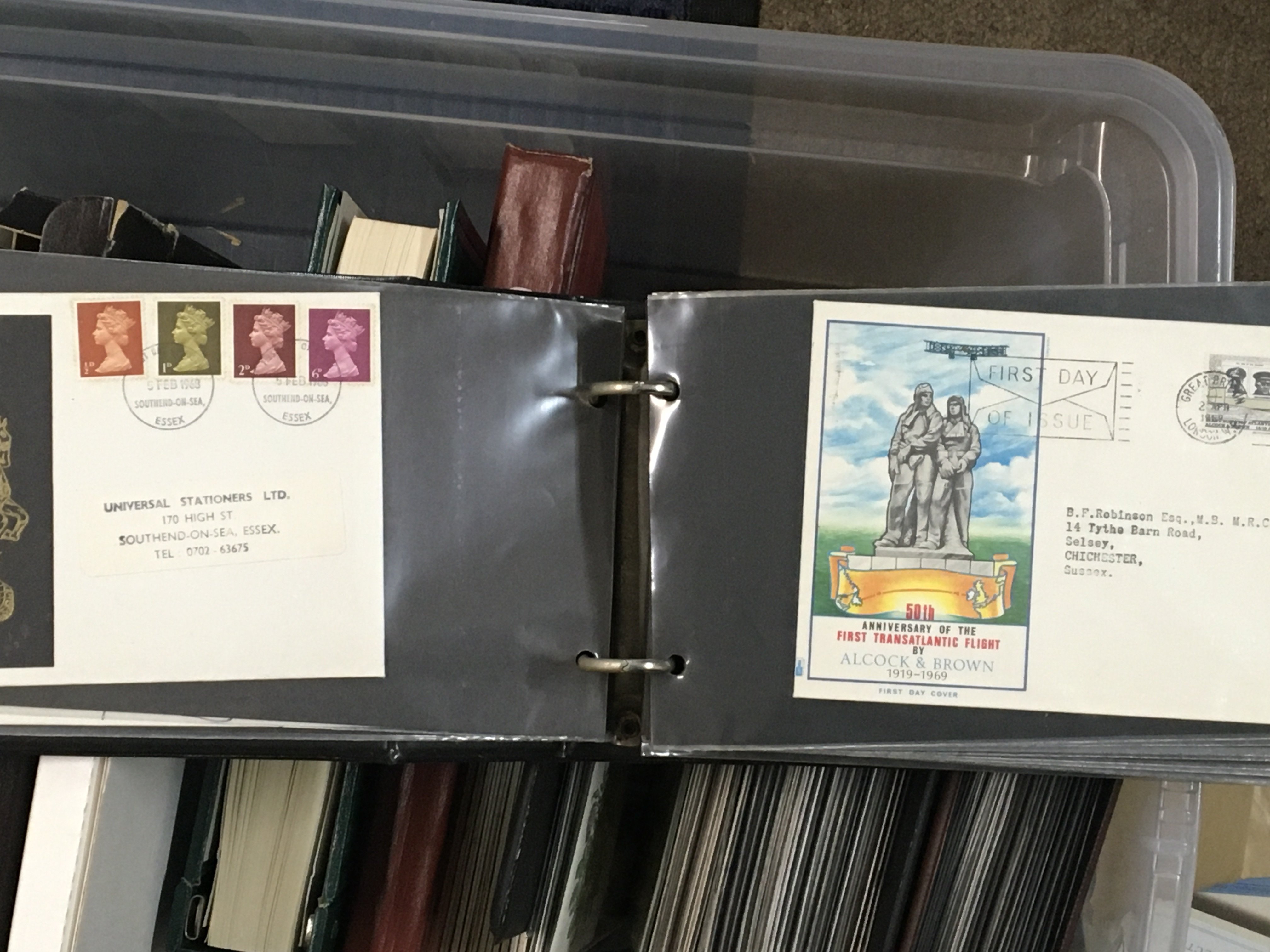 A box containing stamp albums containing mixed world stamps and albums of First day covers