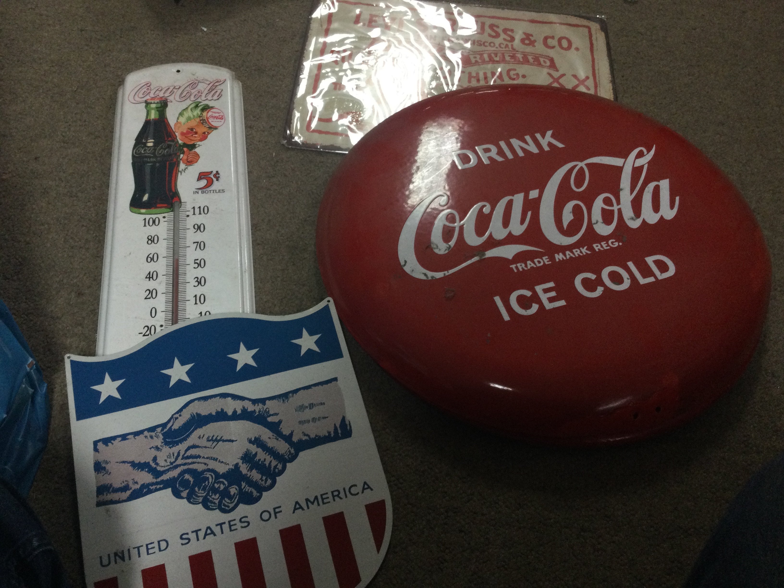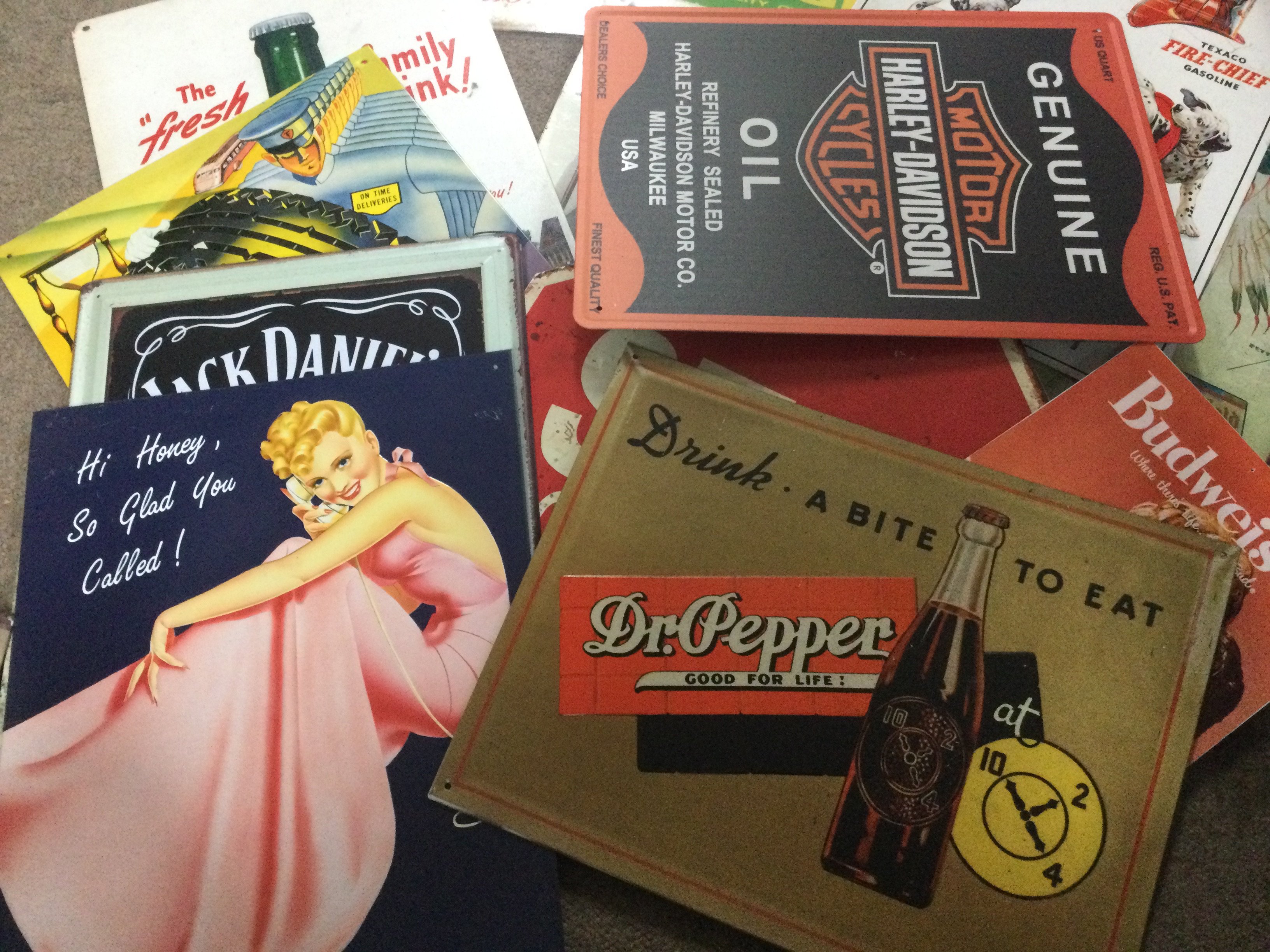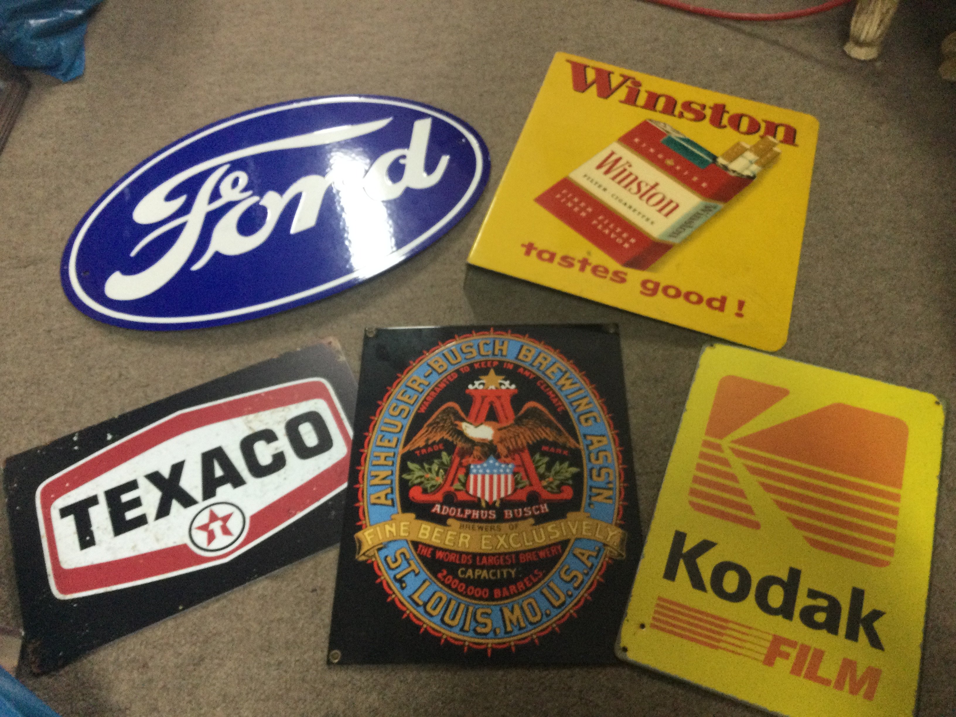 A collection of metal advertising signs including Ford , Winston cigarettes, Coca Cola etc. postage cat C