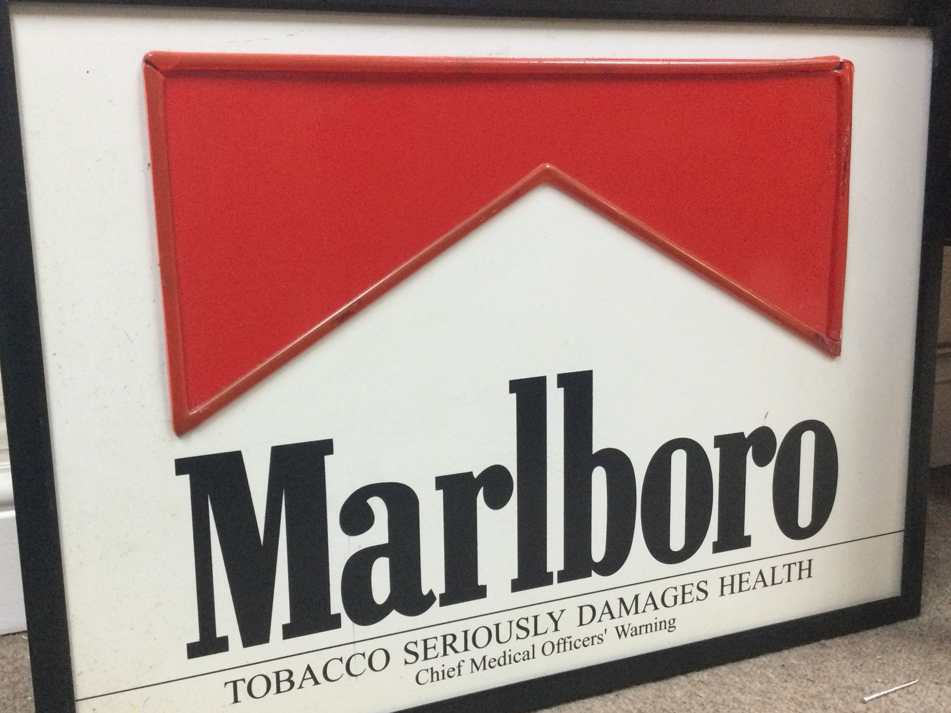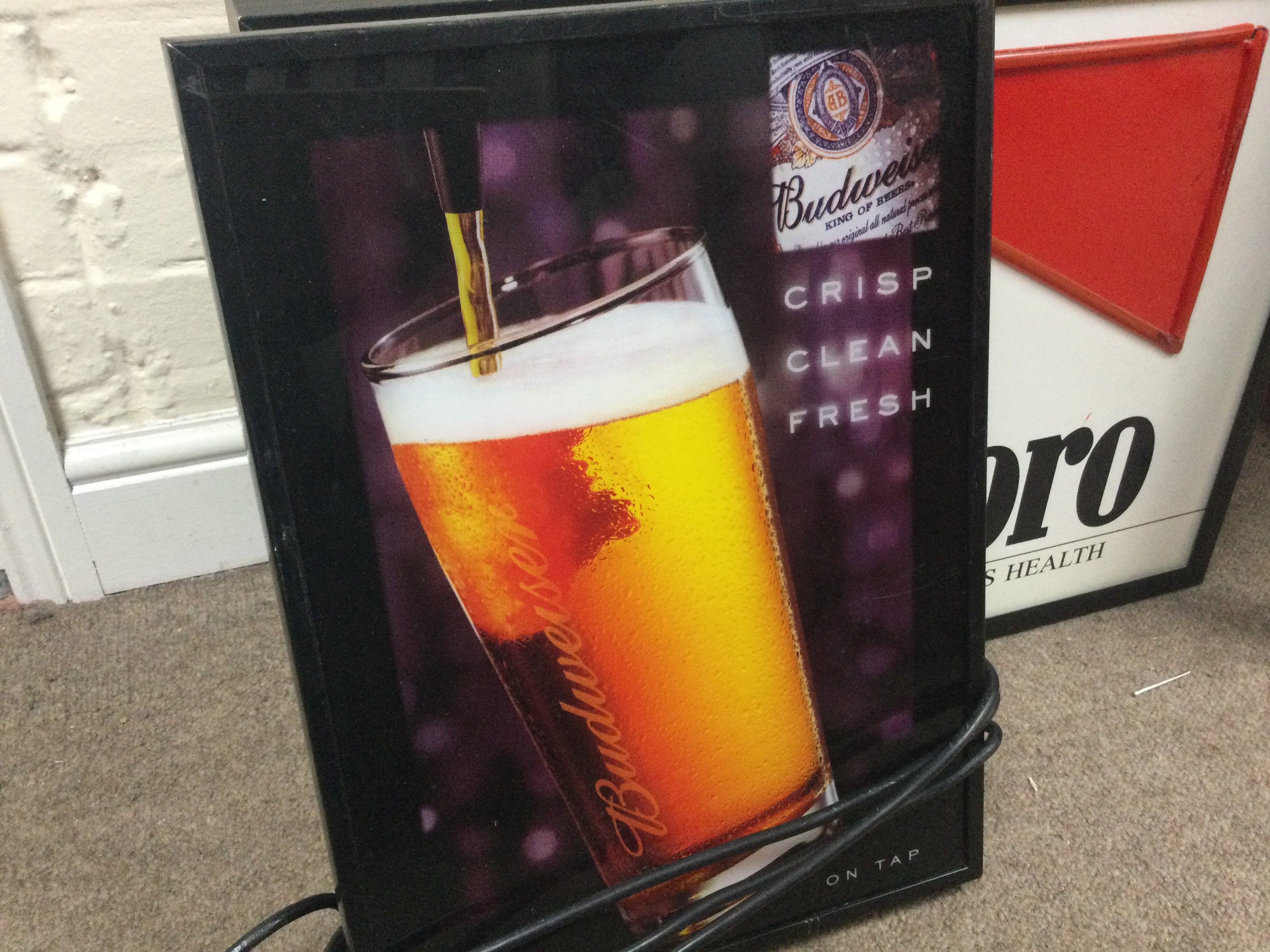 A vintage Marlboro light up sign (44cm wide 60cm tall) and a Budweiser sign (46cm tall 32cm wide) . This lot cannot be posted