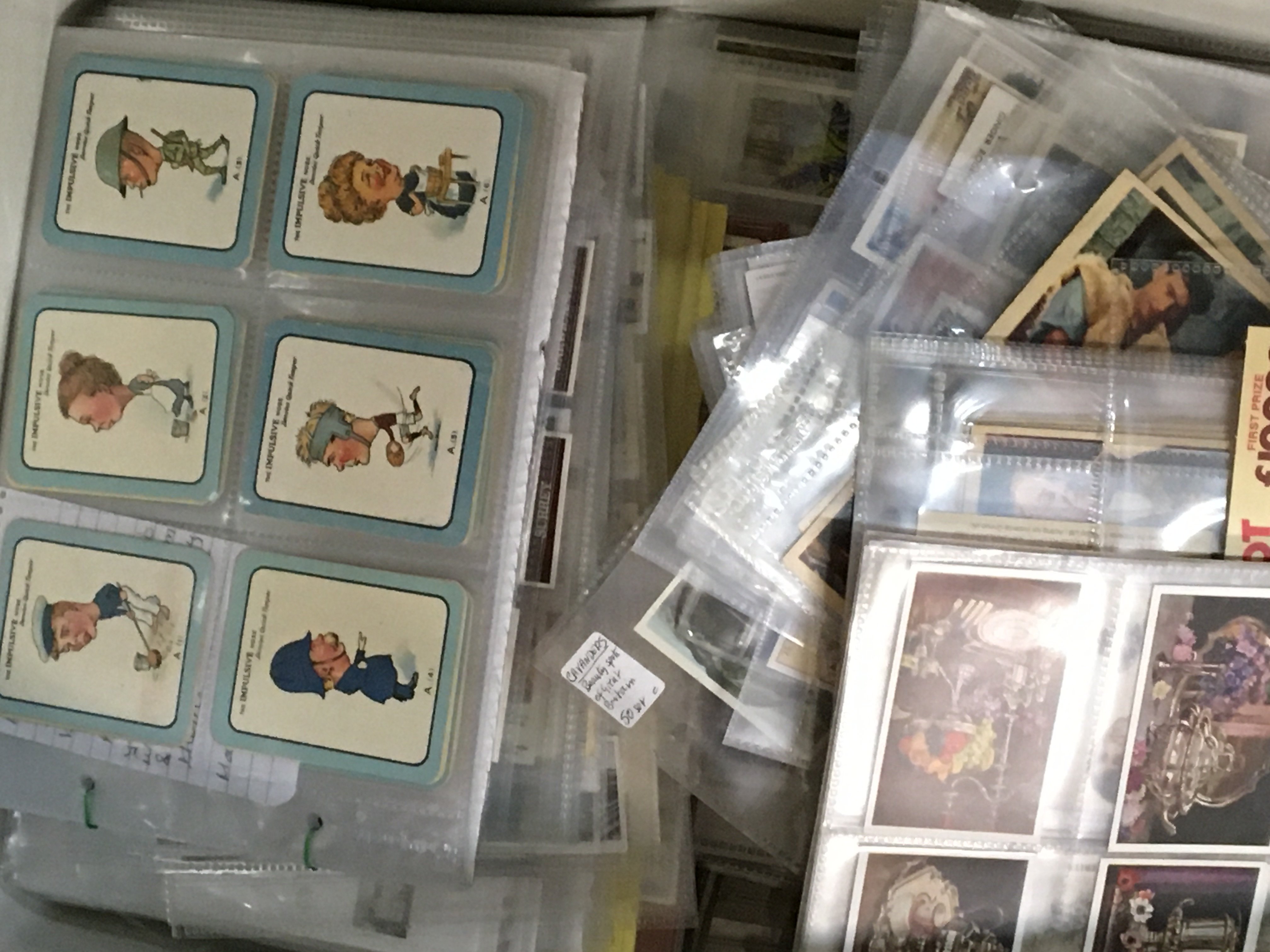 A box containing a comprehensive large collection of cigarette cards and trade cards most well presented in Plastic sleeves.