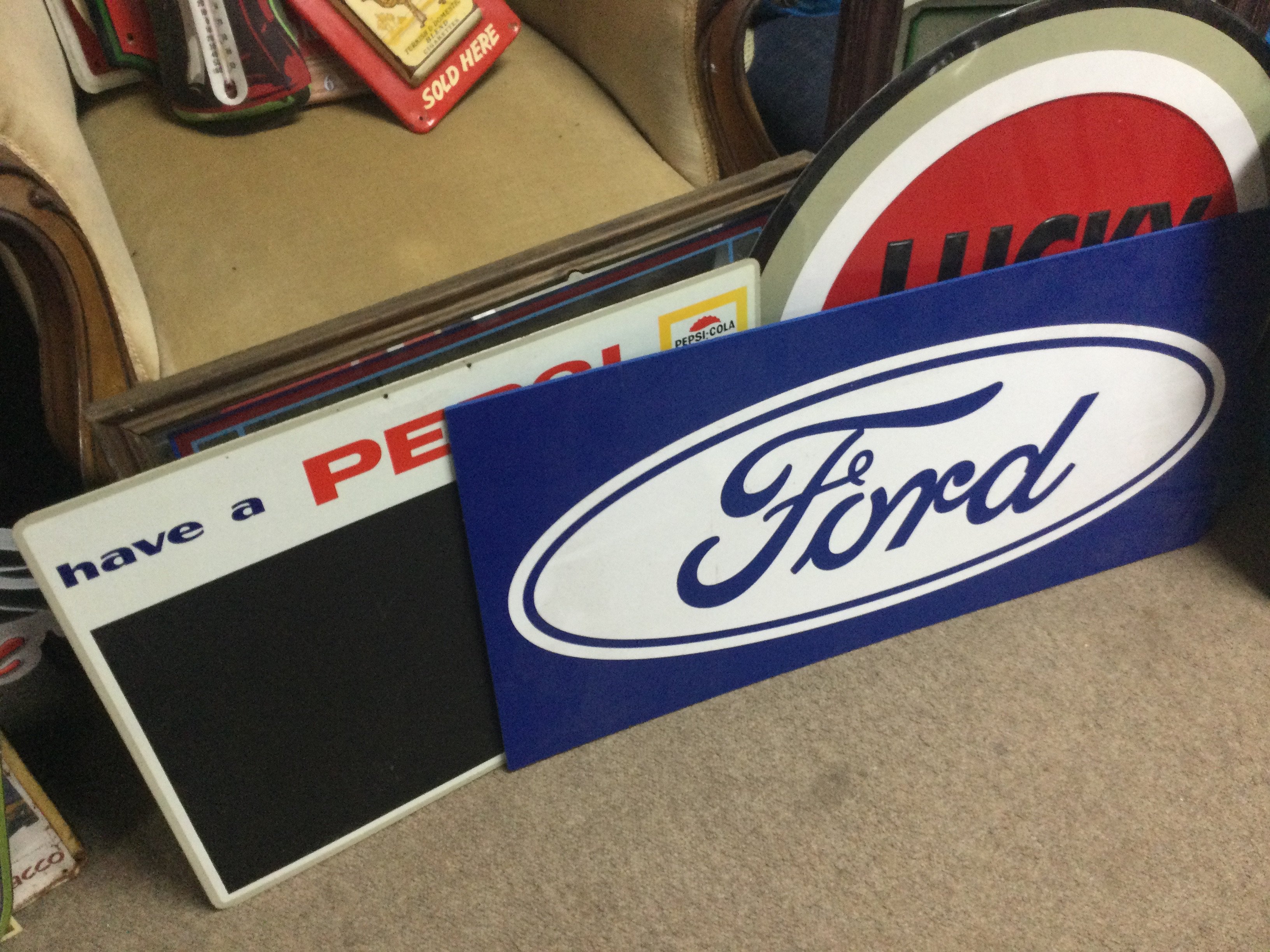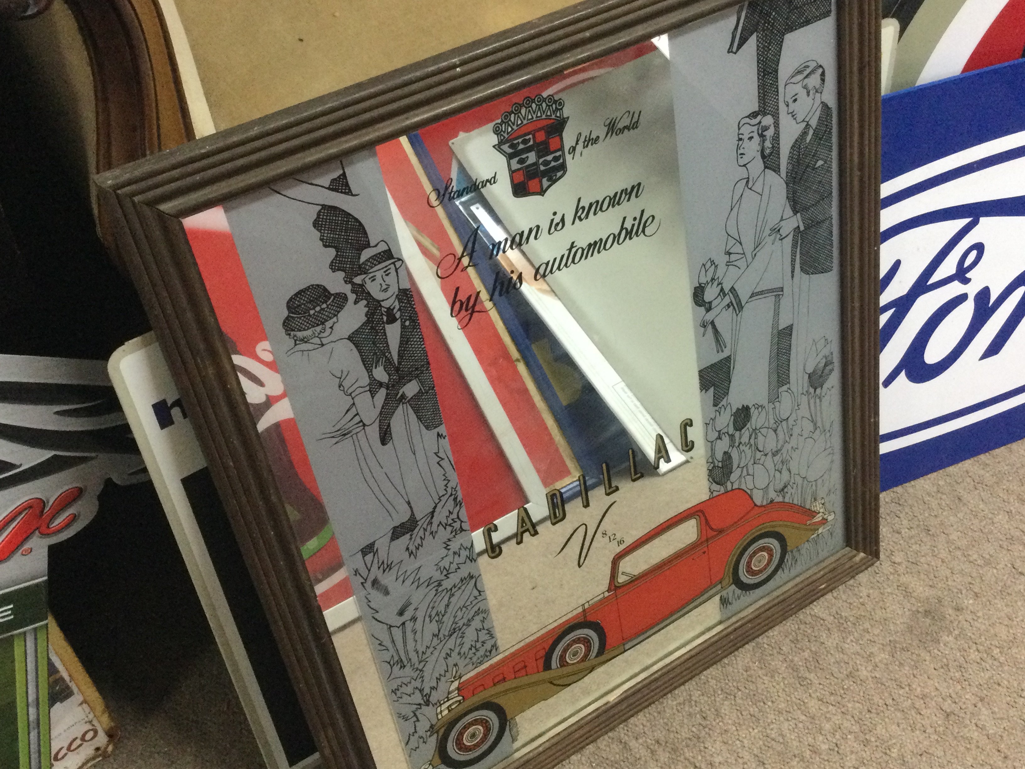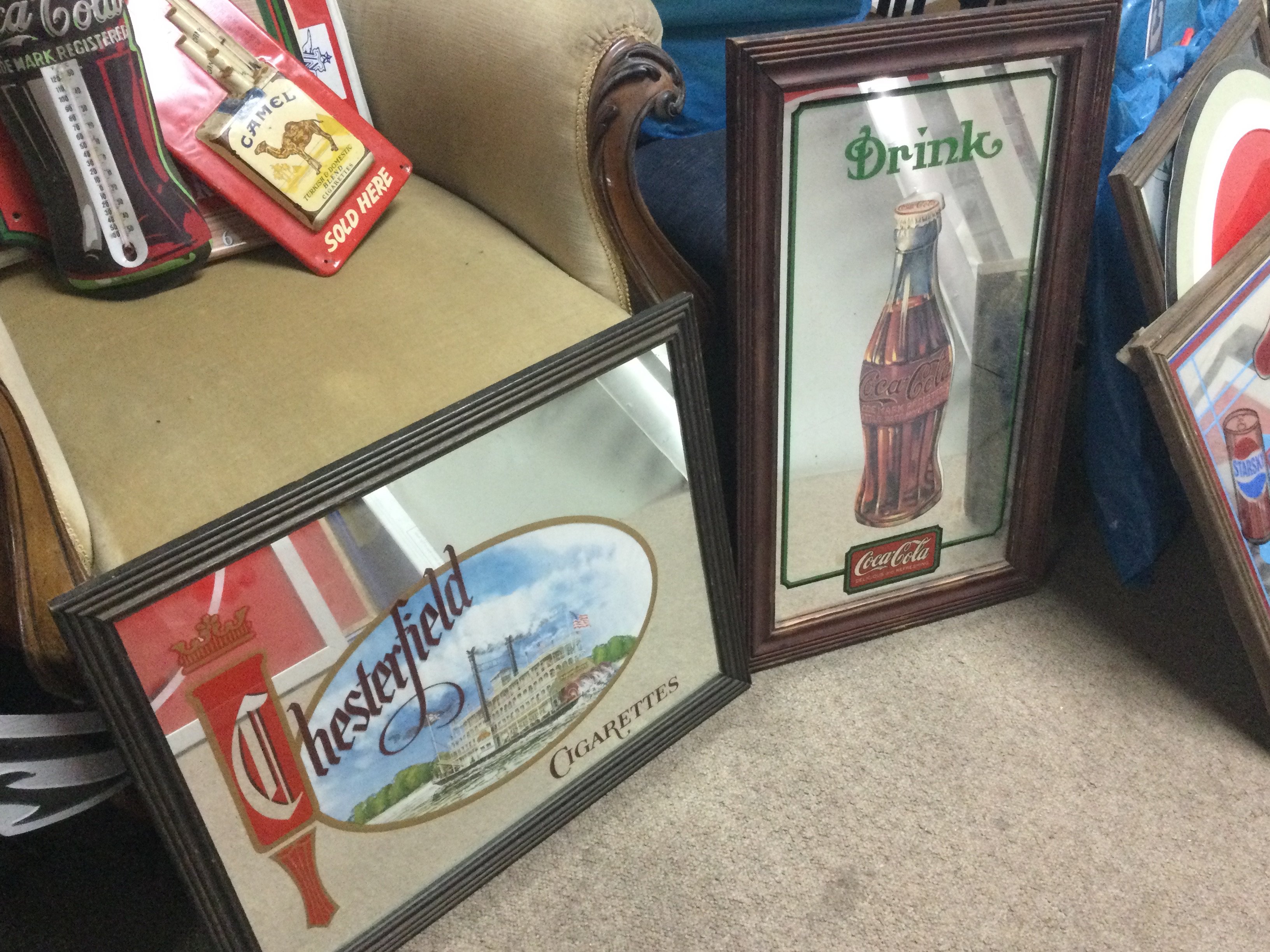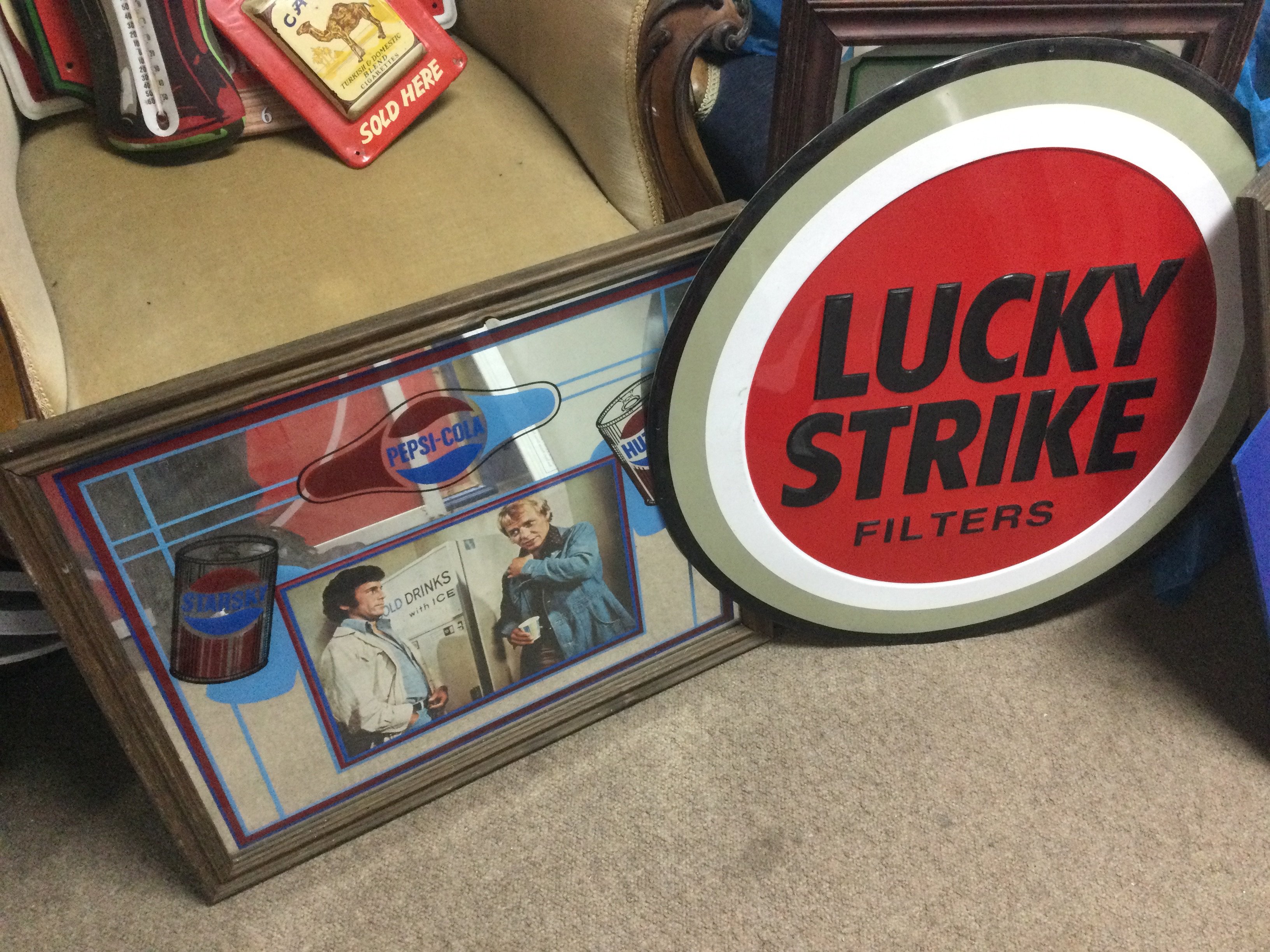 A collection of vintage advertising signs including advertising mirrors Cadillac , Pepsi cola Starsky and hutch , Chesterfield cigarettes, Cola Cola, Lucky Strike metal sign etc. this lot cannot be posted
