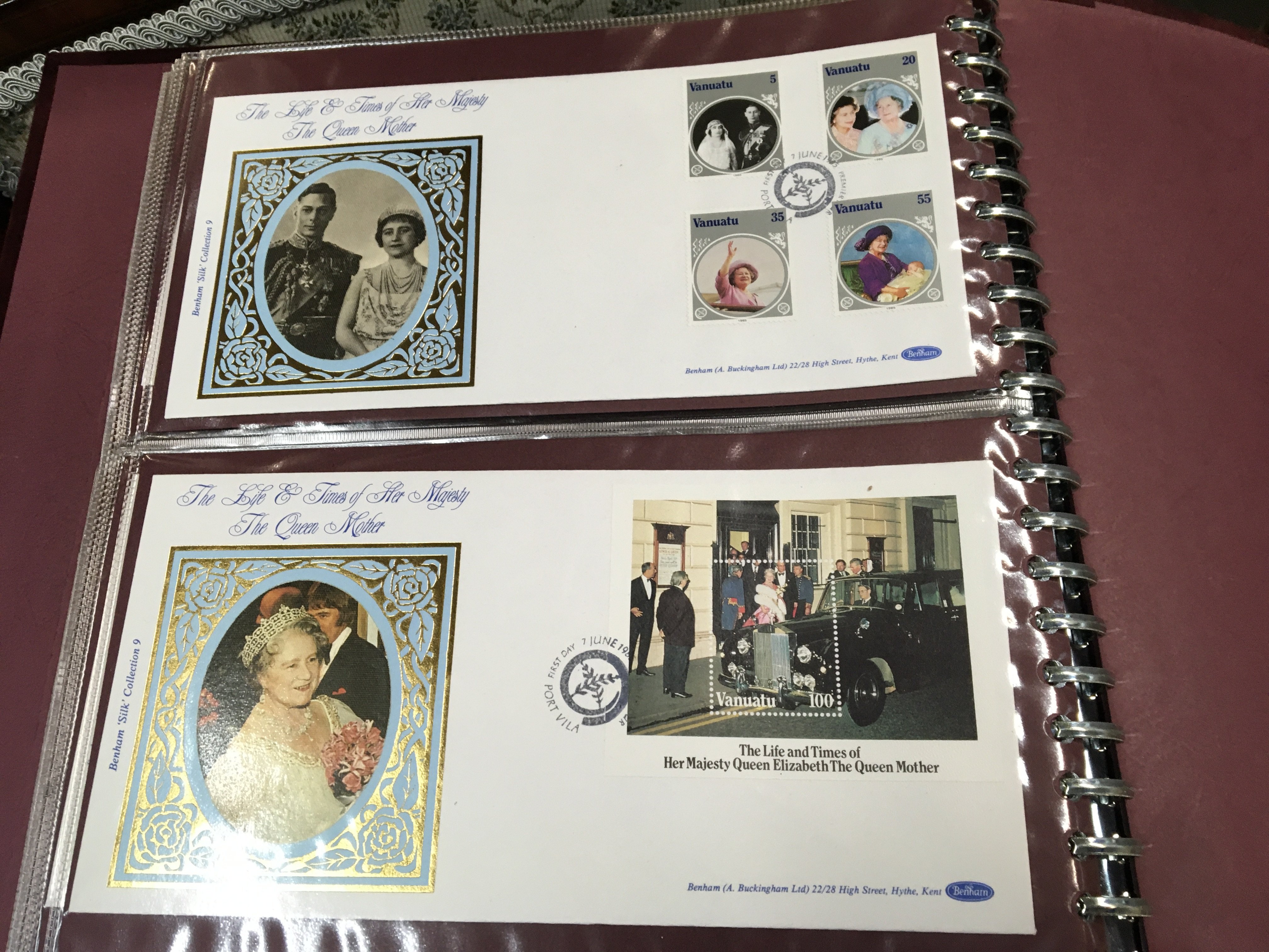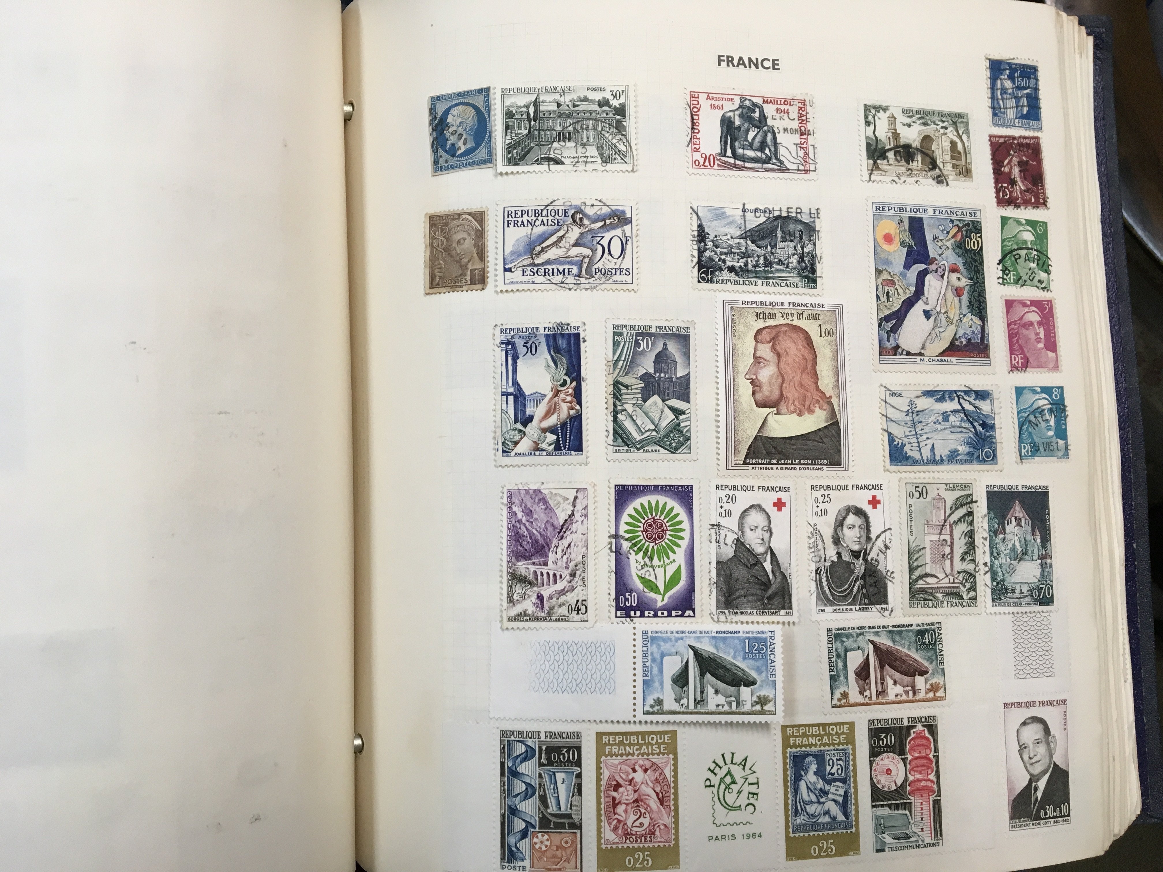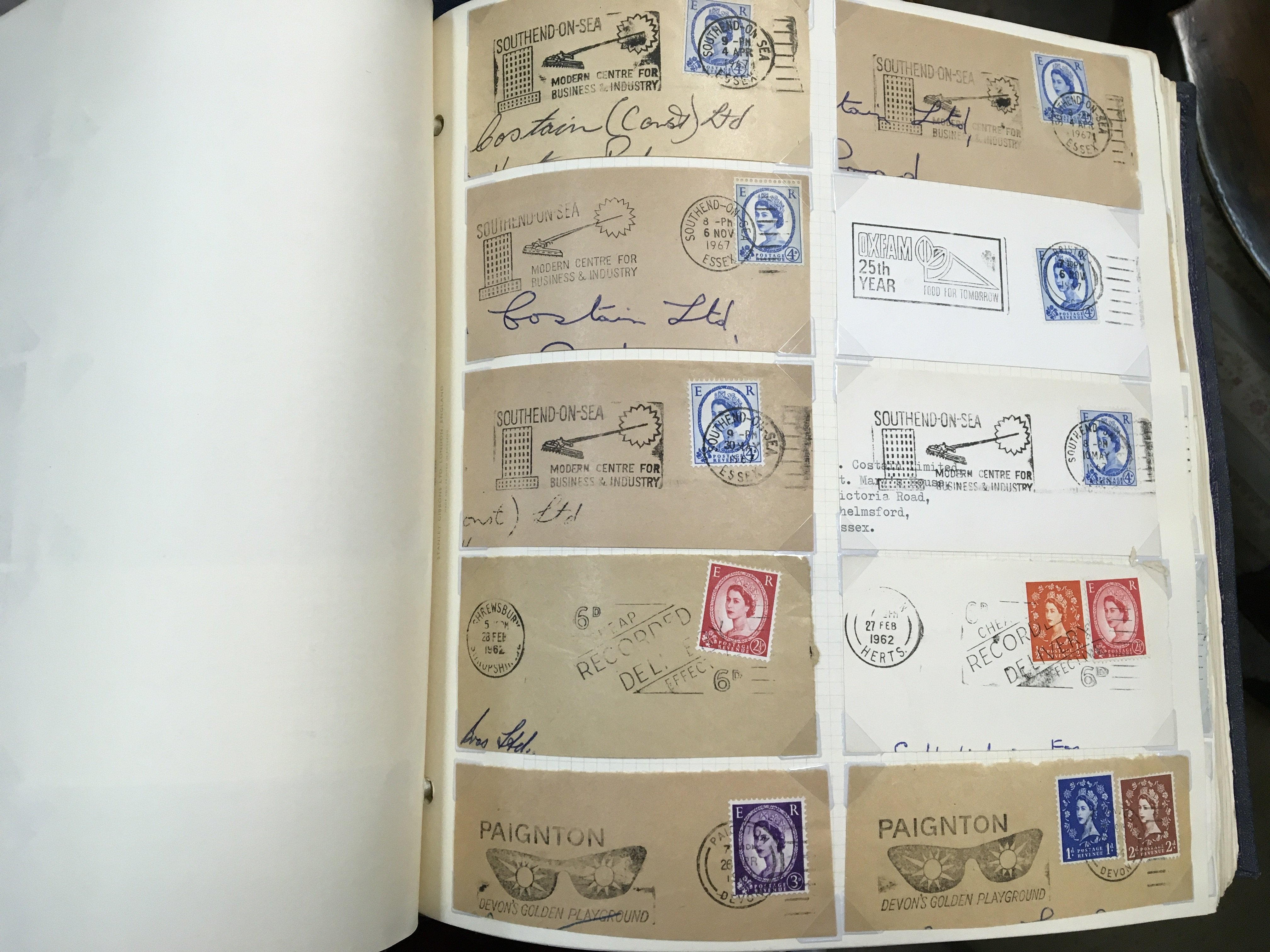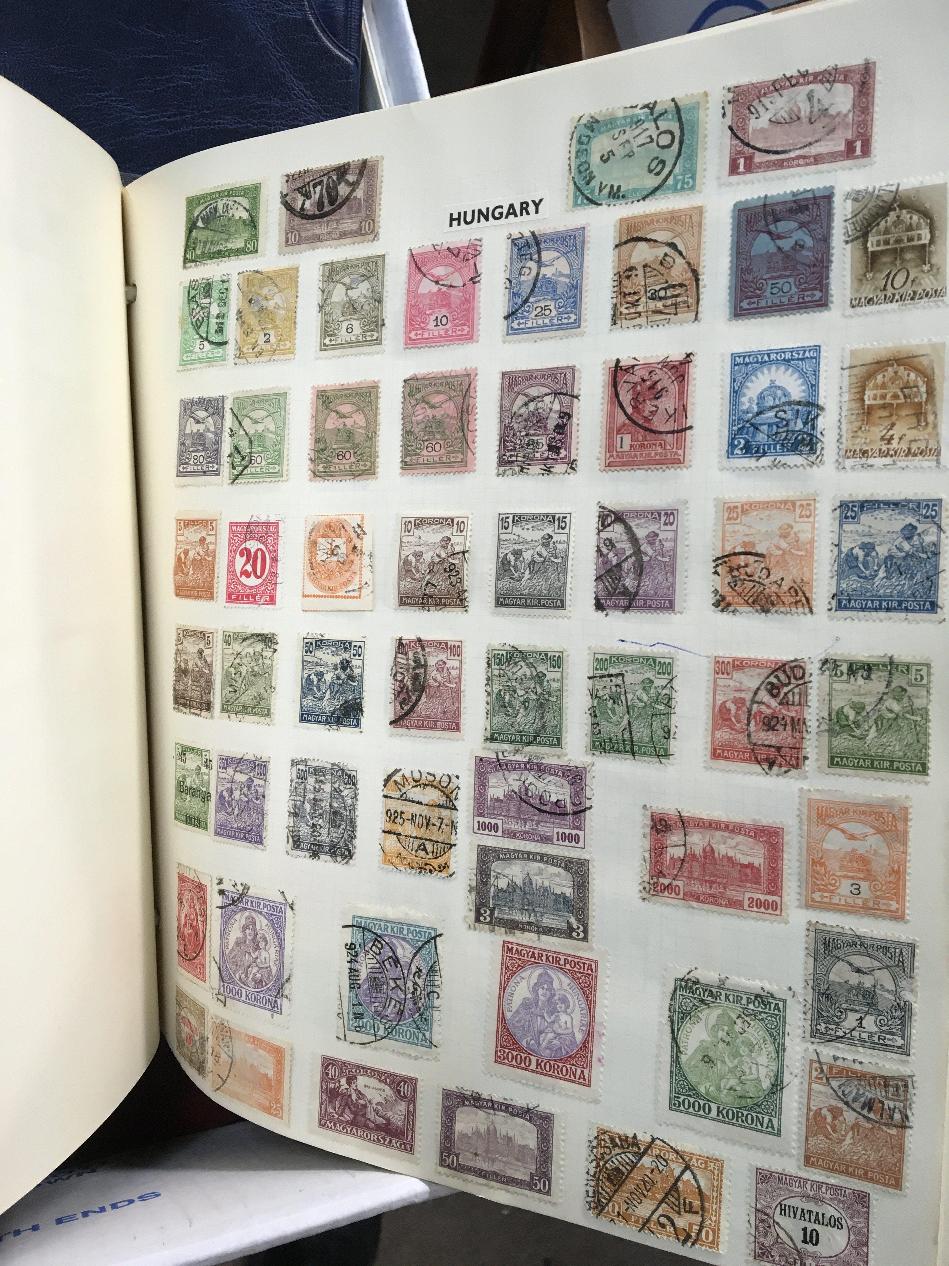 A box containing albums of world stamps mainly used second half of the 20th century albums of first day covers and albums of Vintage postcards.