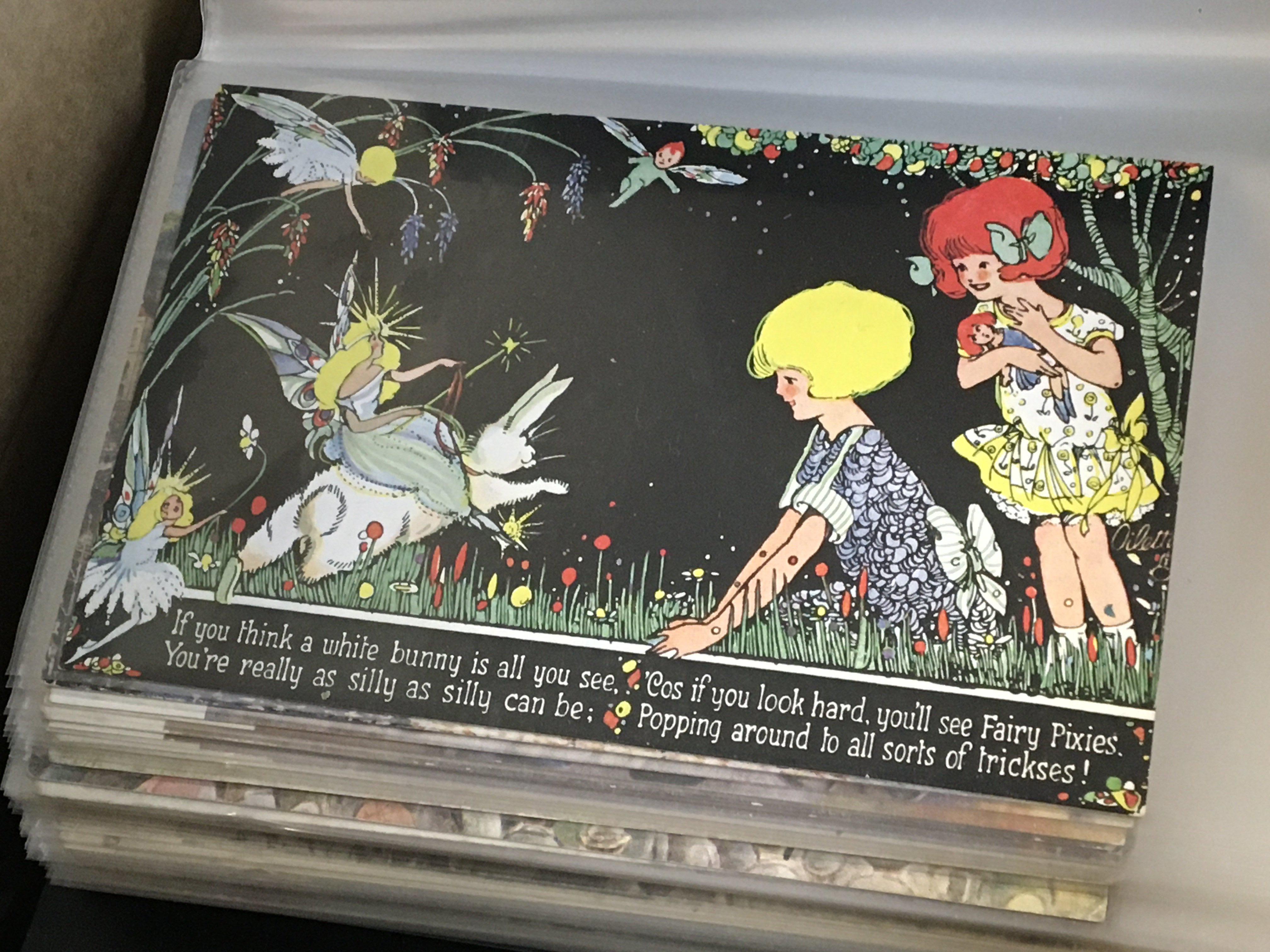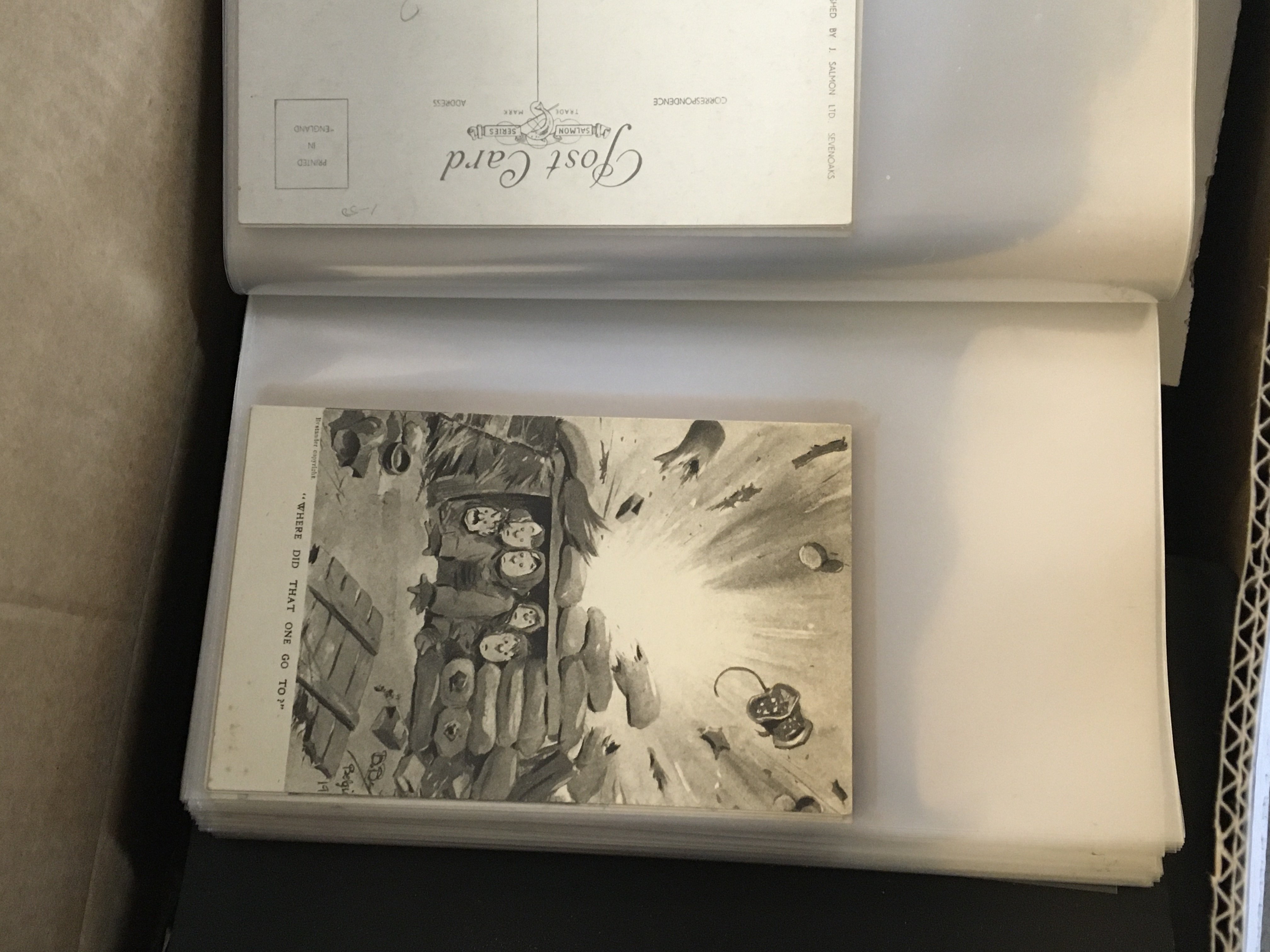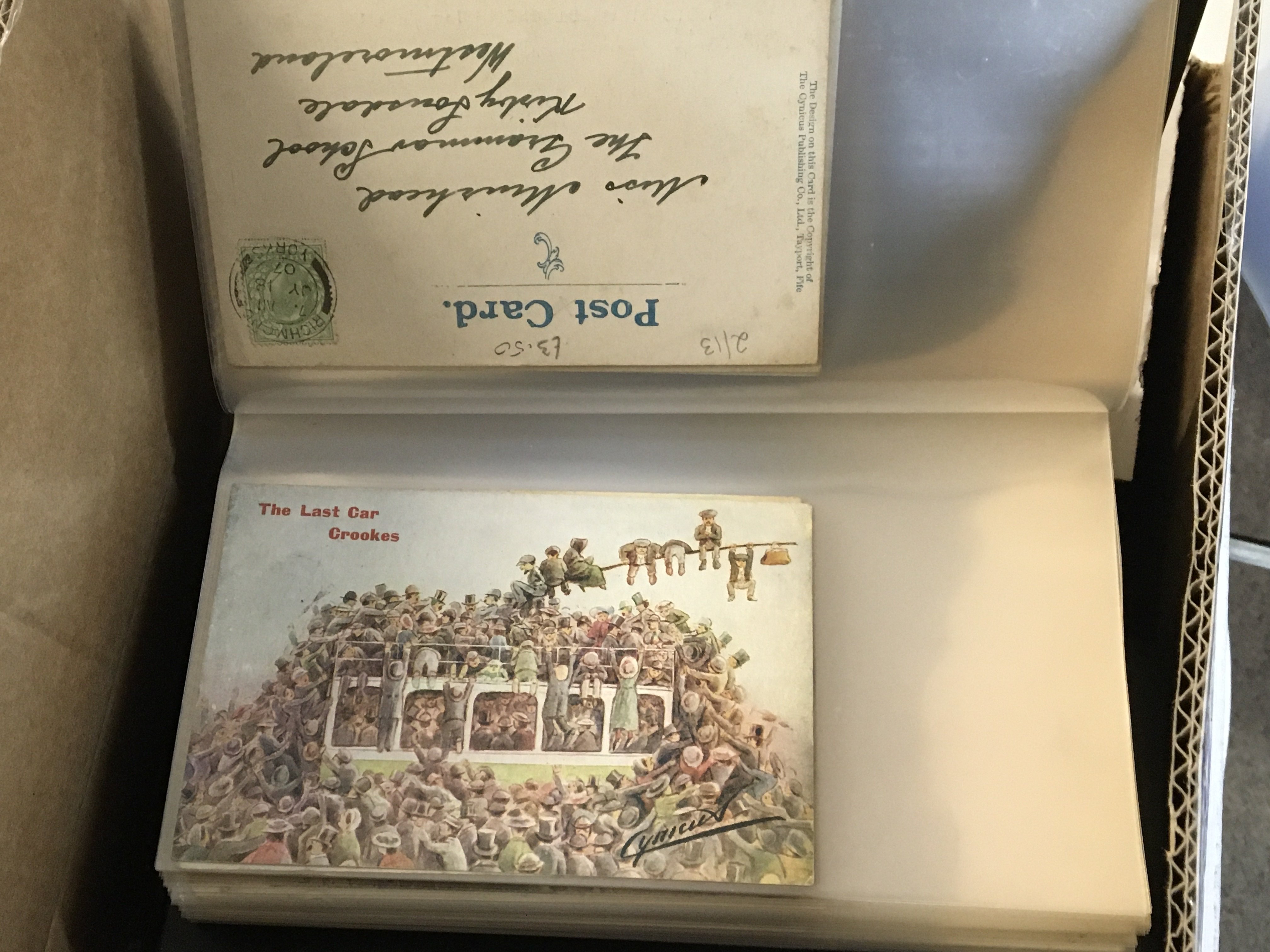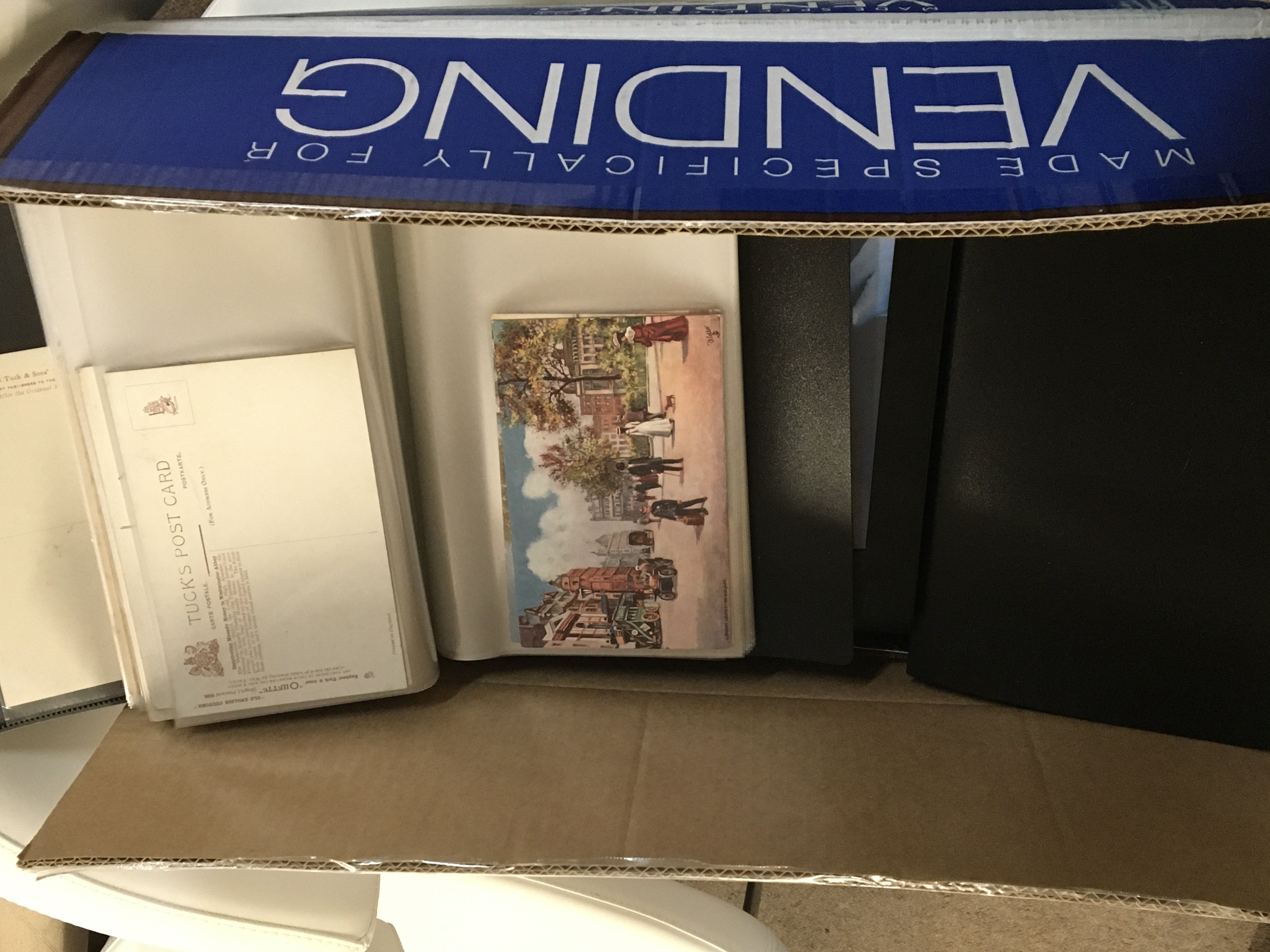 A box containing a quantity of albums of Vintage postcards approximately twelve albums and some loose cards.