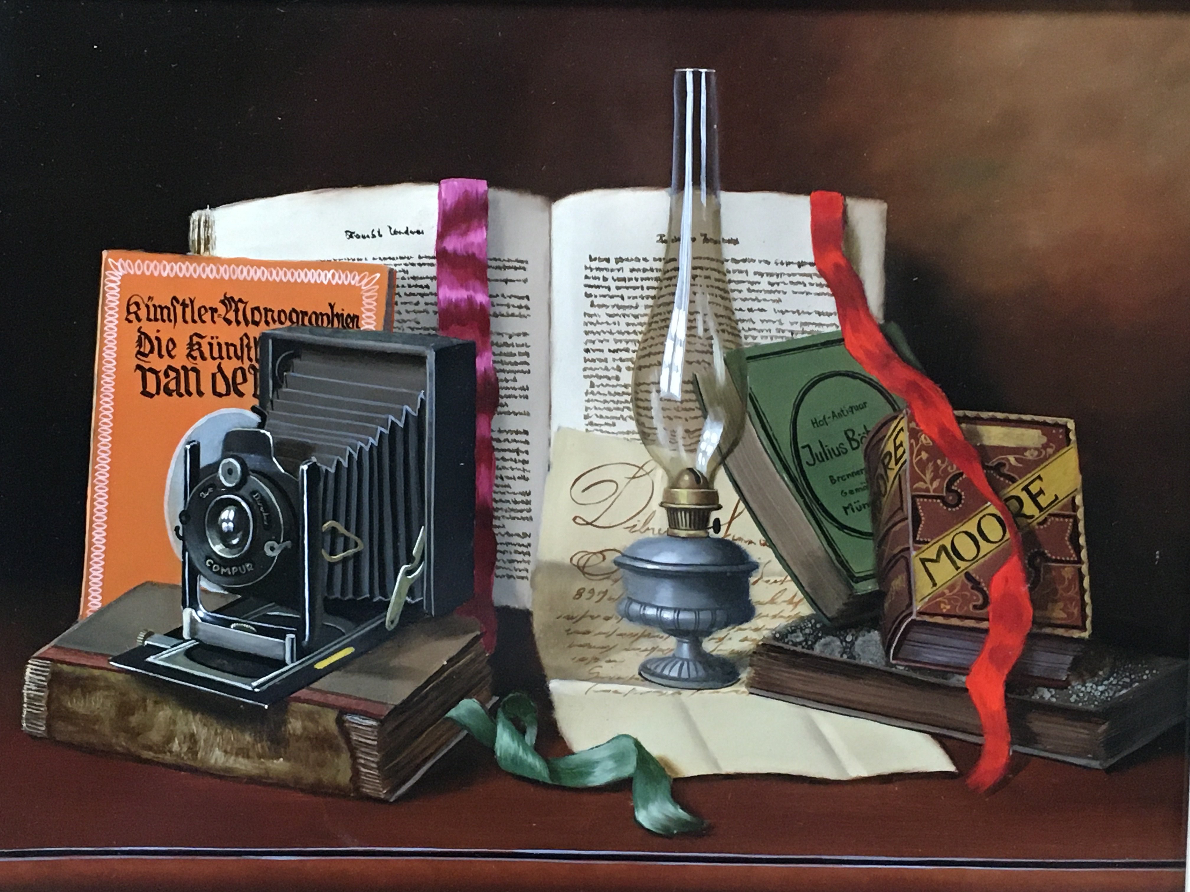 a 20th century gilt framed still life oil painting by T.Gabris, depicting German related items. Frame dimensions 78x70cm