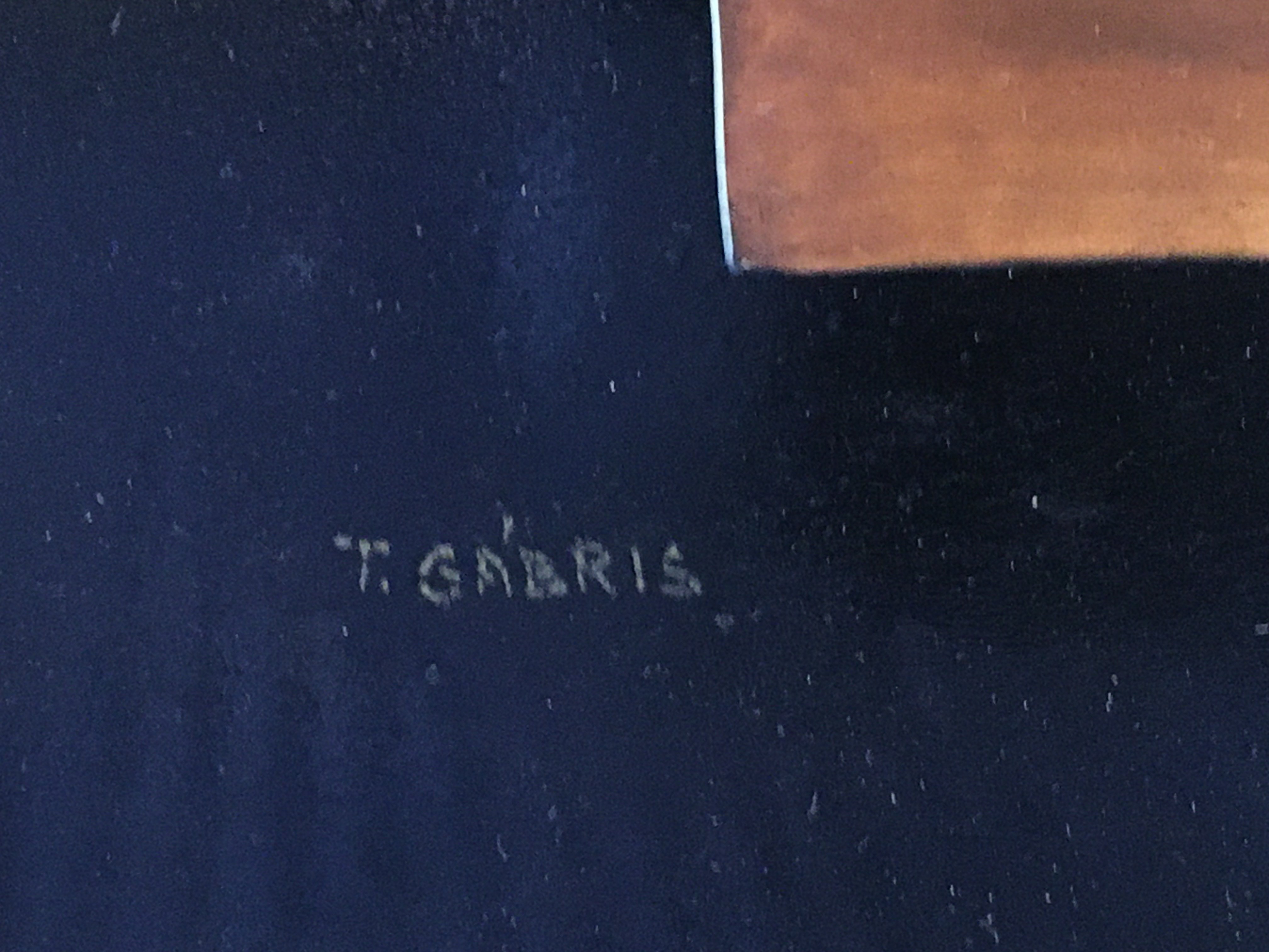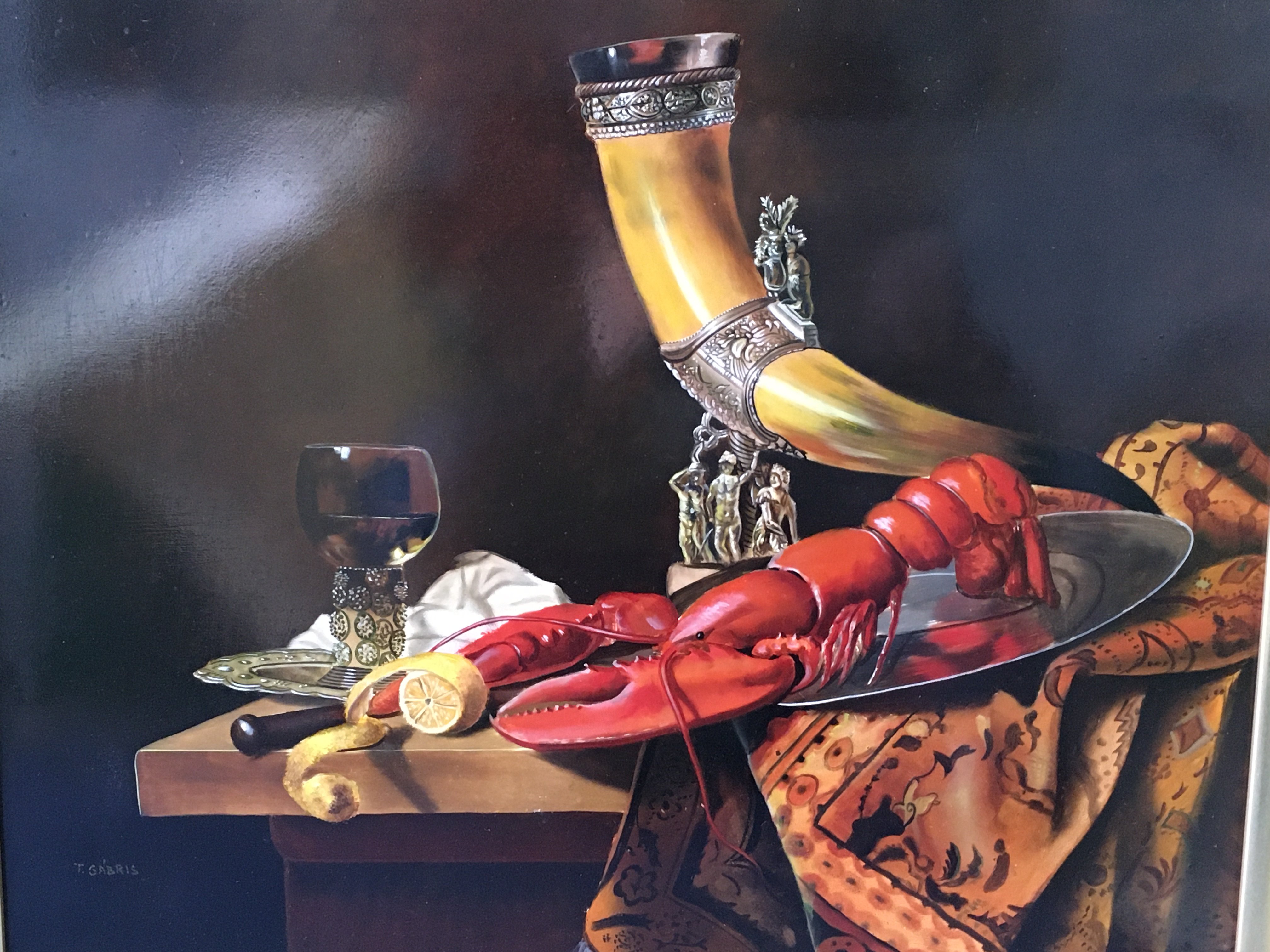 a 20th century gilt framed still life oil painting by T.Gabris, after 17th century Dutch artist W. Kalf Still life with lobster, drinking horn and glasses. Frame dimensions 78x68cm