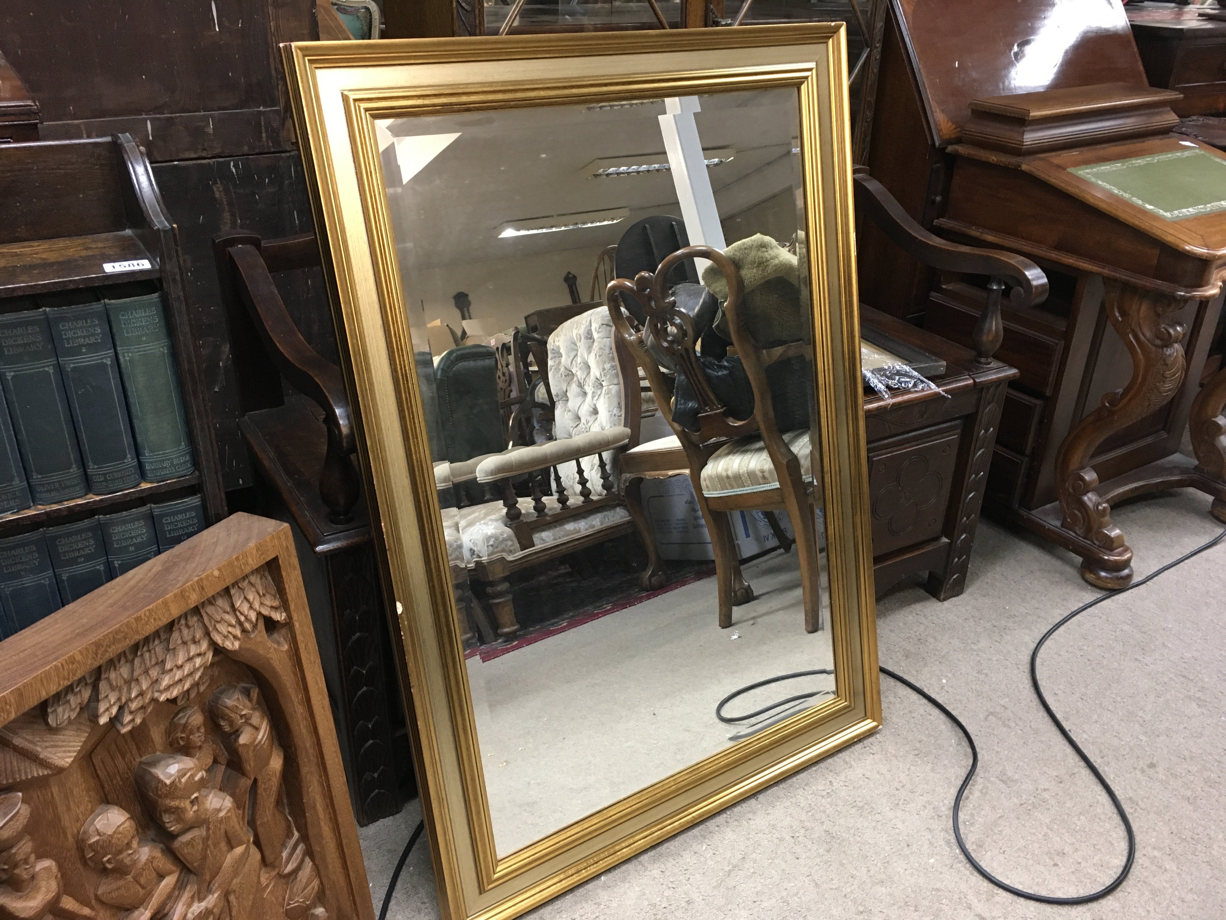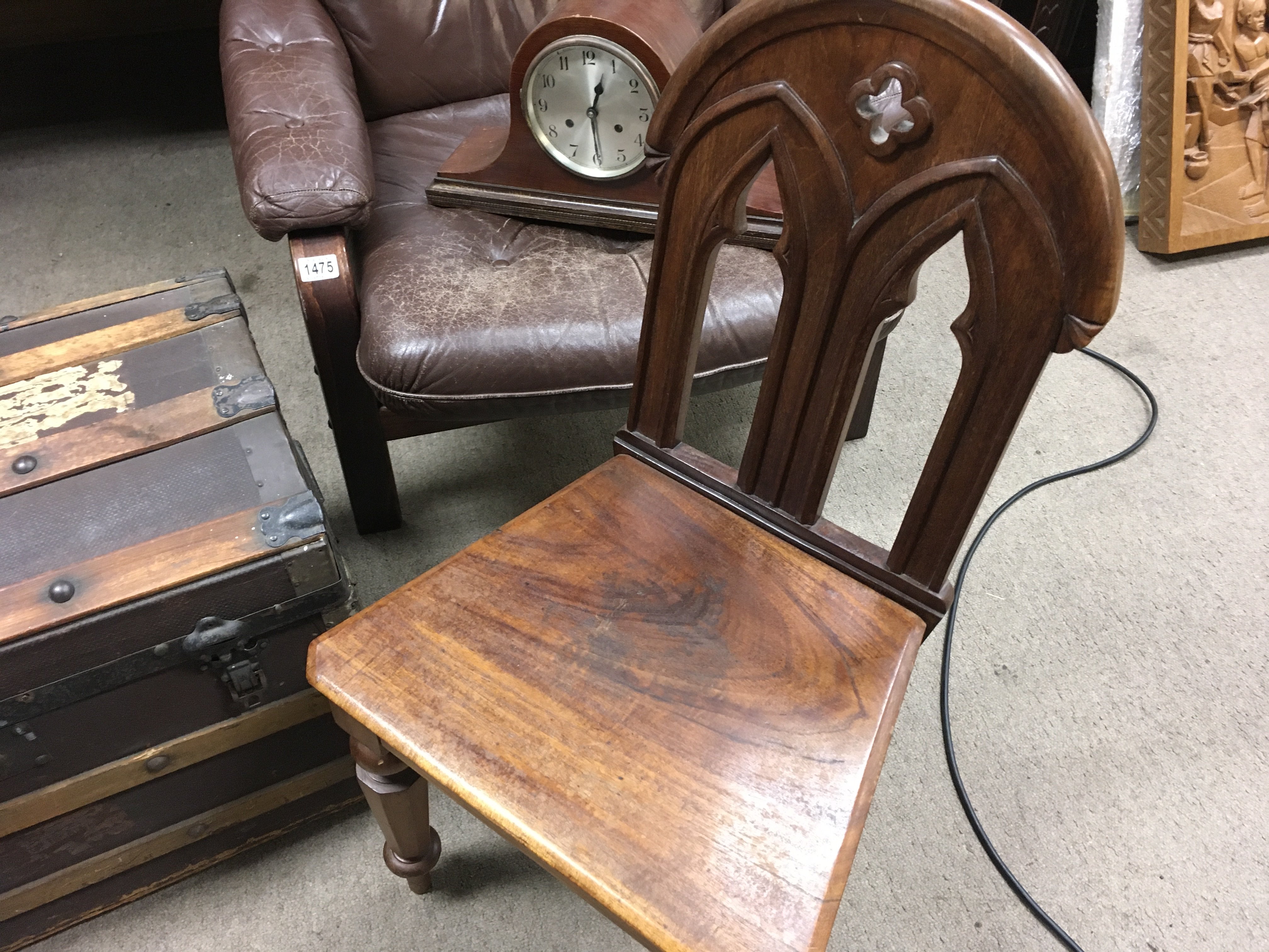 A Victorian hall chair , mirror (frame size dimensions 75x107cm), oak sewing work box table and a dome top trunk
