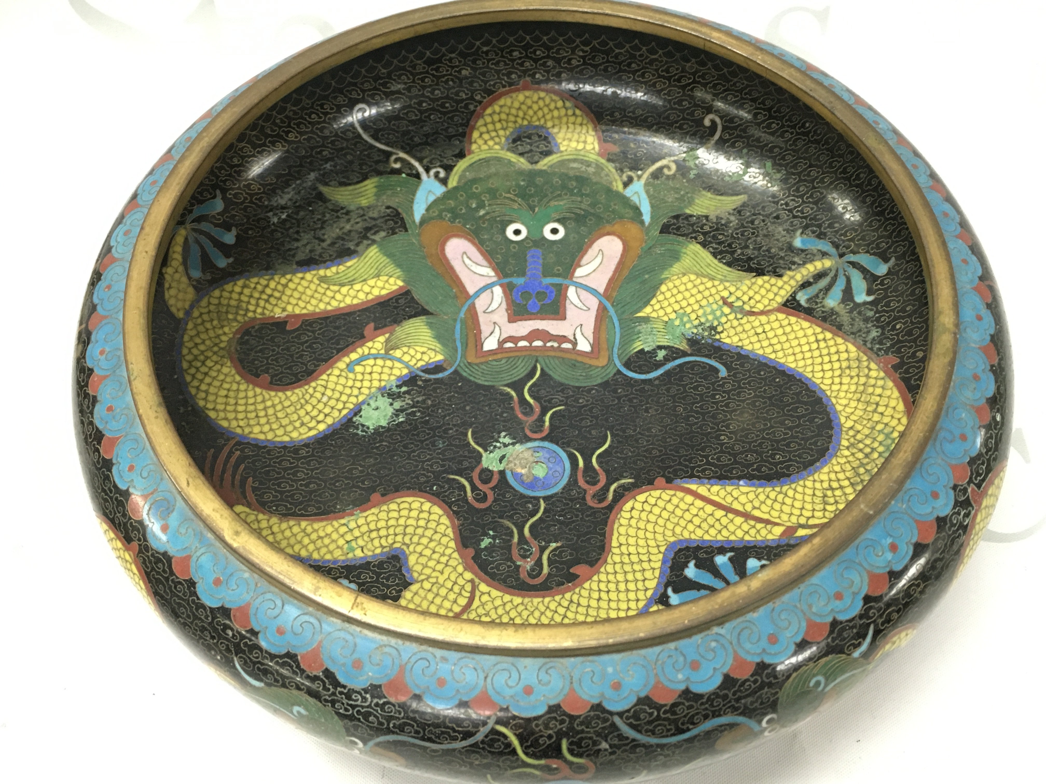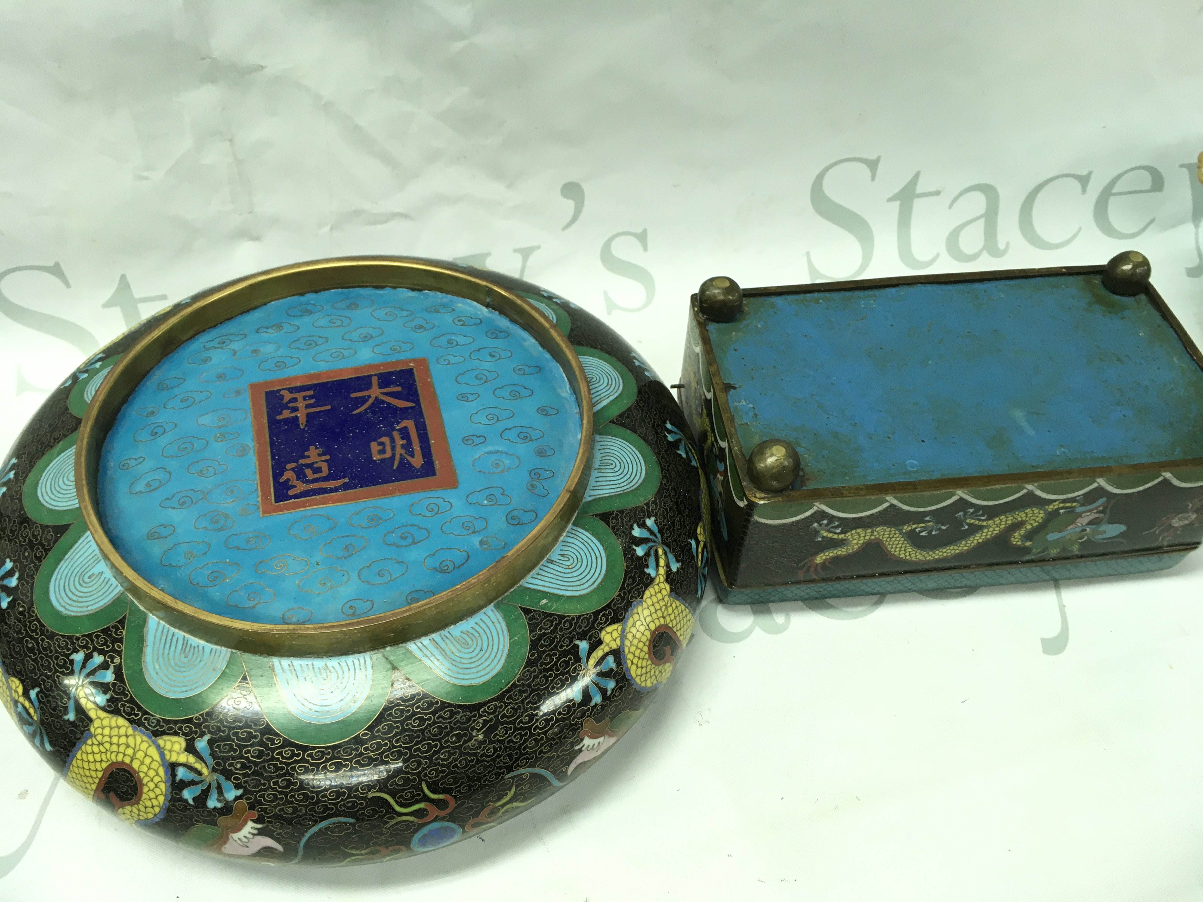 A Chinese Cloisonne Dragon box (17cm wide 8cm tall 9cm deep ) and dish, four character mark to base. (8cm tall 25cm wide). Postage category C